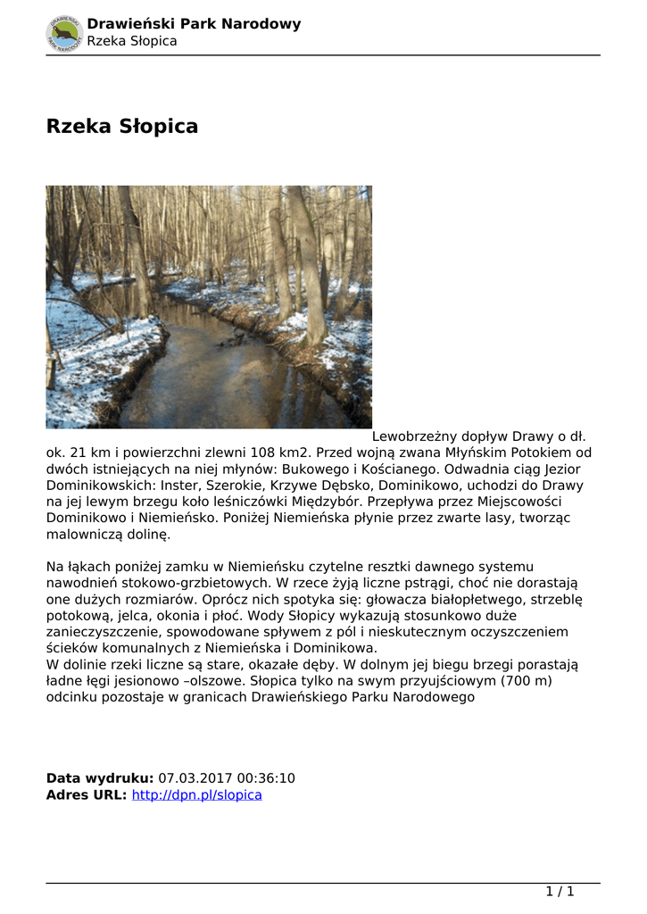 Drawieński Park Narodowy Rzeka Słopica Rzeka Słopica Lewobrzeżny dopływ Drawy o dł. ok. 21 km i powierzchni zlewni 108 km2. Przed wojną zwana Młyńskim Potokiem od dwóch istniejących na niej młynów: Bukowego i Kościanego. Odwadnia ciąg Jezior Dominikowskich: Inster, Szerokie, Krzywe Dębsko, Dominikowo, uchodzi do Drawy na jej lewym brzegu koło leśniczówki Międzybór. Przepływa przez Miejscowości Dominikowo i Niemieńsko. Poniżej Niemieńska płynie przez zwarte lasy, tworząc malowniczą dolinę. Na łąkach poniżej zamku w Niemieńsku czytelne resztki dawnego systemu nawodnień stokowo-grzbietowych. W rzece żyją liczne pstrągi, choć nie dorastają one dużych rozmiarów. Oprócz nich spotyka się: głowacza białopłetwego, strzeblę potokową, jelca, okonia i płoć. Wody Słopicy wykazują stosunkowo duże zanieczyszczenie, spowodowane spływem z pól i nieskutecznym oczyszczeniem ścieków komunalnych z Niemieńska i Dominikowa. W dolinie rzeki liczne są stare, okazałe dęby. W dolnym jej biegu brzegi porastają ładne łęgi jesionowo –olszowe. Słopica tylko na swym przyujściowym (700 m) odcinku pozostaje w granicach Drawieńskiego Parku Narodowego Data wydruku: 07.03.2017 00:36:10 Adres URL: http://dpn.pl/slopica 1/1 Powered by TCPDF (www.tcpdf.org)