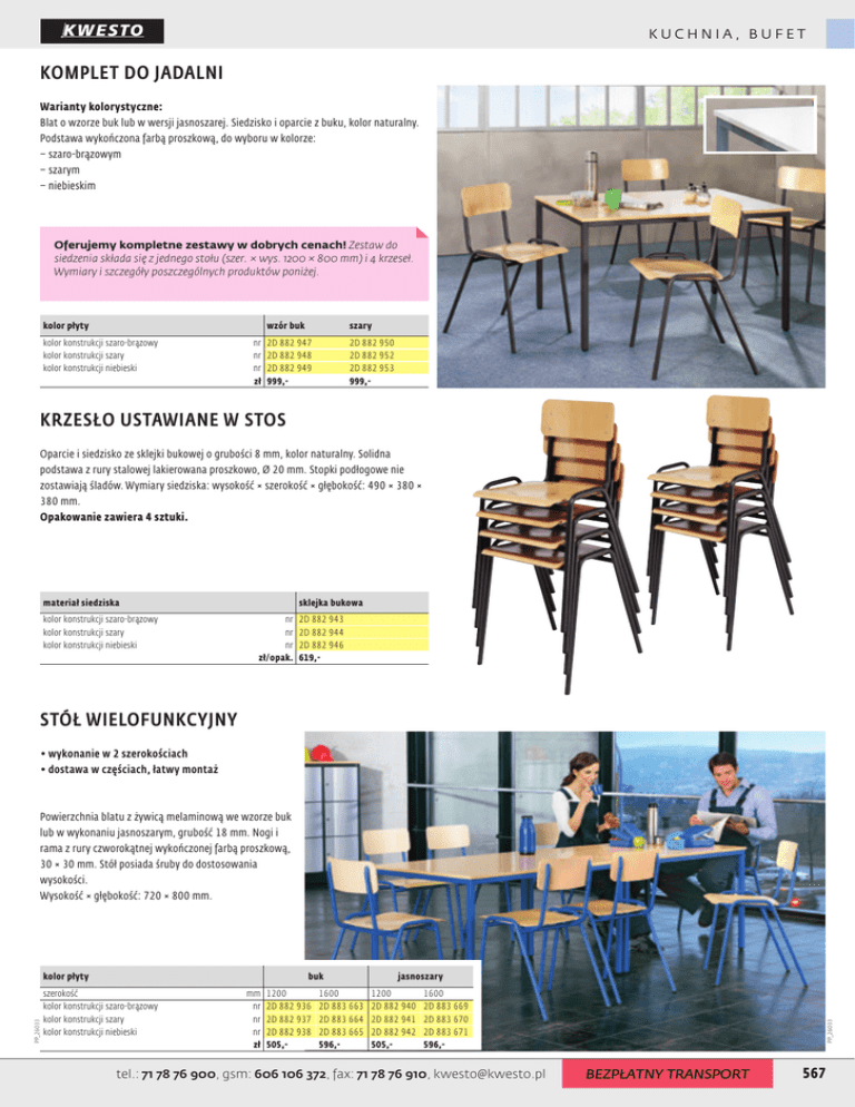 KUCHNIA, BUFET KOMPLET DO JADALNI Warianty kolorystyczne: Blat o wzorze buk lub w wersji jasnoszarej. Siedzisko i oparcie z buku, kolor naturalny. Podstawa wykończona farbą proszkową, do wyboru w kolorze: – szaro-brązowym – szarym – niebieskim Oferujemy kompletne zestawy w dobrych cenach! Zestaw do siedzenia składa się z jednego stołu (szer. × wys. 1200 × 800 mm) i 4 krzeseł. Wymiary i szczegóły poszczególnych produktów poniżej. kolor płyty kolor konstrukcji szaro-brązowy kolor konstrukcji szary kolor konstrukcji niebieski nr nr nr zł wzór buk szary 2D 882 947 2D 882 948 2D 882 949 999,- 2D 882 950 2D 882 952 2D 882 953 999,- KRZESŁO USTAWIANE W STOS Oparcie i siedzisko ze sklejki bukowej o grubości 8 mm, kolor naturalny. Solidna podstawa z rury stalowej lakierowana proszkowo, Ø 20 mm. Stopki podłogowe nie zostawiają śladów. Wymiary siedziska: wysokość × szerokość × głębokość: 490 × 380 × 380 mm. Opakowanie zawiera 4 sztuki. materiał siedziska kolor konstrukcji szaro-brązowy kolor konstrukcji szary kolor konstrukcji niebieski sklejka bukowa nr nr nr zł/opak. 2D 882 943 2D 882 944 2D 882 946 619,- STÓŁ WIELOFUNKCYJNY •wykonanie w 2 szerokościach •dostawa w częściach, łatwy montaż Powierzchnia blatu z żywicą melaminową we wzorze buk lub w wykonaniu jasnoszarym, grubość 18 mm. Nogi i rama z rury czworokątnej wykończonej farbą proszkową, 30 × 30 mm. Stół posiada śruby do dostosowania wysokości. Wysokość × głębokość: 720 × 800 mm. buk szerokość kolor konstrukcji szaro-brązowy kolor konstrukcji szary kolor konstrukcji niebieski mm nr nr nr zł 1200 2D 882 936 2D 882 937 2D 882 938 505,- 1600 2D 883 663 2D 883 664 2D 883 665 596,- jasnoszary 1200 2D 882 940 2D 882 941 2D 882 942 505,- 1600 2D 883 669 2D 883 670 2D 883 671 596,- tel.: 71 78 76 900, gsm: 606 106 372, fax: 71 78 76 910, [email protected] PP_26033 PP_26033 kolor płyty BEZPŁATNY TRANSPORT 567