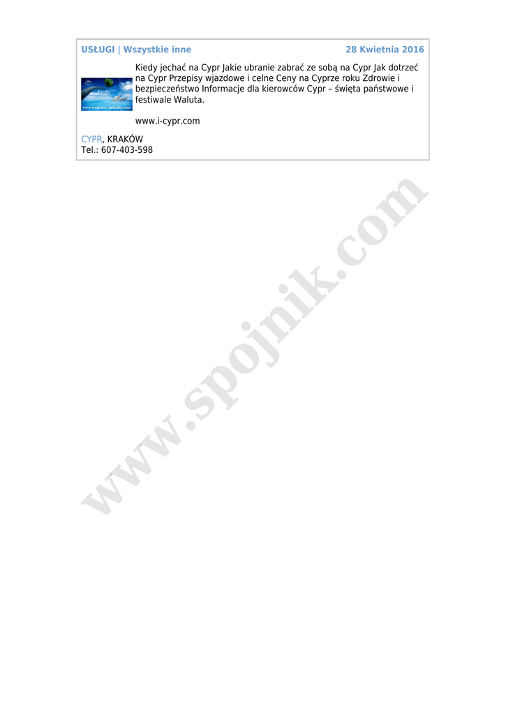 USŁUGI | Wszystkie inne 28 Kwietnia 2016 Kiedy jechać na Cypr Jakie ubranie zabrać ze sobą na Cypr Jak dotrzeć na Cypr Przepisy wjazdowe i celne Ceny na Cyprze roku Zdrowie i bezpieczeństwo Informacje dla kierowców Cypr – święta państwowe i festiwale Waluta. www.i-cypr.com w w w .s po jn ik .c o m CYPR, KRAKÓW Tel.: 607-403-598