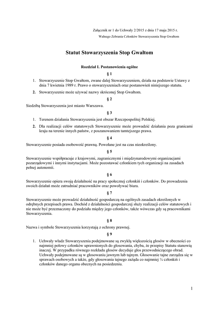 Załącznik nr 1 do Uchwały 2/2015 z dnia 17 maja 2015 r. Walnego Zebrania Członków Stowarzyszenia Stop Gwałtom Statut Stowarzyszenia Stop Gwałtom Rozdział I. Postanowienia ogólne §1 1. Stowarzyszenie Stop Gwałtom, zwane dalej Stowarzyszeniem, działa na podstawie Ustawy z dnia 7 kwietnia 1989 r. Prawo o stowarzyszeniach oraz postanowień niniejszego statutu. 2. Stowarzyszenie może używać nazwy skróconej Stop Gwałtom. §2 Siedzibą Stowarzyszenia jest miasto Warszawa. §3 1. Terenem działania Stowarzyszenia jest obszar Rzeczpospolitej Polskiej. 2. Dla realizacji celów statutowych Stowarzyszenie może prowadzić działania poza granicami kraju na terenie innych państw, z poszanowaniem tamtejszego prawa. §4 Stowarzyszenie posiada osobowość prawną. Powołane jest na czas nieokreślony. §5 Stowarzyszenie współpracuje z krajowymi, zagranicznymi i międzynarodowymi organizacjami pozarządowymi i innymi instytucjami. Może pozostawać członkiem tych organizacji na zasadach pełnej autonomii. §6 Stowarzyszenie opiera swoją działalność na pracy społecznej członkiń i członków. Do prowadzenia swoich działań może zatrudniać pracowników oraz powoływać biura. §7 Stowarzyszenie może prowadzić działalność gospodarczą na ogólnych zasadach określonych w odrębnych przepisach prawa. Dochód z działalności gospodarczej służy realizacji celów statutowych i nie może być przeznaczony do podziału między jego członków, także wówczas gdy są pracownikami Stowarzyszenia. §8 Nazwa i symbole Stowarzyszenia korzystają z ochrony prawnej. §9 1. Uchwały władz Stowarzyszenia podejmowane są zwykłą większością głosów w obecności co najmniej połowy członków uprawnionych do głosowania, chyba, że przepisy Statutu stanowią inaczej. W przypadku równego rozkładu głosów decyduje głos przewodniczącego obrad. Uchwały podejmowane są w głosowaniu jawnym lub tajnym. Głosowanie tajne zarządza się w sprawach osobowych a także, gdy głosowania tajnego zażąda co najmniej ¼ członkiń i członków danego organu obecnych na posiedzeniu. 1 2. W przypadku, gdy uchwała nie może zostać podjęta z powodu nieobecności co najmniej połowy uprawnionych do głosowania, możliwe jest przeprowadzenie posiedzenia w drugim terminie, na którym do jej podjęcia wymagana jest obecność co najmniej 1/3 uprawnionych do głosowania. Do ważności posiedzenia w drugim terminie niezbędne jest jego zwołanie wraz z posiedzeniem w pierwszym terminie oraz wspólne zawiadomienie. Zakończenie posiedzenia w pierwszym terminie i rozpoczęcia obrad w drugim stwierdza przewodniczący obrad. W drugim terminie nie można dokonywać wyborów władz ani ich odwołania. W przypadku, gdy pierwsze posiedzenie organów Stowarzyszenia odbyło się w obecności co najmniej połowy uprawnionych do głosowania, zebrania zwołanego w kolejnym terminie nie przeprowadza się. Drugiego terminu nie stosuje się w pracy Komisji Rewizyjnej. 3. Uchwały władz stowarzyszenia mogą być podejmowane z wykorzystaniem środków elektronicznych w formie obiegowej z wyłączeniem uchwał dotyczących wyborów do władz stowarzyszenia oraz udzielania absolutorium Zarządowi. § 10 1. Wybory do władz Stowarzyszenia odbywają się w głosowaniu tajnym zwykłą większością głosów w obecności co najmniej połowy członkiń i członków uprawnionych do uczestnictwa w wyborach. 2. Wybory Przewodniczącego/Przewodniczącej Stowarzyszenia, dokonywane są bezwzględną większością głosów. § 11 Członkinie i członkowie władz Stowarzyszenia mogą być odwołani przez organ, który dokonał ich wyboru. Wniosek o odwołanie może być zgłoszony przez co najmniej 1/3 statutowego składu organu lub przez jego przewodniczącego. Odwołanie członkiń i członków władz następuje w głosowaniu tajnym bezwzględną większością głosów, w obecności co najmniej połowy uprawnionych, z tym że odwołanie Przewodniczącego Stowarzyszenia, następuje równocześnie z powołaniem nowego przewodniczącego większością 2/3 głosów w obecności co najmniej połowy uprawnionych. § 12 Kadencja władz Stowarzyszenia trwa od dnia wyboru do dnia wyboru władz następnej kadencji. Rozdział II. Cele i sposoby ich realizacji § 13 1. Naczelnym celem Stowarzyszenia jest wspieranie procesów społecznych zmierzających do eliminacji z naszej kultury i świadomości społecznej przyzwolenia dla gwałtu i przemocy seksualnej, fizycznej i psychicznej a także pomoc osobom poszkodowanym oraz ich rodzinom. 2. Celami szczegółowymi są: a. szkolenie i prowadzenie warsztatów wskazujących na źródła przemocy i akceptacji dla niej, wspomagających odrzucenie stereotypów oraz eliminowanie postaw i zachowań prowadzących do stosowania przemocy oraz do gwałtów – ze szczególnym naciskiem na myślenie i zachowanie potencjalnych sprawców, b. organizowanie akcji społecznych i medialnych docierających do szerokiego grona odbiorców, oddziałujących na świadomość społeczną, obnażających postawy przemocowe i dyskryminujące oraz wspierających zrozumienie konieczności uszanowania równości wszystkich ludzi, c. organizowanie konferencji, seminariów i innego rodzaju spotkań służących wymianie wiedzy, upowszechniających osiągnięcia nauki i praktyczne doświadczenia w zakresie zapobiegania i przeciwdziałania przemocy, 2 d. organizowanie doraźnej pomocy w zakresie wsparcia terapeutycznego, psychologicznego lub porad prawnych. § 14 Stowarzyszenie realizuje swoje cele poprzez: 1. współdziałanie z samorządowymi i państwowymi jednostkami organizacyjnymi oraz organizacjami społecznymi zajmującymi się walką z przemocą, 2. współpracę z organizacjami naukowymi zajmującymi się walką z przemocą lub badających zjawiska związane z przemocą i gwałtem, 3. wspieranie inicjatyw na rzecz walki z przemocą, 4. prowadzenie działalności wydawniczej tematycznie związanej z celami stow