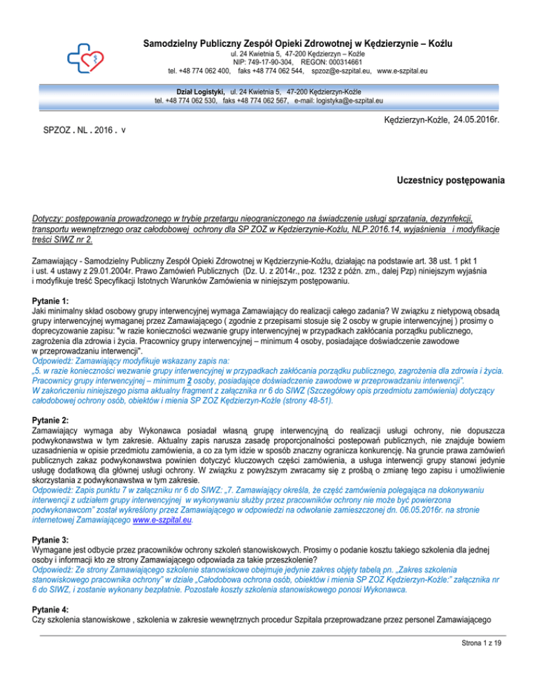 Samodzielny Publiczny Zespół Opieki Zdrowotnej w Kędzierzynie – Koźlu ul. 24 Kwietnia 5, 47-200 Kędzierzyn – Koźle NIP: 749-17-90-304, REGON: 000314661 tel. +48 774 062 400, faks +48 774 062 544, [email protected], www.e-szpital.eu Dział Logistyki, ul. 24 Kwietnia 5, 47-200 Kędzierzyn-Koźle tel. +48 774 062 530, faks +48 774 062 567, e-mail: [email protected] SPZOZ . NL . 2016 . v Kędzierzyn-Koźle, 24.05.2016r. Uczestnicy postępowania Dotyczy: postępowania prowadzonego w trybie przetargu nieograniczonego na świadczenie usługi sprzątania, dezynfekcji, transportu wewnętrznego oraz całodobowej ochrony dla SP ZOZ w Kędzierzynie-Koźlu, NLP.2016.14, wyjaśnienia i modyfikacje treści SIWZ nr 2. Zamawiający - Samodzielny Publiczny Zespół Opieki Zdrowotnej w Kędzierzynie-Koźlu, działając na podstawie art. 38 ust. 1 pkt 1 i ust. 4 ustawy z 29.01.2004r. Prawo Zamówień Publicznych (Dz. U. z 2014r., poz. 1232 z późn. zm., dalej Pzp) niniejszym wyjaśnia i modyfikuje treść Specyfikacji Istotnych Warunków Zamówienia w niniejszym postępowaniu. Pytanie 1: Jaki minimalny skład osobowy grupy interwencyjnej wymaga Zamawiający do realizacji całego zadania? W związku z nietypową obsadą grupy interwencyjnej wymaganej przez Zamawiającego ( zgodnie z przepisami stosuje się 2 osoby w grupie interwencyjnej ) prosimy o doprecyzowanie zapisu: "w razie konieczności wezwanie grupy interwencyjnej w przypadkach zakłócania porządku publicznego, zagrożenia dla zdrowia i życia. Pracownicy grupy interwencyjnej – minimum 4 osoby, posiadające doświadczenie zawodowe w przeprowadzaniu interwencji". Odpowiedź: Zamawiający modyfikuje wskazany zapis na: „5. w razie konieczności wezwanie grupy interwencyjnej w przypadkach zakłócania porządku publicznego, zagrożenia dla zdrowia i życia. Pracownicy grupy interwencyjnej – minimum 2 osoby, posiadające doświadczenie zawodowe w przeprowadzaniu interwencji”. W zakończeniu niniejszego pisma aktualny fragment z załącznika nr 6 do SIWZ (Szczegółowy opis przedmiotu zamówienia) dotyczący całodobowej ochrony osób, obiektów i mienia SP ZOZ Kędzierzyn-Koźle (strony 48-51). Pytanie 2: Zamawiający wymaga aby Wykonawca posiadał własną grupę interwencyjną do realizacji usługi ochrony, nie dopuszcza podwykonawstwa w tym zakresie. Aktualny zapis narusza zasadę proporcjonalności postepowań publicznych, nie znajduje bowiem uzasadnienia w opisie przedmiotu zamówienia, a co za tym idzie w sposób znaczny ogranicza konkurencję. Na gruncie prawa zamówień publicznych zakaz podwykonawstwa powinien dotyczyć kluczowych części zamówienia, a usługa interwencji grupy stanowi jedynie usługę dodatkową dla głównej usługi ochrony. W związku z powyższym zwracamy się z prośbą o zmianę tego zapisu i umożliwienie skorzystania z podwykonawstwa w tym zakresie. Odpowiedź: Zapis punktu 7 w załączniku nr 6 do SIWZ: „7. Zamawiający określa, że część zamówienia polegająca na dokonywaniu interwencji z udziałem grupy interwencyjnej w wykonywaniu służby przez pracowników ochrony nie może być powierzona podwykonawcom” został wykreślony przez Zamawiającego w odpowiedzi na odwołanie zamieszczonej dn. 06.05.2016r. na stronie internetowej Zamawiającego www.e-szpital.eu. Pytanie 3: Wymagane jest odbycie przez pracowników ochrony szkoleń stanowiskowych. Prosimy o podanie kosztu takiego szkolenia dla jednej osoby i informacji kto ze strony Zamawiającego odpowiada za takie przeszkolenie? Odpowiedź: Ze strony Zamawiającego szkolenie stanowiskowe obejmuje jedynie zakres objęty tabelą pn. „Zakres szkolenia stanowiskowego pracownika ochrony” w dziale „Całodobowa ochrona osób, obiektów i mienia SP ZOZ Kędzierzyn-Koźle:” załącznika nr 6 do SIWZ, i zostanie wykonany bezpłatnie. Pozostałe koszty szkolenia stanowiskowego ponosi Wykonawca. Pytanie 4: Czy szkolenia stanowiskowe , szkolenia w zakresie wewnętrznych procedur Szpitala przeprowadzane przez personel Zamawiającego Strona 1 z 19 będą odpłatne. Jeśli tak proszę podać ich koszt. Odpowiedź: jak wyżej. Pytanie 5: Co Zamawiający rozumie przez stwierdzenie: „b) obsługa instalacji antywłamaniowej, p.poż oraz sprawdzanie zamknięcia okien i drzwi wejściowych po opuszczeniu przez pracowników w n/w obiektów: - budynek administracji SP ZOZ przy ul 24 Kwietnia 5, - budynek działu rozliczeń, analiz i controllingu przy ul. Roosevelta 2, - budynek Przychodni Przyszpitalnej przy ul. 24 Kwietnia 7 i ul. Roosevelta 2 /w tym Magazyn Centralny/.” Czy chodzi o monitorowanie sygnałów (obserwacje nadajnika optyczno-dźwiękowego zainstalowanego w pomieszczeniu ochrony, czyli na posterunku zlokalizowanym na niskim parterze przy Szpitalnym Oddziale Ratunkowym i Izbie Przyjęć) z instalacji alarmowych z w/w budynków? Sprawdzenie zamknięcia okien i drzwi wejściowych w wyszczególnionych obiektach ma odbywać się na zasadzie optycznego sprawdzenia okien od zewnątrz oraz ręcznego sprawdzenia zamknięcia drzwi zewnętrznych Sygnalizatory usytuowane na zewnętrznych ścianach w/w obiektów nie są podłączone do ogólnej instalacji powiadamiania, ich działanie dźwiękowe i świetlne jest słyszalne i widzialne z zewnątrz budynku szpitala. Po usłyszeniu sygnału alarmowego pracownik ochrony dokonuje sprawdzenie zdarzenia oraz podejmuje decyzję o przyjeździe grupy interwencyjnej lub w przypadku włamania, również Policji. Pytanie 6: Co Zamawiający rozumie przez stwierdzenie: „Ponadto w razie konieczności ochrona (m.in. zapewnienie grupy interwencyjnej) i zabezpieczenie, mienia i osób przebywających w w/w obiektach lub w ich obrębie oraz w: - budynku szpitala dziecięcego przy ul. 24 Kwietnia 13, - budynku szpitala przy ul. Judyma 4.” Kto będzie wzywał grupy interwencyjne? Kto będzie weryfikował zasadność wezwania grupy? W jakich przypadkach będzie wzywana grupa? Odpowiedź: W przypadku zauważenia przez 
