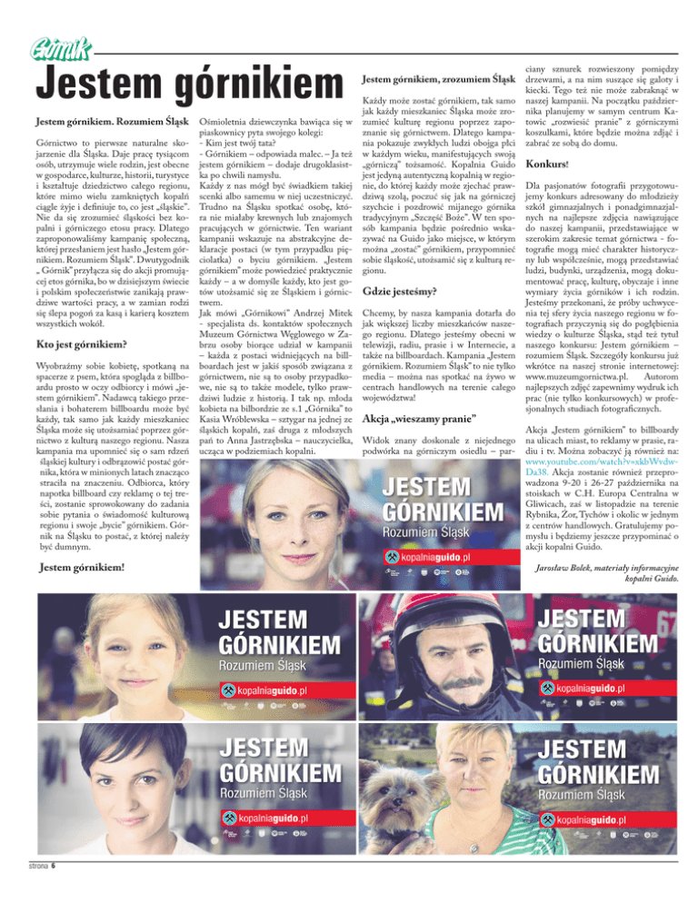 Jestem górnikiem Jestem górnikiem. Rozumiem Śląsk Górnictwo to pierwsze naturalne skojarzenie dla Śląska. Daje pracę tysiącom osób, utrzymuje wiele rodzin, jest obecne w gospodarce, kulturze, historii, turystyce i kształtuje dziedzictwo całego regionu, które mimo wielu zamkniętych kopalń ciągle żyje i definiuje to, co jest „śląskie”. Nie da się zrozumieć śląskości bez kopalni i górniczego etosu pracy. Dlatego zaproponowaliśmy kampanię społeczną, której przesłaniem jest hasło „Jestem górnikiem. Rozumiem Śląsk”. Dwutygodnik „ Górnik” przyłącza się do akcji promującej etos górnika, bo w dzisiejszym świecie i polskim społeczeństwie zanikają prawdziwe wartości pracy, a w zamian rodzi się ślepa pogoń za kasą i karierą kosztem wszystkich wokół. Kto jest górnikiem? Wyobraźmy sobie kobietę, spotkaną na spacerze z psem, która spogląda z billboardu prosto w oczy odbiorcy i mówi „jestem górnikiem”. Nadawcą takiego przesłania i bohaterem billboardu może być każdy, tak samo jak każdy mieszkaniec Śląska może się utożsamiać poprzez górnictwo z kulturą naszego regionu. Nasza kampania ma upomnieć się o sam rdzeń śląskiej kultury i odbrązowić postać górnika, która w minionych latach znacząco straciła na znaczeniu. Odbiorca, który napotka billboard czy reklamę o tej treści, zostanie sprowokowany do zadania sobie pytania o świadomość kulturową regionu i swoje „bycie” górnikiem. Górnik na Śląsku to postać, z której należy być dumnym. Jestem górnikiem! strona 6 Ośmioletnia dziewczynka bawiąca się w piaskownicy pyta swojego kolegi: - Kim jest twój tata? - Górnikiem – odpowiada malec. – Ja też jestem górnikiem – dodaje drugoklasistka po chwili namysłu. Każdy z nas mógł być świadkiem takiej scenki albo samemu w niej uczestniczyć. Trudno na Śląsku spotkać osobę, która nie miałaby krewnych lub znajomych pracujących w górnictwie. Ten wariant kampanii wskazuje na abstrakcyjne deklaracje postaci (w tym przypadku pięciolatka) o byciu górnikiem. „Jestem górnikiem” może powiedzieć praktycznie każdy – a w domyśle każdy, kto jest gotów utożsamić się ze Śląskiem i górnictwem. Jak mówi „Górnikowi” Andrzej Mitek - specjalista ds. kontaktów społecznych Muzeum Górnictwa Węglowego w Zabrzu osoby biorące udział w kampanii – każda z postaci widniejących na billboardach jest w jakiś sposób związana z górnictwem, nie są to osoby przypadkowe, nie są to także modele, tylko prawdziwi ludzie z historią. I tak np. młoda kobieta na bilbordzie ze s.1 „Górnika” to Kasia Wróblewska – sztygar na jednej ze śląskich kopalń, zaś druga z młodszych pań to Anna Jastrzębska – nauczycielka, ucząca w podziemiach kopalni. ciany sznurek rozwieszony pomiędzy Jestem górnikiem, zrozumiem Śląsk drzewami, a na nim suszące się galoty i Każdy może zostać górnikiem, tak samo jak każdy mieszkaniec Śląska może zrozumieć kulturę regionu poprzez zapoznanie się górnictwem. Dlatego kampania pokazuje zwykłych ludzi obojga płci w każdym wieku, manifestujących swoją „górniczą” tożsamość. Kopalnia Guido jest jedyną autentyczną kopalnią w regionie, do której każdy może zjechać prawdziwą szolą, poczuć się jak na górniczej szychcie i pozdrowić mijanego górnika tradycyjnym „Szczęść Boże”. W ten sposób kampania będzie pośrednio wskazywać na Guido jako miejsce, w którym można „zostać” górnikiem, przypomnieć sobie śląskość, utożsamić się z kulturą regionu. Gdzie jesteśmy? Chcemy, by nasza kampania dotarła do jak większej liczby mieszkańców naszego regionu. Dlatego jesteśmy obecni w telewizji, radiu, prasie i w Internecie, a także na billboardach. Kampania „Jestem górnikiem. Rozumiem Śląsk” to nie tylko media – można nas spotkać na żywo w centrach handlowych na terenie całego województwa! Akcja „wieszamy pranie” Widok znany doskonale z niejednego podwórka na górniczym osiedlu – par- kiecki. Tego też nie może zabraknąć w naszej kampanii. Na początku października planujemy w samym centrum Katowic „rozwiesić pranie” z górniczymi koszulkami, które będzie można zdjąć i zabrać ze sobą do domu. Konkurs! Dla pasjonatów fotografii przygotowujemy konkurs adresowany do młodzieży szkół gimnazjalnych i ponadgimnazjalnych na najlepsze zdjęcia nawiązujące do naszej kampanii, przedstawiające w szerokim zakresie temat górnictwa - fotografie mogą mieć charakter historyczny lub współcześnie, mogą przedstawiać ludzi, budynki, urządzenia, mogą dokumentować pracę, kulturę, obyczaje i inne wymiary życia górników i ich rodzin. Jesteśmy przekonani, że próby uchwycenia tej sfery życia naszego regionu w fotografiach przyczynią się do pogłębienia wiedzy o kulturze Śląska, stąd też tytuł naszego konkursu: Jestem górnikiem – rozumiem Śląsk. Szczegóły konkursu już wkrótce na naszej stronie internetowej: www.muzeumgornictwa.pl. Autorom najlepszych zdjęć zapewnimy wydruk ich prac (nie tylko konkursowych) w profesjonalnych studiach fotograficznych. Akcja „Jestem górnikiem” to billboardy na ulicach miast, to reklamy w prasie, radiu i tv. Można zobaczyć ją również na: www.youtube.com/watch?v=xkbWvdwDa38. Akcja zostanie również przeprowadzona 9-20 i 26-27 października na stoiskach w C.H. Europa Centralna w Gliwicach, zaś w listopadzie na terenie Rybnika, Żor, Tychów i okolic w jednym z centrów handlowych. Gratulujemy pomysłu i będziemy jeszcze przypominać o akcji kopalni Guido. Jarosław Bolek, materiały informacyjne kopalni Guido.