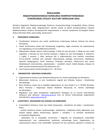 REGULAMIN MIĘDZYNARODOWEGO KONKURSU KOMPOZYTORSKIEGO EUROPEJSKIEJ STOLICY KULTURY WROCŁAW 2016 Niniejszy Regulamin Międzynarodowego Konkursu Kompozytorskiego Europejskiej Stolicy Kultury Wrocław 2016 zwany dalej „Regulaminem” określa zasady na jakich przeprowadzony zostanie Międzynarodowy Konkurs Kompozytorski organizowany w ramach wydarzenia Europejska Stolica Kultury Wrocław 2016, zwany dalej „Konkursem”. 1. PRZEDMIOT KONKURSU 1. Przedmiotem Konkursu jest utwór symfoniczny inspirowany kulturą, historią lub naturą Wrocławia. 2. Utwór konkursowy winien być kompozycją oryginalną, nigdy wcześniej nie wykonywaną, nie nagradzaną, ani nie publikowaną drukiem. 3. Maksymalna obsada utworu konkursowego: 3 flety (w tym piccolo), 3 oboje (w tym rożek angielski), 3 klarnety (w tym klarnet basowy), 3 fagoty (w tym kontrafagot), 4 waltornie, 3 trąbki, 3 puzony, 1 tuba, perkusja (do 6 wykonawców) oraz kwintet smyczkowy (12.12.10.8.6); możliwe jest ponadto wykorzystanie jednego instrumentu dodatkowo spośród następujących: harfa, klawesyn, fortepian, akordeon. Wykluczone jest użycie dodatkowych instrumentów, wykonawców i wszelkich innych źródeł dźwięku, dotyczy to także warstw komputerowych/ live electronics etc. 4. Czas trwania utworu konkursowego to 15 – 20 minut. 2. ORANIZATOR i MECENAS KONKURSU 1. Organizatorem Konkursu jest Akademia Muzyczna im. Karola Lipińskiego we Wrocławiu. 2. Mecenasem Konkursu, w tym fundatorem nagród jest Minister Kultury i Dziedzictwa Narodowego. 3. Biuro Konkursu mieści się w siedzibie Organizatora: pl. Jana Pawła II nr 2, 50-043 Wrocław, Biuro Promocji i Organizacji Imprez Akademii Muzycznej im. Karola Lipińskiego we Wrocławiu. 4. Regulamin oraz dane kontaktowe Organizatora dostępne są na stronie internetowej Konkursu pod adresem: mkk.amuz.wroc.pl oraz na stronie internetowej Organizatora pod adresem: www.amuz.wroc.pl 3. UCZESTNICY. ZGŁOSZENIE DO UDZIAŁU W KONKURSIE 1. Uczestnikiem Konkursu może być każdy kompozytor, niezależnie od wieku i narodowości, który: - prześle partyturę utworu konkursowego, wypełnioną i podpisaną Kartę zgłoszenia oraz dowód wpłaty opłaty konkursowej, zgodnie z zasadami i w terminie określonym w niniejszym Regulaminie, - zobowiąże się w przypadku otrzymania I Nagrody do sporządzenia materiałów wykonawczych oraz upoważnienia podmiotu wskazanego przez Organizatora do wykorzystania utworu oraz materiałów nutowych (w tym partytury, głosów) w okresie do 1 jednego roku, licząc od dnia ogłoszenia wyników Konkursu, w celu prawykonania utworu konkursowego na polach eksploatacji określonych w Karcie zgłoszenia. 2. Zgłoszenie do udziału w Konkursie następuje poprzez przesłanie na adres Organizatora partytury, Karty zgłoszenia oraz dowodu wpłaty opłaty konkursowej, zgodnie z zasadami i w terminie określonym w niniejszym Regulaminie. 4. PARTYTURA UTWORU KONKURSOWEGO 1. Partytura winna zostać nadesłana anonimowo i oznaczona godłem. Do partytury dołączyć należy zamkniętą kopertę, oznaczoną tym samym godłem, zawierającą wypełnioną Kartę zgłoszenia według wzoru określonego w załączniku do niniejszego Regulaminu zawierającą następujące informacje i oświadczenia: 1) imię i nazwisko kompozytora, 2) data i miejsce urodzenia, 3) narodowość, 4) obywatelstwo, 5) adres, telefon, e-mail, 6) tytuł i czas trwania utworu, 7) krótka nota biograficzna i aktualne zdjęcie kompozytora, 8) oświadczenia dotyczące: - akceptacji postanowień Regulaminu, - dysponowania wszelkimi prawami do utworu oraz oświadczenie, że utwór jest oryginalny, nie był dotąd nigdy wykonywany, ani publikowany drukiem, - wyrażenia zgody na publikację wizerunku, w przypadku uzyskania jednej z nagród lub wyróżnienia konkursu, - w przypadku uzyskania I Nagrody nieodpłatnego udostępnienia wszelkich materiałów wykonawczych (głosy orkiestrowe i partytura) niezbędnych do prawykonania, ewentualnych dalszych wykonań utworu, - upoważnienia podmiotu wskazanego przez Organizatora do wykorzystania utworu oraz materiałów nutowych, w tym partytury i materiałów wykonawczych, w zakresie określonym w Karcie zgłoszenia, - dobrowolnego podania danych osobowych i wyrażenia zgody na ich przetwarzanie przez Organizatora w celach związanych z organizacją Konkursu. 2. Obowiązuje pełna edycja komputerowa partytury. 3. Partytura winna być dostarczona w postaci czytelnego wydruku, w formacie nie mniejszym niż A4 i nie większym niż A3 oraz dodatkowo na nośniku elektronicznym w formacie PDF (w standardzie odczytu Adobe® Reader®). 4. Strona tytułowa partytury winna zawierać następującą informację: „Utwór skomponowany dla Miasta Wrocławia – Europejskiej Stolicy Kultury 2016 – w ramach Międzynarodowego Konkursu Kompozytorskiego organizowanego przez Akademię Muzyczną im. Karola Lipińskiego”. 5. Zgłoszenia kierować należy na adres: Akademia Muzyczna im. Karola Lipińskiego we Wrocławiu Biuro Promocji i Organizacji Imprez pl. Jana Pawła II nr 2 2 50-043 Wrocław Kopertę, w której nadesłana zostanie partytura opatrzyć należy dopiskiem MIĘDZYNARODOWY KONKURS KOMPOZYTORSKI ESK 2016 6. Termin nadsyłania partytur utworu konkursowego upływa w dniu 21 listopada 2016 r., przy czym najpóźniej w tym dniu partytura utworu konkursowego, Karta zgłoszenia i dowód wpłaty opłaty konkursowej winny znaleźć się w siedzibie Organizatora. 7. Egzemplarz partytury utworu konkursowego zgłoszonego do Konkursu nie podlega zwrotowi i przechodzi na własność Organizatora, za wyjątkiem przypadku, gdy kompozytor nienagrodzonego utworu złoży wniosek o zwrot partytury. W takim przypadku partytura zostanie zwrócona na koszt kompozytora. 5. OPŁATA KONKURSOWA 1. Opłata konkursowa wynosi 150 PLN. 2. Wpłaty należy dokonać na rachunek bankowy Organizatora, prowadzony przez Bank Zachodni WBK, nr rachunku bankowego: 40 1090 2398 0000 0001 0205 0428, z dopiskiem