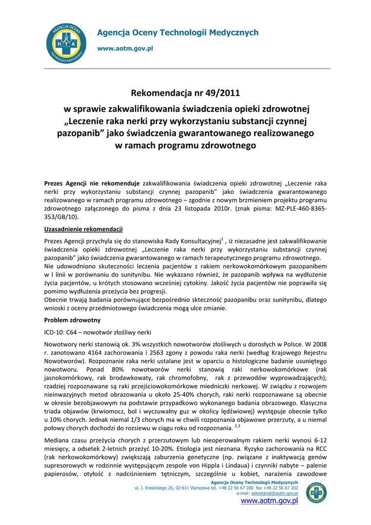 Agencja Oceny Technologii Medycznych www.aotm.gov.pl Rekomendacja nr 49/2011 w sprawie zakwalifikowania świadczenia opieki zdrowotnej „Leczenie raka nerki przy wykorzystaniu substancji czynnej pazopanib” jako świadczenia gwarantowanego realizowanego w ramach programu zdrowotnego Prezes Agencji nie rekomenduje zakwalifikowania świadczenia opieki zdrowotnej „Leczenie raka nerki przy wykorzystaniu substancji czynnej pazopanib” jako świadczenia gwarantowanego realizowanego w ramach programu zdrowotnego – zgodnie z nowym brzmieniem projektu programu zdrowotnego załączonego do pisma z dnia 23 listopada 2010r. (znak pisma: MZ‐PLE‐460‐8365‐ 353/GB/10). Uzasadnienie rekomendacji Prezes Agencji przychyla się do stanowiska Rady Konsultacyjnej1 , iż niezasadne jest zakwalifikowanie świadczenia opieki zdrowotnej „Leczenie raka nerki przy wykorzystaniu substancji czynnej pazopanib” jako świadczenia gwarantowanego w ramach terapeutycznego programu zdrowotnego. Nie udowodniono skuteczności leczenia pacjentów z rakiem nerkowokomórkowym pazopanibem w I linii w porównaniu do sunitynibu. Nie wykazano również, że pazopanib wpływa na wydłużenie życia pacjentów, u krótych stosowano wcześniej cytokiny. Jakość życia pacjentów nie poprawiła się pomimo wydłużenia przeżycia bez progresji. Obecnie trwają badania porównujące bezpośrednio skteczność pazopanibu oraz sunitynibu, dlatego wnioski z oceny przedmiotowego świadczenia mogą ulce zmianie. Problem zdrowotny ICD‐10: C64 – nowotwór złośliwy nerki Nowotwory nerki stanowią ok. 3% wszystkich nowotworów złośliwych u dorosłych w Polsce. W 2008 r. zanotowano 4164 zachorowania i 2563 zgony z powodu raka nerki (według Krajowego Rejestru Nowotworów). Rozpoznanie raka nerki ustalane jest w oparciu o histologiczne badanie usuniętego nowotworu. Ponad 80% nowotworów nerki stanowią raki nerkowokomórkowe (rak jasnokomórkowy, rak brodawkowaty, rak chromofobny, rak z przewodów wyprowadzających); rzadziej rozpoznawane są raki przejściowokomórkowe miedniczki nerkowej. W związku z rozwojem nieinwazyjnych metod obrazowania u około 25‐40% chorych, raki nerki rozpoznawane są obecnie w okresie bezobjawowym na podstawie przypadkowo wykonanego badania obrazowego. Klasyczna triada objawów (krwiomocz, bol i wyczuwalny guz w okolicy lędźwiowej) występuje obecnie tylko u 10% chorych. Jednak niemal 1/3 chorych ma w chwili rozpoznania objawowe przerzuty, a u niemal połowy chorych dochodzi do rozsiewu w ciągu roku od rozpoznania. 2,3 Mediana czasu przeżycia chorych z przerzutowym lub nieoperowalnym rakiem nerki wynosi 6‐12 miesięcy, a odsetek 2‐letnich przeżyć 10‐20%. Etiologia jest nieznana. Ryzyko zachorowania na RCC (rak nerkowokomórkowy) zwiększają zaburzenia genetyczne (np. związane z inaktywacją genów supresorowych w rodzinnie występującym zespole von Hippla i Lindaua) i czynniki nabyte – palenie papierosów, otyłość z nadciśnieniem tętniczym, szczególnie u kobiet, narażenia zawodowe Agencja Oceny Technologii Medycznych ul. I. Krasickiego 26, 02-611 Warszawa tel. +48 22 56 67 200 fax +48 22 56 67 202 e-mail: [email protected] www.aotm.gov.pl Rekomendacja nr 49/2011 Prezesa AOTM z dnia 27 czerwca 2011r (wielopierścieniowe węglowodory aromatyczne, trichloroetylen i perchloroetylen, kadm, azbest), nabyta torbielowatość nerek u chorych leczonych dializami z powodu schyłkowej niewydolności nerek, napromieniowanie miednicy. 2,3 Nowotwory nerki stanowią ok. 3% wszystkich nowotworów złośliwych u dorosłych w Polsce. W 2008 r. zanotowano 4164 zachorowania i 2563 zgony z powodu raka nerki (Krajowy Rejestr Nowotworów). Zgodnie z analizą problemu decyzyjnego liczebność populacji w I linii leczenia wynosi 400 osób (populacja docelowa: chorzy (>18 rż.) z histologicznie udokumentowanym rakiem nerkowokomórkowym w zaawansowanym stadium choroby (uogólnienie lub nawrót choroby) i/lub przerzutowym, uprzednio nieleczeni farmakologicznie (I linia) lub po niepowodzeniu terapii cytokinami (II linia); dane z Rejestru wniosków i zgód dla chemioterapii niestandardowej prowadzonego przez NFZ (C.64 ‐ pacjentów w 2009r.). W drugiej linii leczenia populacja ta wynosi 200 osób (należałoby ją oszacować podobnie jak oszacowano na potrzeby rekomendacji AOTM populację pacjentów do terapii sorafenibem na około pacjentów). W analizie wpływu na budżet oszacowano populację na /rocznie w I linii leczenia, a /rocznie w drugiej linii leczenia. Oszacowano prognozowaną roczną zapadalność na raka nerki (RCC) na pacjentów w 2011 roku. Według NFZ pacjentów, u których możliwe jest pierwszorzutowe leczenie pazopanibem jest ponad osób, a drugorzutowe – ponad osób. Zapadalność według danych KRN w ostatnich latach jest rzędu 3 800, co stanowi około 3 400 przypadków RCC i około 2 900 przypadków raka jasnokomórkowego. Liczba pacjentów leczonych w związku z rozpoznaniem C64 według danych pochodzących z systemów informatycznych NFZ jest rzędu (średnia z liczby pacjentów leczonych w latach 2004 – 2010). Rokowanie według kryteriów MSKCC (Memorial Sloan‐ Kettering Cancer Center) na podstawie opinii ekspertów klinicznych ‐ odsetki pacjentów w poszczególnych grupach rokowania: 25% dla grupy o korzystnym rokowaniu, 50% dla grupy z pośrednim rokowaniem oraz 25% dla grupy z rokowaniem niekorzystnym. Odsetek pacjentów z możliwością wykonania nefrektomii na podstawie opinii ekspertów klinicznych jest rzędu 68%. Różnice w oszacowaniu wynikają z przyjętych różnych parametrów dla populacji i metod szacowania liczebności. 2,3 Według opinii eksperta skutki następstw choroby lub stanu zdrowia są następujące: przedwczesny zgon, niezdolność do samodzielnej egzystencji, niezdolność do pracy, przewlekłe cierpienie/choroba, obniżenie jakości życia. Świadczenie wpływa na zmniejszenie zachorowalności i przedwczesnej umieralności z powodu n