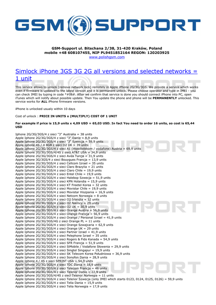 GSM-Support ul. Bitschana 2/38, 31-420 Kraków, Poland mobile +48 608107455, NIP PL9451852164 REGON: 120203925 www.polishgsm.com Simlock iPhone 3GS 3G 2G all versions and selected networks = 1 unit This service allows to unlock (remove network lock) remotely in Apple iPhone 2G/3G/3GS. We provide a service which works even if firmware is updated to the latest version and it is permanent unlock. Please choose operator and type in IMEI - you can check IMEI by typing in code *#06#. After we confirm that service is done you should connect iPhone into PC, open iTunes which will notify about possible update. Then You update the phone and phone will be PERMANENTLY unlocked. This service works for ALL iPhone firmware versions. iPhone is unlocked usualy within 10 days Cost of unlock : PRICE IN UNITS x (MULTIPLY) COST OF 1 UNIT For example if price is 15,9 units x 4,09 USD = 65,03 USD. In fact You need to order 16 units, so cost is 65,44 USD Iphone 2G/3G/3GS/4 z sieci "3" Australia = 38 units Apple Iphone 2G/3G/3GS/4 z sieci "3" Dania = 8,9 units Apple Iphone 2G/3G/3GS/4 z sieci "3" Szwecja = 59,9 units Apple Iphone 4S / 4 8GB z sieci O2 UK = 39 units Apple Iphone 2G/3G/3GS/4 z sieci A1 (mobiltelekom / vodafone) Austria = 69,9 units Apple Iphone 2G/3G/3GS/4/4S z sieci AT&T USA = 34,9 units Apple Iphone 2G/3G/3GS/4 z sieci Avea Turcja = 31,9 units Apple Iphone 3G/3GS/4 z sieci Bouygues Francja = 13,9 units Apple Iphone 2G/3G/3GS/4 z sieci Cellcom Izrael = 35 units Apple Iphone 2G/3G/3GS/4 z sieci Claro Brazylia = 21 units Apple Iphone 2G/3G/3GS/4 z sieci Claro Chile = 19,9 units Apple Iphone 2G/3G/3GS/4 z sieci Entel Chile = 19,9 units Apple Iphone 2G/3G/3GS/4 z sieci Halebop Szwecja = 51,9 units Apple Iphone 2G/3G/3GS/4 z sieci KPN Holandia = 15,9 units Apple Iphone 2G/3G/3GS/4 z sieci KT Freetel Korea = 32 units Apple Iphone 2G/3G/3GS/4 z sieci Movistar Chile = 19,9 units Apple Iphone 2G/3G/3GS/4 z sieci Movistar Hiszpania = 16,9 units Apple Iphone 2G/3G/3GS/4 z sieci Netcom Norwegia = 8 units Apple Iphone 2G/3G/3GS/4 z sieci O2 Irlandia = 32 units Apple Iphone 2G/3G/3GS/4 z sieci O2 Niemcy = 29 units Apple Iphone 2G/3G/3GS/4 z sieci O2 UK = 30,9 units Apple Iphone 2G/3G/3GS/4 z sieci Orange Austria = 56,9 units Apple Iphone 2G/3G/3GS/4 z sieci Orange Francja = 56,9 units Apple Iphone 2G/3G/3GS/4 z sieci Orange / Personal Izrael = 41,9 units Apple Iphone 2G/3G/3GS/4G z sieci Orange PL = 11 units Apple Iphone 2G/3G/3GS/4 z sieci Orange Szwajcaria = 62,9 units Apple Iphone 2G/3G/3GS/4 z sieci Orange UK = 29 units Apple Iphone 2G/3G/3GS/4 z sieci Partner Izrael = 41,9 units Apple Iphone 2G/3G/3GS/4 z sieci Pelephone Izrael = 35 units Apple Iphone 2G/3G/3GS/4 z sieci Rogers & Fido Kanada = 54,9 units Apple Iphone 2G/3G/3GS/4 z sieci SFR Francja = 51,9 units Apple Iphone 2G/3G/3GS/4 z sieci SiMobile / Vodafone Słowenia = 29,9 units Apple Iphone 2G/3G/3GS/4 z sieci Singtel Singapur = 19,9 units Apple Iphone 2G/3G/3GS/4 z sieci SK Telecom Korea Południowa = 36,9 units Apple Iphone 2G/3G/3GS/4 z sieci Sonofon Dania = 28,9 units Apple Iphone 4 / 4S z sieci SPRINT USA = 54,9 units Apple Iphone 2G/3G/3GS/4 z sieci TDC Dania = 18,9 units Apple Iphone 2G/3G/3GS/4 z sieci Telecom Francja = 46 units Apple Iphone 2G/3G/3GS/4 z sieci Telenor Dania = 22,9 units Apple Iphone 2G/3G/3GS/4/4S z sieci Telenor Norwegia = 11 units Apple Iphone 2G/3G/3GS/4 z sieci Telenor Szwecja (only IMEI which starts 0123, 0124, 0125, 0126) = 59,9 units Apple Iphone 2G/3G/3GS/4 z sieci Telia Dania = 15,9 units Apple Iphone 2G/3G/3GS/4 z sieci Telia Norwegia = 17,9 units Apple Apple Apple Apple Apple Apple Apple Apple Apple Apple Apple Apple Apple Apple Apple Apple Apple Apple Iphone Iphone Iphone Iphone Iphone Iphone Iphone Iphone Iphone Iphone Iphone Iphone Iphone Iphone Iphone Iphone Iphone Iphone 2G/3G/3GS/4/4S z sieci Telia Szwecja = 44 units 2G/3G/3GS/4 z sieci Telstra Australia = 23,9 units 2G/3G/3GS/4 z sieci Telus & Koodo Kanada = 35,9 units 2G/3G/3GS/4 z sieci TIM Brazylia = 20,9 units 2G/3G/3GS/4 z sieci T-Mobile Chorwacja = 52,9 units 2G/3G/3GS/4 z sieci T-Mobile Czarnogóra = 51,9 units 2G/3G/3GS/4 z sieci T-Mobile Holandia = 16,9 units 2G/3G/3GS/4 z sieci T-Mobile UK = 19 units 2G/3G/3GS/4 z sieci Turkcell Turcja = 31,9 units 2G/3G/3GS/4 z sieci Viettel Wietnam = 35 units 2G/3G/3GS/4 z sieci VIP Chorwacja = 39,9 units 2G/3G/3GS/4 z sieci Virgin Mobile / Optus Australia = 23,9 units 2G/3G/3GS/4 z sieci Vodafone Australia = 8,9 units 2G/3G/3GS/4 z sieci Vodafone Hiszpania = 59,9 units 2G/3G/3GS/4 z sieci Vodafone Holandia = 19,9 units 3G/3GS/4 z sieci Vodafone Irlandia = 40,9 units 3G/3GS/4 z sieci Vodafone Rumunia = 39,9 units 2G/3G/3GS/4 z sieci Vodafone Turcja = 15,9 units ©2012 www.polishgsm.com Powered by TCPDF (www.tcpdf.org)