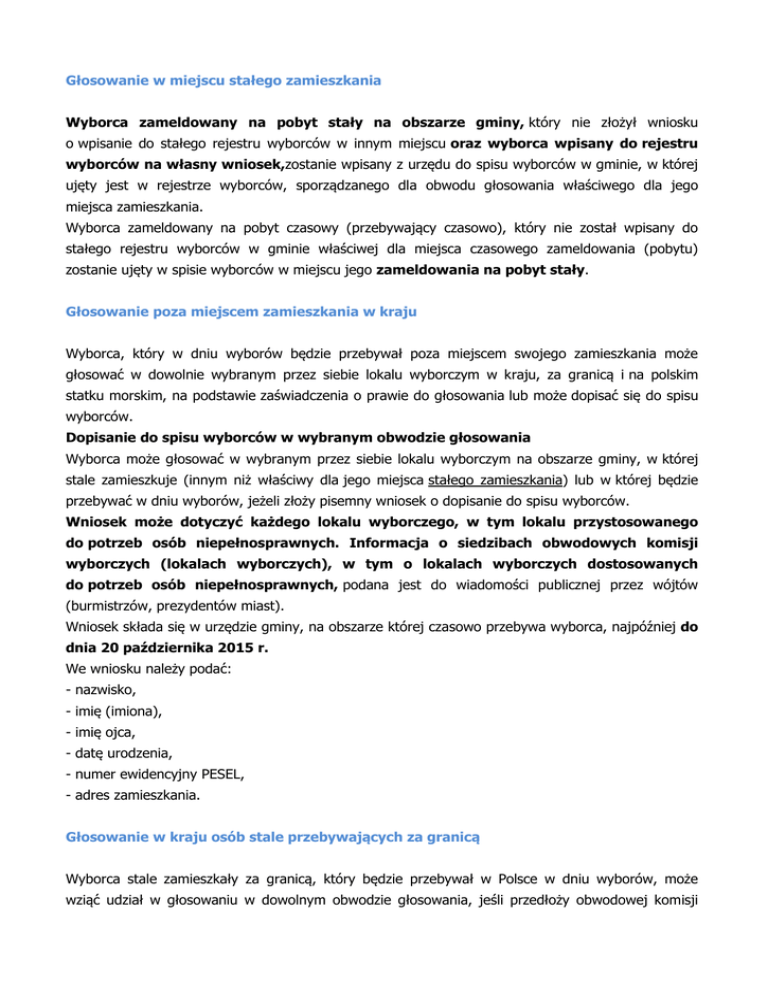 Głosowanie w miejscu stałego zamieszkania Wyborca zameldowany na pobyt stały na obszarze gminy, który nie złożył wniosku o wpisanie do stałego rejestru wyborców w innym miejscu oraz wyborca wpisany do rejestru wyborców na własny wniosek,zostanie wpisany z urzędu do spisu wyborców w gminie, w której ujęty jest w rejestrze wyborców, sporządzanego dla obwodu głosowania właściwego dla jego miejsca zamieszkania. Wyborca zameldowany na pobyt czasowy (przebywający czasowo), który nie został wpisany do stałego rejestru wyborców w gminie właściwej dla miejsca czasowego zameldowania (pobytu) zostanie ujęty w spisie wyborców w miejscu jego zameldowania na pobyt stały. Głosowanie poza miejscem zamieszkania w kraju Wyborca, który w dniu wyborów będzie przebywał poza miejscem swojego zamieszkania może głosować w dowolnie wybranym przez siebie lokalu wyborczym w kraju, za granicą i na polskim statku morskim, na podstawie zaświadczenia o prawie do głosowania lub może dopisać się do spisu wyborców. Dopisanie do spisu wyborców w wybranym obwodzie głosowania Wyborca może głosować w wybranym przez siebie lokalu wyborczym na obszarze gminy, w której stale zamieszkuje (innym niż właściwy dla jego miejsca stałego zamieszkania) lub w której będzie przebywać w dniu wyborów, jeżeli złoży pisemny wniosek o dopisanie do spisu wyborców. Wniosek może dotyczyć każdego lokalu wyborczego, w tym lokalu przystosowanego do potrzeb osób niepełnosprawnych. Informacja o siedzibach obwodowych komisji wyborczych (lokalach wyborczych), w tym o lokalach wyborczych dostosowanych do potrzeb osób niepełnosprawnych, podana jest do wiadomości publicznej przez wójtów (burmistrzów, prezydentów miast). Wniosek składa się w urzędzie gminy, na obszarze której czasowo przebywa wyborca, najpóźniej do dnia 20 października 2015 r. We wniosku należy podać: - nazwisko, - imię (imiona), - imię ojca, - datę urodzenia, - numer ewidencyjny PESEL, - adres zamieszkania. Głosowanie w kraju osób stale przebywających za granicą Wyborca stale zamieszkały za granicą, który będzie przebywał w Polsce w dniu wyborów, może wziąć udział w głosowaniu w dowolnym obwodzie głosowania, jeśli przedłoży obwodowej komisji wyborczej ważny polski paszport oraz dokument potwierdzający, że stale zamieszkuje za granicą. Dokumentem takim może być np. karta stałego pobytu, dokument potwierdzający zatrudnienie za granicą lub dokument potwierdzający uprawnienie do korzystania ze świadczeń ubezpieczenia społecznego za granicą (nie jest wymagane tłumaczenie tych dokumentów). Na tej podstawie obwodowa komisja wyborcza dopisze taką osobę do spisu wyborców, zaznaczając to w paszporcie przez odciśnięcie pieczęci komisji i wpisanie daty na ostatniej stronie przeznaczonej na adnotacje wizowe. Wyborca stale zamieszkały za granicą może również głosować na podstawie zaświadczenia o prawie do głosowania wydanego przez konsula, o ile został na swój wniosek wpisany do spisu wyborców w obwodzie głosowania utworzonym za granicą. Dopisanie do spisu wyborców żołnierzy, ratowników, policjantów, funkcjonariuszy Biura Ochrony Rządu, Straży Granicznej, Państwowej Straży Pożarnej oraz Służby Więziennej Żołnierze pełniący zasadniczą lub okresową służbę wojskową oraz pełniący służbę w charakterze kandydatów na żołnierzy zawodowych lub odbywający ćwiczenia i przeszkolenie wojskowe, ratownicy odbywający zasadniczą służbę w obronie cywilnej poza miejscem stałego zamieszkania, policjanci z jednostek skoszarowanych, funkcjonariusze Biura Ochrony Rządu, Straży Granicznej, Państwowej Straży Pożarnej oraz Służby Więziennej pełniący służbę w systemie skoszarowanym, którzy chcą wziąć udział w głosowaniu w miejscu odbywania służby, powinni złożyć wniosek o dopisanie do spisu wyborców w wybranym przez siebie obwodzie w danej miejscowości. Wniosek składa się w urzędzie gminy od dnia 5 października 2015 r. do dnia 12 października 2015 r. Osoby, które przybyły do miejsca zakwaterowania po tym terminie mogą złożyć wniosek najpóźniej do dnia 23 października 2015 r. We wniosku należy podać: - nazwisko, - imię (imiona), - imię ojca, - datę urodzenia, - numer ewidencyjny PESEL, - adres zamieszkania. Głosowanie w szpitalach, domach pomocy społecznej, zakładach karnych i aresztach śledczych oraz w domach studenckich Wyborcy, którzy będą przebywać w dniu wyborów w szpitalach, domach pomocy społecznej, zakładach karnych i aresztach śledczych zostaną wpisani do spisów wyborców sporządzonych dla obwodów głosowania utworzonych w tych jednostkach i będą mogli głosować w tych obwodach. Kierownik jednostki powiadomi osoby przebywające w jednostce o umieszczeniu ich w spisie wyborców. Na takich samych zasadach będą mogli głosować wyborcy przebywający w domach studenckich lub zespołach domów studenckich, w których utworzono obwody głosowania. Wyborcy wpisani do spisu wyborców w wyżej wymienionych jednostkach zostaną z urzędu skreśleni ze spisu w miejscu stałego zamieszkania. Osoby, które przybędą do wyżej wymienionych jednostek w dniu wyborów, będą mogły głosować w obwodach utworzonych w tych jednostkach tylko na podstawie zaświadczenia o prawie do głosowania. Dopisanie do spisu wyborców w dniu wyborów W dniu wyborów obwodowe komisje wyborcze dopisują do spisu wyborców jedynie tych wyborców, którzy: - przedłożą zaświadczenie o prawie do głosowania, - zostali pominięci w spisie, jeżeli udokumentują, że stale zamieszkują na terenie danego obwodu głosowania, a urząd gminy potwierdzi, że nie otrzymał zawiadomienia o utracie przez nich prawa wybierania lub o wpisaniu do spisu wyborców w innym obwodzie, - są obywatelami polskimi stale zamieszkującymi za granicą, głosującymi w kraju na podstawie ważnego polskiego paszportu i dokumentu potwi
