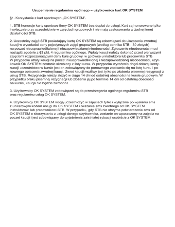 Uzupełnienie regulaminu ogólnego – użytkownicy kart OK SYSTEM §1. Korzystanie z kart sportowych „OK SYSTEM”. 1. STB honoruje karty sportowe firmy OK SYSTEM bez dopłat do usługi. Kart są honorowane tylko i wyłącznie przy uczestnictwie w zajęciach grupowych i nie mają zastosowania w żadnej innej działalności STB. 2. Uczestnicy zajęć STB posiadający kartę OK SYSTEM są zobowiązani do uiszczenia zwrotnej kaucji w wysokości ceny pojedynczych zajęć grupowych (według cennika STB - 30 złotych) na poczet nieusprawiedliwionej i niezapowiedzianej nieobecności. Zgłoszenie nieobecności musi nastąpić zgodnie z §3 pkt. 4 regulaminu ogólnego. Wpłaty kaucji należy dokonać przed pierwszymi zajęciami rozpoczynającymi dany kurs grupowy, w gotówce u instruktora lub pracownika STB. W przypadku utraty kaucji na poczet nieusprawiedliwionej i niezapowiedzianej nieobecności, użytkownik OK SYSTEM zostanie skreślony z listy kursu. W przypadku wyrażenia chęci dalszej kontynuacji uczestnictwa w kursie jest on zobowiązany do ponownego zapisania się na listę kursu i ponownego opłacenia zwrotnej kaucji. Zwrot kaucji możliwy jest tylko po złożeniu pisemnej rezygnacji z usług STB. Rezygnację należy złożyć w ciągu 14 dni od ostatniej obecności na kursie grupowym. W przypadku braku pisemnej rezygnacji lub złożenia jej po terminie 14 dni od ostatniej obecności na kursie, kaucja nie będzie zwrócona. 3. Użytkownicy OK SYSTEM zobowiązani są do przestrzegania ogólnego regulaminu STB oraz regulaminu usług OK SYSTEM. 4. Użytkownicy OK SYSTEM mogą uczestniczyć w zajęciach tylko i wyłącznie po wysłaniu sms z unikatowym kodem usługi do OK SYSTEM i okazania sms zwrotnego od OK SYSTEM instruktorowi lub pracownikowi STB. W przypadku, gdy STB nie otrzyma potwierdzenia sms od OK SYSTEM o skorzystaniu z usługi danego użytkownika, zostanie on wpuszczony na zajęcia na poczet kaucji i jest zobowiązany do wyjaśnienia zaistniałej sytuacji osobiście z OK SYSTEM.