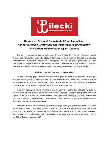 Honorowy Patronat Prezydenta RP Andrzeja Dudy Konkurs Literacki „Rotmistrz Pilecki Bohater Niezwyciężony” o Nagrodę Minister Edukacji Narodowej Szanowni Nauczyciele języka polskiego, Drogie Koleżanki i Koledzy, Stowarzyszenie Nauczycieli Polonistów wraz z Fundacją GDZIE rozpoczynają Konkurs Literacki poświęcony Rotmistrzowi Witoldowi Pileckiemu. Kierujemy go do uczniów gimnazjów i szkół ponadgimnazjalnych w Polsce i na świecie. To jeden z elementów Projektu Rotmistrz Pilecki Bohater Niezwyciężony. Inicjatorką pomysłu jest polonistka Małgorzata Kupiszewska. Konkurs trwa od 6 czerwca do 20 września. W 115. rocznicę jego urodzin chcemy uczcić pamięć Rotmistrza Witolda Pileckiego. Naszym celem jest propagowanie idei bliskich Rotmistrzowi Pileckiemu, sformułowanych w oryginalnych pracach literackich, które mają odznaczać się bogatą polszczyzną i niebanalnym spojrzeniem na postać bohatera na tle Jego czynów. Jego losy splotły się nierozerwalnie z losami Ojczyzny. Bronił Jej wolności w 1920 r., we wrześniu 1939 r. Poznał piekło obozu koncentracyjnego, stworzył tam podziemny ruch oporu. Walczył w Powstaniu Warszawskim. Niepogodzony z kolejną okupacją, niezłomnie zabiegał o wolność i suwerenność, zamordowany przez komunistyczne władze po okrutnym śledztwie i parodii procesu sądowego. Rotmistrz Pilecki został uznany przez brytyjskiego historyka, profesora Michaela Foota za jednego z sześciu najodważniejszych ludzi ruchu oporu II wojny światowej. Wreszcie nadszedł czas, kiedy cała Polska mówi o Żołnierzach Wyklętych i o Rotmistrzu Pileckim. Jego osoba i czyny, jakich dokonał, budzi także zainteresowanie na świecie, w krajach takich jak Chiny, Tajwan, Japonia, USA. My, nauczyciele języka polskiego, od co najmniej stu lat istnienia polskiej szkoły, mieliśmy i mamy do spełnienia misję: uczyć szacunku dla ojczystego języka, uczyć tradycji i uniwersalnych wartości. Szczególnie obecnie nasza polonistyczna wrażliwość skierowana jest na wartości potrzebne człowiekowi XXI wieku i młodzieży często zagubionej w gąszczu wielu przewartościowań i braku autorytetów. Mówię to z przekonaniem po półwiecznej pracy z uczniami. Wierzę, że zajmowanie się osobą Rotmistrza Witolda Pileckiego pozwoli młodzieży nie tylko poznać losy i czyny żołnierza wiernego ideałom, ale i wartości, w których wyrastał i przekazywał dzieciom. Pochylmy się więc nad naszymi uczniami, stwarzajmy sytuacje wychowawcze, aby mogli dokonywać wyboru wartości. Pokażmy postać Rotmistrza - młodego Polaka, wychowanego przez pokolenie powstańców styczniowych, harcerza, żołnierza, syna, męża, ojca swoich ukochanych dzieci. Maria Gudro-Homicka Stowarzyszenie Nauczycieli Polonistów