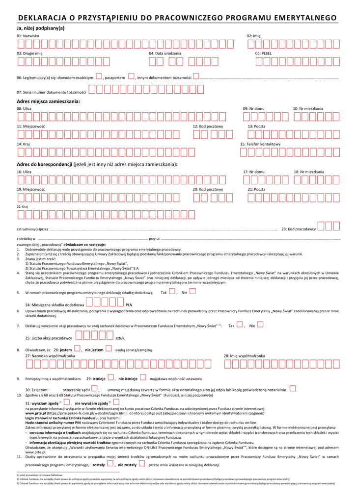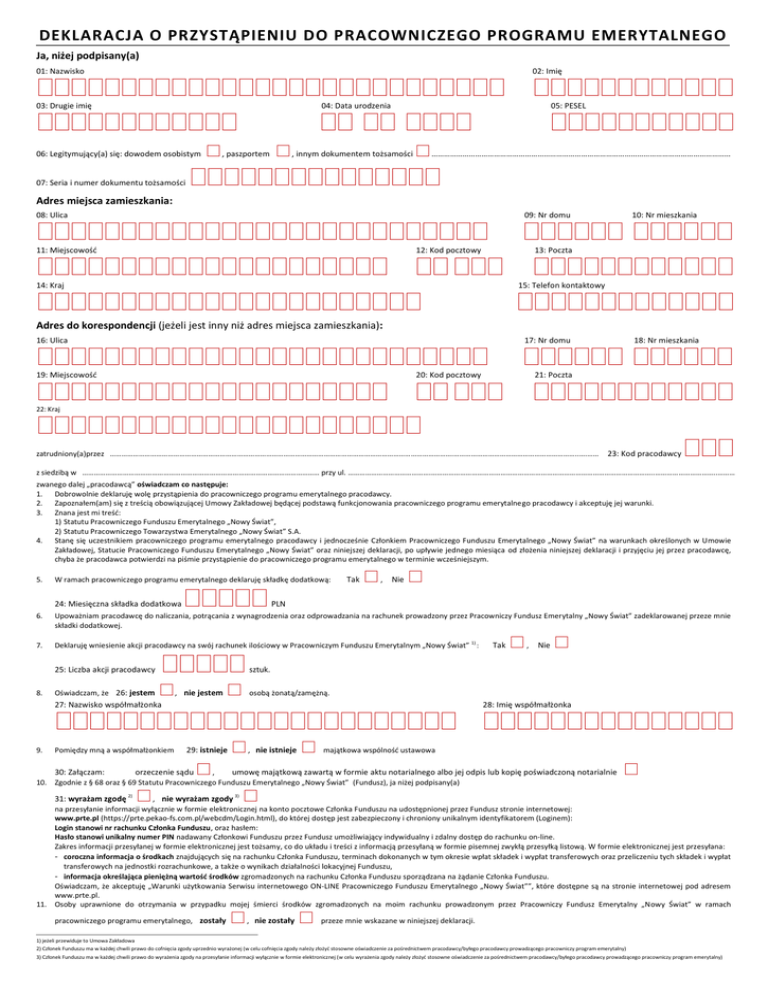 DEKLARACJA O PRZYSTĄPIENIU DO PRACOWNICZEGO PROGRAMU EMERYTALNEGO Ja, niżej podpisany(a) 01: Nazwisko 02: Imię 03: Drugie imię 04: Data urodzenia 06: Legitymujący(a) się: dowodem osobistym 07: Seria i numer dokumentu tożsamości , paszportem , innym dokumentem tożsamości 05: PESEL ……………………………………………………………………………………………………………………………… Adres miejsca zamieszkania: 08: Ulica 09: Nr domu 10: Nr mieszkania 11: Miejscowość 12: Kod pocztowy 13: Poczta 14: Kraj 15: Telefon kontaktowy Adres do korespondencji (jeżeli jest inny niż adres miejsca zamieszkania): 16: Ulica 17: Nr domu 18: Nr mieszkania 19: Miejscowość 20: Kod pocztowy 21: Poczta 22: Kraj zatrudniony(a)przez …………………………………………………………………………………………………………………………………………………………….………………………………………………………..….…… 23: Kod pracodawcy z siedzibą w …………………………………………………………………………………………………………… przy ul. …………………………………….……………………………………………………………………………………………………..…………………………..……… zwanego dalej „pracodawcą” oświadczam co następuje: 1. Dobrowolnie deklaruję wolę przystąpienia do pracowniczego programu emerytalnego pracodawcy. 2. Zapoznałem(am) się z treścią obowiązującej Umowy Zakładowej będącej podstawą funkcjonowania pracowniczego programu emerytalnego pracodawcy i akceptuję jej warunki. 3. Znana jest mi treść: 1) Statutu Pracowniczego Funduszu Emerytalnego „Nowy Świat”, 2) Statutu Pracowniczego Towarzystwa Emerytalnego „Nowy Świat” S.A. 4. Stanę się uczestnikiem pracowniczego programu emerytalnego pracodawcy i jednocześnie Członkiem Pracowniczego Funduszu Emerytalnego „Nowy Świat” na warunkach określonych w Umowie Zakładowej, Statucie Pracowniczego Funduszu Emerytalnego „Nowy Świat” oraz niniejszej deklaracji, po upływie jednego miesiąca od złożenia niniejszej deklaracji i przyjęciu jej przez pracodawcę, chyba że pracodawca potwierdzi na piśmie przystąpienie do pracowniczego programu emerytalnego w terminie wcześniejszym. 5. W ramach pracowniczego programu emerytalnego deklaruję składkę dodatkową: 24: Miesięczna składka dodatkowa Tak , Nie PLN 6. Upoważniam pracodawcę do naliczania, potrącania z wynagrodzenia oraz odprowadzania na rachunek prowadzony przez Pracowniczy Fundusz Emerytalny „Nowy Świat” zadeklarowanej przeze mnie składki dodatkowej. 7. Deklaruję wniesienie akcji pracodawcy na swój rachunek ilościowy w Pracowniczym Funduszu Emerytalnym „Nowy Świat” 1) : 8. 25: Liczba akcji pracodawcy sztuk. Oświadczam, że 26: jestem osobą żonatą/zamężną. , nie jestem 27: Nazwisko współmałżonka Tak , Nie 28: Imię współmałżonka 9. Pomiędzy mną a współmałżonkiem 29: istnieje , nie istnieje majątkowa wspólność ustawowa 30: Załączam: orzeczenie sądu , umowę majątkową zawartą w formie aktu notarialnego albo jej odpis lub kopię poświadczoną notarialnie 10. Zgodnie z § 68 oraz § 69 Statutu Pracowniczego Funduszu Emerytalnego „Nowy Świat” (Fundusz), ja niżej podpisany(a) 31: wyrażam zgodę 2) , nie wyrażam zgody 3) na przesyłanie informacji wyłącznie w formie elektronicznej na konto pocztowe Członka Funduszu na udostępnionej przez Fundusz stronie internetowej: www.prte.pl (https://prte.pekao-fs.com.pl/webcdm/Login.html), do której dostęp jest zabezpieczony i chroniony unikalnym identyfikatorem (Loginem): Login stanowi nr rachunku Członka Funduszu, oraz hasłem: Hasło stanowi unikalny numer PIN nadawany Członkowi Funduszu przez Fundusz umożliwiający indywidualny i zdalny dostęp do rachunku on-line. Zakres informacji przesyłanej w formie elektronicznej jest tożsamy, co do układu i treści z informacją przesyłaną w formie pisemnej zwykłą przesyłką listową. W formie elektronicznej jest przesyłana: - coroczna informacja o środkach znajdujących się na rachunku Członka Funduszu, terminach dokonanych w tym okresie wpłat składek i wypłat transferowych oraz przeliczeniu tych składek i wypłat transferowych na jednostki rozrachunkowe, a także o wynikach działalności lokacyjnej Funduszu, - informacja określająca pieniężną wartość środków zgromadzonych na rachunku Członka Funduszu sporządzana na żądanie Członka Funduszu. Oświadczam, że akceptuję „Warunki użytkowania Serwisu internetowego ON-LINE Pracowniczego Funduszu Emerytalnego „Nowy Świat””, które dostępne są na stronie internetowej pod adresem www.prte.pl. 11. Osoby uprawnione do otrzymania w przypadku mojej śmierci środków zgromadzonych na moim rachunku prowadzonym przez Pracowniczy Fundusz Emerytalny „Nowy Świat” w ramach pracowniczego programu emerytalnego, zostały , nie zostały przeze mnie wskazane w niniejszej deklaracji. 1) jeżeli przewiduje to Umowa Zakładowa 2) Członek Funduszu ma w każdej chwili prawo do cofnięcia zgody uprzednio wyrażonej (w celu cofnięcia zgody należy złożyć stosowne oświadczenie za pośrednictwem pracodawcy/byłego pracodawcy prowadzącego pracowniczy program emerytalny) 3) Członek Funduszu ma w każdej chwili prawo do wyrażenia zgody na przesyłanie informacji wyłącznie w formie elektronicznej (w celu wyrażenia zgody należy złożyć stosowne oświadczenie za pośrednictwem pracodawcy/byłego pracodawcy prowadzącego pracowniczy program emerytalny) Dane Uposażonego: 32: Udział procentowy w świadczeniu oznaczony liczbą całkowitą % 33: Nazwisko 34: Imię 35: Drugie imię 36: Data urodzenia 37: PESEL 38: Legitymujący(a) się: dowodem osobistym 39: Seria i numer dokumentu tożsamości , paszportem , innym dokumente
