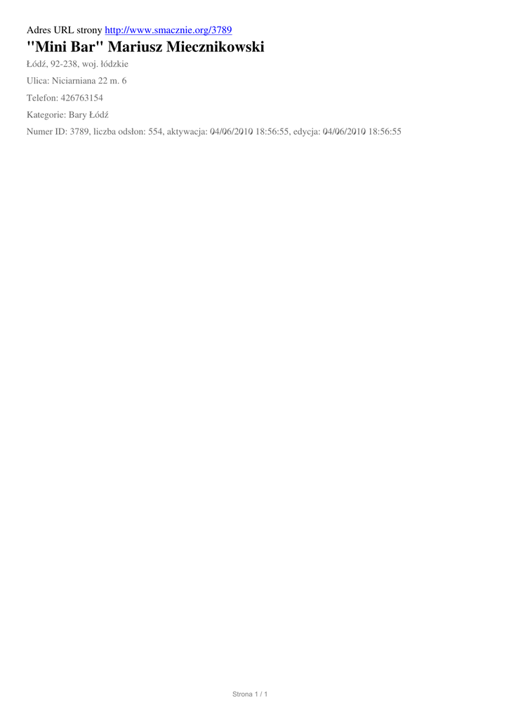 "Mini Bar" Mariusz Miecznikowski, Lodz, Niciarniana