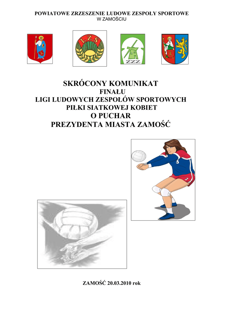 POWIATOWE ZRZESZENIE LUDOWE ZESPOŁY SPORTOWE W ZAMOŚCIU SKRÓCONY KOMUNIKAT FINAŁU LIGI LUDOWYCH ZESPOŁÓW SPORTOWYCH PIŁKI SIATKOWEJ KOBIET O PUCHAR PREZYDENTA MIASTA ZAMOŚĆ ZAMOŚĆ 20.03.2010 rok Finał Ligi Kobiet Ludowych Zespołów Sportowych Piłki Siatkowej o Puchar Prezydenta Miasta Zamość, odbył się 20.03.2010r w Zespole Szkół Ponadgimnazjalnych nr 5 w Zamościu. Do finału awansowało sześć pierwszych drużyn z rundy zasadniczej. MIEJSCE 1 2 3 4 5 6 NAZWA DRUŻYNA OPIEKUN UKS „III LO” ZAMOŚĆ UKS „ATOMIC” ZAMOŚĆ UKS „ORZEŁ” STARY ZAMOŚĆ II UKS „VICTORIA” GRABOWIEC AZS UP WNR W ZAMOŚCIU KU AZS PWSZ ZAMOŚĆ Maria Furmańczuk Katarzyna Nocuń Roman Blonka Jarosław Pieczykolan Jan Obszański Krzysztof Okapa TURNIEJ FINAŁOWY ROZEGRANY ZOSTAŁ NASTĘPUJĄCYM SYSTEMEM: PÓŁFINAŁY: Mecz 1 - UKS „III LO” ZAMOŚĆ - AZS PWSZ ZAMOŚĆ – 2:0 (25:18, 25:5) Mecz 2 - UKS „ATOMIC” ZAMOŚĆ - AZS UP WN ROLNICZYCH W ZAMOŚCIU - 2:0 (25:14, 25:12) Mecz 3 - UKS „ORZEŁ” STARY ZAMOŚĆ II - UKS „VICTORIA” GRABOWIEC – 0:2 (9:25, 20:25) MAŁY FINAŁ O MIEJSCA IV – V – VI Sety Punkty Miejsce AZS PWSZ X O:2 1:2 1:4 1 VI AZS UP WNR 2:0 X 2:0 4:0 6 IV UKS „Orzeł” II 2:1 0:2 2:3 2 V X BIORĄ UDZIAŁ DRUŻYNY PRZEGRYWAJĄCE W MECZACH 1, 2 , 3 SYSTEM ROZGRYWEK „KAŻDY Z KAŻDYM” FINAŁ O MIEJSCA I – II – III Sety Punkty Miejsce UKS „III LO” X 2:1 2:0 4:1 5 I UKS „Atomic” 1:2 X 2:0 3:2 4 II UKS „Viktoria” 0:2 0:2 X 0:4 0 III BIORĄ UDZIAŁ ZWYCIĘSKIE DRUŻYNY W MECZACH 1, 2 , 3 SYSTEM ROZGRYWEK „KAŻDY Z KAŻDYM” 2 Klasyfikacja końcowa po rozegraniu turnieju finałowego: I miejsce – UKS „III LO” Zamość - Puchar Prezydenta Miasta Zamość – Marcina Zamojskiego - Puchar Marszałka Województwa Lubelskiego – Krzysztofa Grabczaka - Medale Złote, Dyplomy Skład: Klaudia Adamczuk, Anna Ćwik, Agata Furlepa, Gabriela Klimecka, Monika Koper, Klaudia Kowalska, Katarzyna Mnich, Małgorzata Parol. Katarzyna Smolińska, Joanna Szypot, Elżbieta Wyrostkiewicz, Renata Rusztyn II miejsce – UKS „Atomic” Zamość - Puchar Starosty Zamojskiego – Henryka Mateja - Medale Srebrne, Dyplomy Skład: Anna Chadam, Magdalena Naklicka, Monika Wietrzyk, Karolina Soboń, Barbara Gaca, Katarzyna Nocuń, Sylwia Podkościelna, Joanna Jarosławska, Maria Kur, Monika Mazur, Bernardyna Szawarska, Anna Pasieczna III miejsce – UKS „Viktoria” Grabowiec - Puchar Prezydenta Miasta Zamość - Marcina Zamojskiego - Medale Brązowe, Dyplomy Skład: Edyta Sieczkowska, Kamila Kozar, Magda Pieczykolan, Milena Oleszczuk, Justyna Siedlecka, Wioleta Dobrowolska, Karolina Szwarnowska, Magdalena Bartyzel, Agnieszka Bębenek, Monika Nieckarz IV miejsce - AZS Uniwersytet Przyrodniczy Wydział Nauk Rolniczych Zamość - Puchar Starosty Zamojskiego – Henryka Mateja - Dyplomy Skład: Justyna Jasik, Klaudia Sachadel, Ewelina Nowak, Agnieszka Panek, Ewa Wawrzyszko, Karolina Kiecana, Marzena Juszczak, Joanna Futyma, Aleksandra Ruman, Ewelina Rogalska, Edyta Wolska Łuczak, Agata Jabłońska V miejsce – UKS „Orzeł” Stary Zamość - Puchar Prezydenta Miasta Zamość - Marcina Zamojskiego - Dyplomy Skład: Angelika Koniec, Anita Paradowska, Patrycja Pawlak, Kasia Stępniak, Karolina Goch, Dominika Kuryło, Rozalia Piróg, Ela Edel, Justyna Molas VI miejsce - Klub Uczelniany AZS Państwowa Wyższa Szkoła Zawodowa Zamość - Puchar Starosty Zamojskiego – Henryka Mateja - Dyplomy Skład: Natalia Newmywaka, Margaryta Kociuruba, Margaryta Stepaniuk, Oleksandra Poliszczuk, Julia Rudiuk, Anastazja Haponennko, Magdalena Jednacz, Joanna Kieryło, Marlena Gimlewicz, Katarzyna Gimlewicz, Diana Skowyra, Katarzyna Kitka, Elżbieta Głowacka, Anna Malowana 3 Najlepszą zawodniczką Ligi Piłki Siatkowej Kobiet LZS w sezonie 2009/2010 została: Agata Furlepa – UKS „III LO” Zamość - Nagroda specjalna Statuetka Powiatowego Zrzeszenia LZS w Zamościu Najmłodszą zawodniczką Zamojskiej Ligi LZS Piłki Siatkowej Kobiet Sezonu – 2009 – 2010 była: Karolina Goch – UKS „Orzeł” Stary Zamość - Nagroda specjalna Puchar Powiatowego Zrzeszenia LZS w Zamościu Najstarszą zawodniczką Zamojskiej Ligi LZS Piłki Siatkowej Kobiet Sezonu – 2009 – 2010 była: Katarzyna Nocuń – UKS „Atomic” Zamość - Nagroda specjalna Puchar Powiatowego Zrzeszenia LZS w Zamościu Najlepszym opiekunem - trenerem Zamojskiej Ligi LZS Piłki Siatkowej Kobiet Sezonu 2009 – 2010 została: Maria Furmańczuk – UKS „III LO” Zamość - Nagroda specjalna Okolicznościowa Patera Powiatowego Zrzeszenia LZS w Zamościu Komisarzem Ligi Piłki Siatkowej sezonu 2009/2010 – był Pan Adam Gaca. Głównym organizatorem – koordynatorem Ligi LZS w Piłce Siatkowej Kobiet było Powiatowe Zrzeszenie LZS w Zamościu, a odpowiedzialnym za rozgrywki był – Krzysztof Pszenniak – Sekretarz Powiatowego Zrzeszenia LZS w Zamościu. Sędzią Głównym rozgrywek Ligi Piłki Siatkowej Kobiet był Pan Adam Caban. Pozostali sędziowie: Adam Gaca, , Radosław Tuszyński, Piotr Grabczak, Damian Morawski Komisja Techniczna: Antoni Turzyniecki, Krzysztof Czerwieniec, Hubert Ćwik, Mirosław Kalita, Krzysztof Pszenniak Komisja Finansów: Małgorzata Farion, Jadwiga Kwiecień Opieka Medyczna: Wioletta Nowak, Anna Furmańczuk Serdeczne podziękowania składamy w imieniu zawodników i organizatorów dyrektorom: ZSP Nr 5 w Zamościu, ZS w Grabowcu, Gimnazjum w Miączynie, Gimnazjum w Sitnie, ZS w Sitańcu, ZSDiOŚ w Zwierzyńcu i III LO w Zamościu za udostępnienie hali sportowej na rozgrywki. ZDJĘCIA PONIŻEJ 4 Mecze finałowe Uczestnicy finału 5 I miejsce zdobyły zawodniczki III LO 6