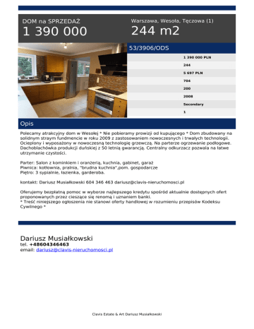 Warszawa, Wesoła, Tęczowa (1) DOM na SPRZEDAŻ 244 m2 1 390 000 53/3906/ODS 1 390 000 PLN 244 5 697 PLN 704 200 2008 Secondary 1 Opis Polecamy atrakcyjny dom w Wesołej * Nie pobieramy prowizji od kupującego * Dom zbudowany na solidnym straym fundmencie w roku 2009 z zastosowaniem nowoczesnych i trwałych technologii. Ocieplony i wyposażony w nowoczesną technologię grzewczą. Na parterze ogrzewanie podłogowe. Dachoblachówka produkcji duńskiej z 50 letnią gwarancją. Centralny odkurzacz pozwala na łatwe utrzymanie czystości. Parter: Salon z kominkiem i oranżerią, kuchnia, gabinet, garaż Piwnica: kotłownia, pralnia, "brudna kuchnia",pom. gospodarcze Piętro: 3 sypialnie, łazienka, garderoba. kontakt: Dariusz Musiałkowski 604 346 463 [email protected] Oferujemy bezpłatną pomoc w wyborze najlepszego kredytu spośród aktualnie dostępnych ofert proponowanych przez cieszące się renomą i uznaniem banki. * Treść niniejszego ogłoszenia nie stanowi oferty handlowej w rozumieniu przepisów Kodeksu Cywilnego * Dariusz Musiałkowski tel. +48604346463 email: [email protected] Clavis Estate & Art Dariusz Musiałkowski Powered by TCPDF (www.tcpdf.org)
