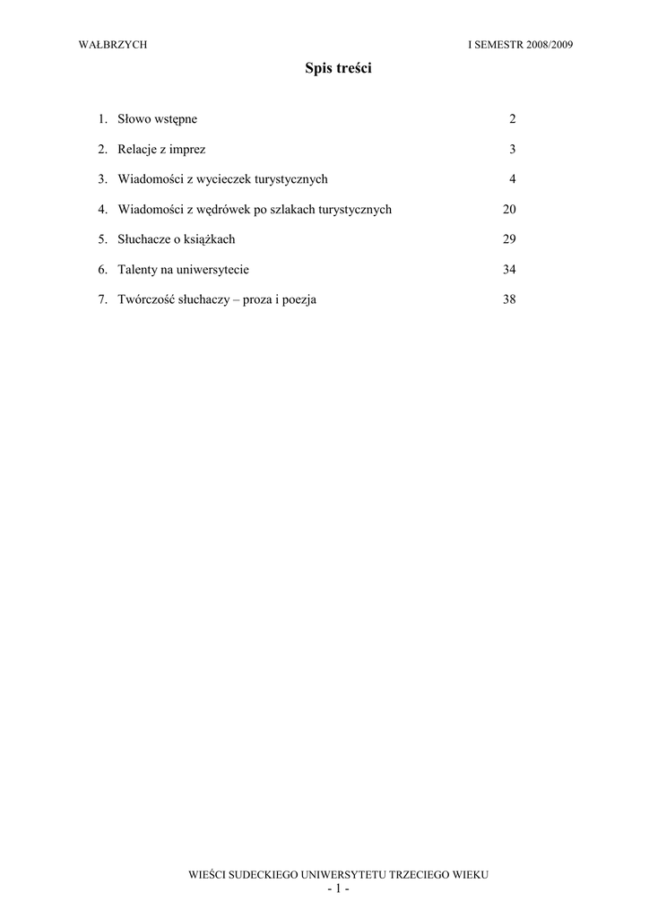 WAŁBRZYCH I SEMESTR 2008/2009 Spis treści 1. Słowo wstępne 2 2. Relacje z imprez 3 3. Wiadomości z wycieczek turystycznych 4 4. Wiadomości z wędrówek po szlakach turystycznych 20 5. Słuchacze o ksiąŜkach 29 6. Talenty na uniwersytecie 34 7. Twórczość słuchaczy – proza i poezja 38 WIEŚCI SUDECKIEGO UNIWERSYTETU TRZECIEGO WIEKU -1- WAŁBRZYCH I SEMESTR 2008/2009 Szanowni Państwo! Jubileusz pięciolecia Sudeckiego Uniwersytetu Trzeciego Wieku był okazją do pokazania się w środowisku Wałbrzycha. Zaproszeni goście, głównie władze uczelni i miasta, ale teŜ pan radny Zenon Nowaczyk czy posłanka Katarzyna Mrzygłocka świadczą o tym, Ŝe sprawy ludzi trzeciego wieku są coraz bardziej dostrzegane w Wałbrzychu. Dla mnie osobiście ten jubileusz to olbrzymia satysfakcja, Ŝe udało się stworzyć od zera, dzięki Państwu oczywiście, taką rozpoznawalną w Wałbrzychu i województwie dolnośląskim instytucję. Bardzo serdecznie dziękuję za wszelaką pomoc wszystkim zaangaŜowanym w jubileuszowe działania. Po uroczystościach jubileuszowych rozpoczął się kolejny, szósty juŜ rok działalności naszego uniwersytetu. Jest nas więcej niŜ rok temu – liczba słuchaczy oscyluje wokół 120 osób. To z jednej strony dobrze – sala wykładowa powinna pękać w szwach. Niestety, na razie ciasno jest tylko na zajęciach ruchowych. A przecieŜ mottem naszego uniwersytetu jest rozwijanie ducha i umacnianie ciała a nie tylko to drugie. Przypominam jednocześnie o przestrzeganie ustaleń, Ŝe chodzimy na jedną godzinę zajęć danego typu w tygodniu. Wigilia była piękna i wzruszająca jak zawsze. Dziękuję serdecznie wszystkim, którzy przyczynili się do jej organizacji i oprawy. To naprawdę duŜe przedsięwzięcie a organizacyjnie poradzili sobie Państwo doskonale. Występy były wzruszające a teatr, chociaŜ wzbudził kontrowersje, pokazał talenty naszych aktorów. W roku 2009 tak jak i w latach ubiegłych moŜna przekazać 1% swojego podatku dla wybranej organizacji pozarządowej. Ja proszę o wpłaty na rzecz Wałbrzyskiego Towarzystwa Oświatowego – organu załoŜycielskiego naszego uniwersytetu. Numer w Krajowym Rejestrze Sądowym (KRS) to 131549. Zapraszam do propagowania wpłat 1% wśród osób, które tego nie robią. Jest wiele potrzebujących organizacji, dla których 1% jest waŜną częścią finansowania. WTO uzyskało w ubiegłym roku z tego tytułu około 4 000 zł, z czego około 1000 zł to wpłaty słuchaczy i ich rodzin. Niestety, nie dostajemy wykazu darczyńców z urzędów skarbowych i nie dysponujemy danymi dokładnymi(oprócz sumy wpłat). Bardzo serdecznie dziękuję za wszystkie darowizny. Mam nadzieję, Ŝe widzą teŜ Państwo nasze starania o poprawę bazy naszej placówki: wstawiamy okna, kupujemy wyposaŜenie, planujemy docieplenie budynku. Jak zawsze na zakończenie trochę o planach na drugi semestr. W lutym odwiedzą nas dzieci z przedszkola z jasełkami. W marcu chciałabym zorganizować wieczór poezji Ireny Boreckiej, imprezę dla nas i dla studentów z PWSZ im. AS. Przydałby się teŜ jakiś wernisaŜ – mam pomysł, potrzebuję pomocy w organizacji. W kwietniu jakiś wyjazd do Opery. W końcu maja powinniśmy się wybrać na wycieczkę – tym razem moŜe będzie to Trójmiasto. No i zaraz będą wakacje… Teresa Ziegler – kierownik Sudeckiego UTW WIEŚCI SUDECKIEGO UNIWERSYTETU TRZECIEGO WIEKU -2- WAŁBRZYCH I SEMESTR 2008/2009 Relacje z imprez Recenzja z musicalu „Skrzypek na dachu” W dniu 19 października 2008 r. grupa słuchaczy Sudeckiego UTW pojechała na musical „Skrzypek na dachu”, który był wystawiany w Hali Stulecia we Wrocławiu. Na widowni zasiadało cztery i pół tysiąca publiczności. Scena liczyła sobie 1500 metrów kwadratowych powierzchni, na której stało około 100 domków mieszkańców Anatewki, 13 metrów nad sceną wisiał wielki księŜyc, a na scenie występował ponad dwustu osobowy zespół: solistów, chóru, baletu, orkiestry i statystów oraz zagroda anatewkowa z koniem, krową, kozą i kurami. Ustawione po obu stronach telebimy pokazywały solistów i śpiewane teksty piosenek. Libretto musicalu oparte jest na motywach powieści Szolema Alejchema (1859-1916), klasyka literatury Ŝydowskiej. Akcja spektaklu dzieje się na początku XX wieku w ukraińskiej wiosce Anatewka, gdzie mieszka głównie społeczność Ŝydowska, która zachowuje swoje obyczaje i tradycje. Główną postacią jest biedny, pracowity i bardzo religijny mleczarz Tewje oraz postać Skrzypka, grającego na dachu. Tewje ma kłótliwą Ŝonę Gołdę i trzy córki na wydaniu. Zgodnie z tradycją Ŝydowską to rodzice wybierają dla swych dzieci przyszłych małŜonków. PodwaŜanie tej decyzji było zamachem na wszystkie świętości. I właśnie o tym jest ta opowieść, o podwaŜaniu krok po kroku szczegółów tradycji, aŜ do zupełnego jej zrujnowania. Córki wybierają sobie męŜów według własnego serca i odmawiają posłuszeństwa ojcu a na dodatek rozkaz o wysiedlaniu śydów dotyka teŜ mieszkańców Anatewki, którzy muszą opuścić swe domostwa w ciągu trzech dni i ruszyć w świat. Skrzypek na dachu jest dziełem ponadczasowym a Anatewka to symbol nietolerancji i rasizmu, z jakim spotyka się człowiek we współczesnym świecie, gdzie prawa mniejszości nie są uznawane w imię racji większości, a przejawy nietolerancji etnicznej, religijnej czy obyczajowej dotykają dzisiejszy świat, o czym świadczą wydarzenia w Jugosławii, Nowym Jorku, Afganistanie, na Bliskim Wschodzie czy w Tybecie. Wracając do spektaklu pragnę zwrócić uwagę na pięknie śpiewane i tańczone sceny zbiorowe no i oczywiście znakomite piosenki z najbardziej znaną piosenką mleczarza „Gdybym był bogaty”, w której zastanawia się, co by Bogu szkodziło, gdyby dał mu trochę pieniędzy. Spektakl bardzo się podobał i aplauz publiczności w postaci braw trwał bardzo długo. Danuta Goszczyńska WIE