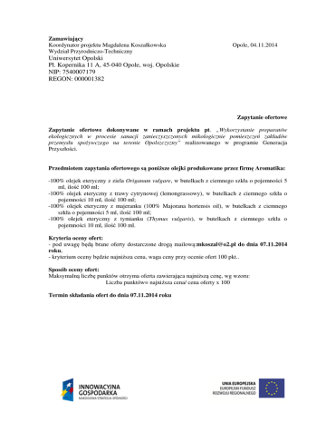Zamawiający Koordynator projektu Magdalena Koszałkowska Wydział Przyrodniczo-Techniczny Techniczny Opole, 04.11.2014 Uniwersytet Opolski Pl. Kopernika 11 A, 45-040 040 Opole, woj. Opolskie NIP: 7540007179 REGON: 000001382 Zapytanie ofertowe Zapytanie ofertowe dokonywane w ramach projektu pt. „Wykorzystanie preparatów ekologicznych w procesie sanacji zanieczyszczonych mikologicznie pomieszczeń pomieszcze zakładów przemysłu spożywczego ywczego na terenie Opolszczyzny” realizowanego w programie Generacja Przyszłości. s poniższe sze olejki produkowane przez firm firmę Aromatika: Przedmiotem zapytania ofertowego są -100% 100% olejek eteryczny z ziela Origanum vulgare,, w butelkach z ciemnego szkła o pojemności pojemno 5 ml, ilość 100 ml; -100% 100% olejek eteryczny z trawy cytrynowej (lemongrassowy), w butelkachh z ciemnego szkła o pojemności 10 ml, ilość ść 100 ml; -100% 100% olejek eteryczny z majeranku (100% Majorana hortensis oil),, w butelkach z ciemnego szkła o pojemności ci 5 ml, ilo ilość 100 ml; -100% 100% olejek eteryczny z tymianku (Thymus ( vulgaris), ), w butelkach z ciemnego szkła o pojemności 10 ml, ilość ść 100 ml. Kryteria oceny ofert: - pod uwagę będą brane oferty dostarczone drog drogą mailową:[email protected] [email protected] do dnia 07.11.2014 roku, - kryterium oceny będzie dzie najni najniższa sza cena, waga ceny przy ocenie ofert 100 pkt.. Sposób oceny ofert: Maksymalną liczbę punktów otrzyma oferta zawieraj zawierająca najniższą cenę,, wg wzoru: Liczba punktów= najniższa najni cena/ cena oferty x 100 Termin składania ofert do dnia 07.11.2014 roku