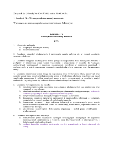 Załącznik do Uchwały Nr 4/2015/2016 z dnia 31.08.2015 r. 1. Rozdział X – Wewnątrzszkolne zasady oceniania Wprowadza się zmiany zapisów oznaczone kolorem fioletowym: ROZDZIAŁ X Wewnątrzszkolne zasady oceniania § 106. 1. Ocenianiu podlegają: 1) osiągnięcia edukacyjne ucznia; 2) zachowanie ucznia; 2. Ocenianie osiągnięć edukacyjnych i zachowania ucznia odbywa się w ramach oceniania wewnątrzszkolnego. 3. Ocenianie osiągnięć edukacyjnych ucznia polega na rozpoznaniu przez nauczycieli poziomu i postępów w opanowaniu przez ucznia wiadomości i umiejętności w stosunku do wymagań edukacyjnych wynikających z podstawy programowej, określonej w odrębnych przepisach i realizowanych w szkole programów nauczania uwzględniających tę podstawę oraz formułowaniu oceny. 4. Ocenianie zachowania ucznia polega na rozpoznaniu przez wychowawcę klasy, nauczycieli oraz uczniów danej klasy sposobu funkcjonowania ucznia w środowisku szkolnym, respektowania zasad współżycia społecznego i ogólnie przyjętych norm, a także zaangażowania w rozwijanie swojej osobowości i wywiązywanie się z obowiązków ucznia określonych w Statucie Szkoły. 5. Ocenianie wewnątrzszkolne ma na celu: 1) poinformowanie ucznia o poziomie jego osiągnięć edukacyjnych i jego zachowaniu oraz postępach w tym zakresie; 2) udzielenie uczniowi pomocy w samodzielnym planowaniu swojego rozwoju; wskazanie uczniowi pozytywnych efektów jego dotychczasowej pracy; 3) motywowanie ucznia do dalszych postępów w nauce i zachowaniu; 4) dostarczenie rodzicom (prawnym opiekunom) i nauczycielom informacji o postępach, trudnościach w nauce i specjalnych uzdolnieniach ucznia; 5) dostarczenie uczniowi i jego rodzicom informacji o prezentowanych przez ucznia postawach oraz motywowanie ucznia do autorefleksji, samokontroli, odpowiedzialności za siebie i swoje decyzje; 6) umożliwienie nauczycielom doskonalenia organizacji i metod pracy dydaktyczno – wychowawczej. 6. Ocenianie wewnątrzszkolne obejmuje: 1) formułowanie przez nauczycieli wymagań edukacyjnych niezbędnych do uzyskania poszczególnych śródrocznych i rocznych ocen klasyfikacyjnych z obowiązkowych i dodatkowych zajęć edukacyjnych; 2) ustalanie kryteriów oceniania zachowania oraz ich uzasadnienie w formie pisemnej lub ustnej; 3) 4) 5) 6) 7) ocenianie bieżące i ustalanie śródrocznych ocen klasyfikacyjnych z obowiązkowych oraz dodatkowych zajęć edukacyjnych oraz śródrocznej oceny klasyfikacyjnej zachowania, według skali, o której mowa w § 109 ust. 1. i § 118 ust. 4 Statutu Szkoły; przeprowadzanie egzaminów klasyfikacyjnych, poprawkowych i sprawdzających; uzasadnienie przez nauczyciela w formie pisemnej lub ustnej śródrocznych i rocznych ocen klasyfikacyjnych. Nauczyciel ma obowiązek uzasadnić w formie pisemnej każdą ocenę niedostateczną i roczną; ustalanie rocznych ocen klasyfikacyjnych z obowiązkowych i dodatkowych zajęć edukacyjnych oraz rocznej oceny klasyfikacyjnej zachowania, według skali, o której mowa w § 109 ust. 1. i § 118 ust. 4 Statutu Szkoły; ustalenie warunków i trybu uzyskania wyższej niż przewidywane rocznych ocen klasyfikacyjnych z obowiązkowych zajęć edukacyjnych oraz rocznej oceny klasyfikacyjnej zachowania; ustalanie warunków i sposobu przekazywania rodzicom (prawnym opiekunom) informacji o postępach i trudnościach ucznia w nauce. 7. Ocena jest informacją, w jakim stopniu uczeń spełnił wymagania programowe postawione przez nauczyciela, nie jest karą ani nagrodą. § 107. 1. W ocenianiu obowiązują zasady: 1) zasada częstotliwości i rytmiczności – uczeń oceniany jest na bieżąco i rytmicznie; ocena końcowa nie jest średnią ocen cząstkowych; 2) zasada jawności kryteriów – uczeń i jego rodzice (prawni opiekunowie) znają kryteria oceniania, zakres materiału z każdego przedmiotu oraz formy pracy podlegające ocenie; 3) zasada różnorodności wynikająca ze specyfiki każdego przedmiotu; zasada dostosowania wymagań edukacyjnych do indywidualnych potrzeb rozwojowych i edukacyjnych oraz możliwości psychofizycznych ucznia; 4) zasada różnicowania wymagań – zadania stawiane uczniom powinny mieć zróżnicowany poziom trudności i dawać możliwość uzyskania wszystkich ocen; 5) zasada otwartości – wewnątrzszkolne ocenianie podlega weryfikacji i modyfikacji w oparciu o okresową ewaluację. § 108. Jawność oceny 1. Nauczyciel na początku roku szkolnego przedstawia uczniom opracowany przez siebie lub wybrany program nauczania w danej klasie uwzględniający profil i specyfikę zespołu. 2. Nauczyciel na początku roku szkolnego informuje uczniów i rodziców (prawnych opiekunów) o: 1) wymaganiach edukacyjnych niezbędnych do uzyskania poszczególnych śródrocznych i rocznych ocen klasyfikacyjnych z obowiązkowych i dodatkowych zajęć edukacyjnych, wynikających z realizowanego programu nauczania; 2) sposobach sprawdzania osiągnięć edukacyjnych uczniów; 3) warunkach i trybie uzyskania wyższej niż przewidywana rocznej oceny klasyfikacyjnej z obowiązkowych i dodatkowych zajęć edukacyjnych; skutkach ustalenia uczniowi nagannej rocznej oceny klasyfikacyjnej zachowania. 3. Oceny są jawne zarówno dla ucznia, jak i jego rodziców (prawnych opiekunów). Sprawdzone i ocenione pisemne prace kontrolne uczeń i jego rodzice (prawni opiekunowie) otrzymują do wglądu. Na prośbę ucznia lub jego rodziców (prawnych opiekunów) nauczyciel ustalający ocenę powinien ją krótko uzasadnić. 3. Oceny są jawne zarówno dla ucznia, jak i jego rodziców(opiekunów prawnych). Sprawdzone i ocenione pisemne prace kontrolne uczeń otrzymuje do wglądu w czasie lekcji, a Nie dopuszcza się kopiowania ani fotografowania jakiejkolwiek części udostępnionych prac. Rodzice (prawni opiekunowie) mają prawo wglądu do sprawdzonych i ocenionych prac pisemnych swoich dzieci podczas zebrań rodzicielskich oraz dni otwartych. Nie dopuszcza się kopiowania ani fotografowa
