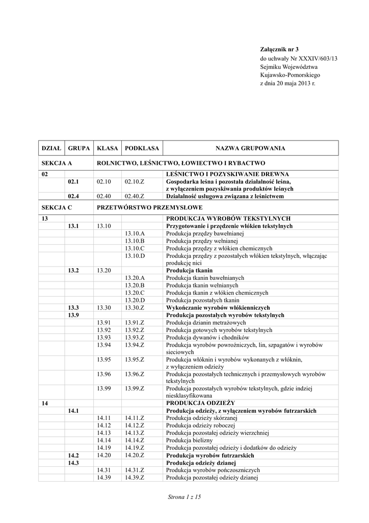 Załącznik nr 3 do uchwały Nr XXXIV/603/13 Sejmiku Województwa Kujawsko-Pomorskiego z dnia 20 maja 2013 r. DZIAŁ GRUPA SEKCJA A KLASA PODKLASA ROLNICTWO, LEŚNICTWO, ŁOWIECTWO I RYBACTWO 02 02.1 02.10 02.10.Z 02.4 02.40 02.40.Z SEKCJA C 13.10 13.10.A 13.10.B 13.10.C 13.10.D 13.2 13.3 13.9 13.20 13.30 13.20.A 13.20.B 13.20.C 13.20.D 13.30.Z 13.91 13.92 13.93 13.94 13.91.Z 13.92.Z 13.93.Z 13.94.Z 13.95 13.95.Z 13.96 13.96.Z 13.99 13.99.Z 14.11 14.12 14.13 14.14 14.19 14.20 14.11.Z 14.12.Z 14.13.Z 14.14.Z 14.19.Z 14.20.Z 14.31 14.39 14.31.Z 14.39.Z 14 14.1 14.2 14.3 LEŚNICTWO I POZYSKIWANIE DREWNA Gospodarka leśna i pozostała działalność leśna, z wyłączeniem pozyskiwania produktów leśnych Działalność usługowa związana z leśnictwem PRZETWÓRSTWO PRZEMYSŁOWE 13 13.1 NAZWA GRUPOWANIA PRODUKCJA WYROBÓW TEKSTYLNYCH Przygotowanie i przędzenie włókien tekstylnych Produkcja przędzy bawełnianej Produkcja przędzy wełnianej Produkcja przędzy z włókien chemicznych Produkcja przędzy z pozostałych włókien tekstylnych, włączając produkcję nici Produkcja tkanin Produkcja tkanin bawełnianych Produkcja tkanin wełnianych Produkcja tkanin z włókien chemicznych Produkcja pozostałych tkanin Wykończanie wyrobów włókienniczych Produkcja pozostałych wyrobów tekstylnych Produkcja dzianin metraŜowych Produkcja gotowych wyrobów tekstylnych Produkcja dywanów i chodników Produkcja wyrobów powroźniczych, lin, szpagatów i wyrobów sieciowych Produkcja włóknin i wyrobów wykonanych z włóknin, z wyłączeniem odzieŜy Produkcja pozostałych technicznych i przemysłowych wyrobów tekstylnych Produkcja pozostałych wyrobów tekstylnych, gdzie indziej niesklasyfikowana PRODUKCJA ODZIEśY Produkcja odzieŜy, z wyłączeniem wyrobów futrzarskich Produkcja odzieŜy skórzanej Produkcja odzieŜy roboczej Produkcja pozostałej odzieŜy wierzchniej Produkcja bielizny Produkcja pozostałej odzieŜy i dodatków do odzieŜy Produkcja wyrobów futrzarskich Produkcja odzieŜy dzianej Produkcja wyrobów pończoszniczych Produkcja pozostałej odzieŜy dzianej Strona 1 z 15 DZIAŁ GRUPA KLASA PODKLASA 15 15.1 15.11 15.12 15.11.Z 15.12.Z 15.2 15.20 15.20.Z 16.1 16.2 16.10 16.10.Z 16.21 16.22 16.23 16.21.Z 16.22.Z 16.23.Z 16.24 16.29 16.24.Z 16.29.Z 17.21 17.21.Z 17.22 17.22.Z 17.23 17.24 17.29 17.23.Z 17.24.Z 17.29.Z 18.2 18.11 18.12 18.13 18.14 18.20 18.11.Z 18.12.Z 18.13.Z 18.14.Z 18.20.Z 19.1 19.2 19.10 19.20 19.10.Z 19.20.Z 20.11 20.12 20.13 20.11.Z 20.12.Z 20.13.Z 20.14 20.15 20.16 20.17 20.14.Z 20.15.Z 20.16.Z 20.17.Z 16 17 17.2 18 18.1 19 20 20.1 NAZWA GRUPOWANIA PRODUKCJA SKÓR I WYROBÓW ZE SKÓR WYPRAWIONYCH Wyprawa skór, garbowanie; wyprawa i barwienie skór futerkowych; produkcja toreb bagaŜowych, toreb ręcznych i podobnych wyrobów kaletniczych; produkcja wyrobów rymarskich Wyprawa skór, garbowanie; wyprawa i barwienie skór futerkowych Produkcja toreb bagaŜowych, toreb ręcznych i podobnych wyrobów kaletniczych; produkcja wyrobów rymarskich Produkcja obuwia PRODUKCJA WYROBÓW Z DREWNA ORAZ KORKA, Z WYŁĄCZENIEM MEBLI; PRODUKCJA WYROBÓW ZE SŁOMY I MATERIAŁÓW UśYWANYCH DO WYPLATANIA Produkcja wyrobów tartacznych Produkcja wyrobów z drewna, korka, słomy i materiałów uŜywanych do wyplatania Produkcja arkuszy fornirowych i płyt wykonanych na bazie drewna Produkcja gotowych parkietów podłogowych Produkcja pozostałych wyrobów stolarskich i ciesielskich dla budownictwa Produkcja opakowań drewnianych Produkcja pozostałych wyrobów z drewna; produkcja wyrobów z korka, słomy i materiałów uŜywanych do wyplatania PRODUKCJA PAPIERU I WYROBÓW Z PAPIERU Produkcja wyrobów z papieru i tektury Produkcja papieru falistego i tektury falistej oraz opakowań z papieru i tektury Produkcja artykułów gospodarstwa domowego, toaletowych i sanitarnych Produkcja artykułów piśmiennych Produkcja tapet Produkcja pozostałych wyrobów z papieru i tektury POLIGRAFIA I REPRODUKCJA ZAPISANYCH NOŚNIKÓW INFORMACJI Drukowanie i działalność usługowa związana z poligrafią Drukowanie gazet Pozostałe drukowanie Działalność usługowa związana z przygotowywaniem do druku Introligatorstwo i podobne usługi Reprodukcja zapisanych nośników informacji WYTWARZANIE I PRZETWARZANIE KOKSU I PRODUKTÓW RAFINACJI ROPY NAFTOWEJ Wytwarzanie i przetwarzanie koksu Wytwarzanie i przetwarzanie produktów rafinacji ropy naftowej PRODUKCJA CHEMIKALIÓW I WYROBÓW CHEMICZNYCH Produkcja podstawowych chemikaliów, nawozów i związków azotowych, tworzyw sztucznych i kauczuku syntetycznego w formach podstawowych Produkcja gazów technicznych Produkcja barwników i pigmentów Produkcja pozostałych podstawowych chemikaliów nieorganicznych Produkcja pozostałych podstawowych chemikaliów organicznych Produkcja nawozów i związków azotowych Produkcja tworzyw sztucznych w formach podstawowych Produkcja kauczuku syntetycznego w formach podstawowych Strona 2 z 15 DZIAŁ GRUPA KLASA PODKLASA 20.2 20.3 20.20 20.30 20.20.Z 20.30.Z 20.41 20.42 20.41.Z 20.42.Z 20.51 20.52 20.59 20.51.Z 20.52.Z 20.59.Z 20.60 20.60.Z 22.11 22.11.Z 22.19 22.19.Z 22.21 22.21.Z 22.22 22.23 22.29 22.22.Z 22.23.Z 22.29.Z 23.11 23.12 23.13 23.14 23.19 23.20 23.11.Z 23.12.Z 23.13.Z 23.14.Z 23.19.Z 23.20.Z 23.61 23.62 23.63 23.64 23.65 23.69 23.70 23.61.Z 23.62.Z 23.63.Z 23.64.Z 23.65.Z 23.69.Z 23.70.Z 23.91 23.99 23.91.Z 23.99.Z 24.1 24.10 24.10.Z 24.2 24.20 24.20.Z 24.3 24.4 24.31 24.42 24.31.Z 24.42.A 24.42.B 24.43.Z 24.44.Z 20.4 20.5 20.6 22 22.1 22.2 23 23.1 23.2 23.6 23.7 23.9 24 24.43 24.44 NAZWA GRUPOWANIA Produkcja pestycydów i pozostałych środków agrochemicznych Produkcja farb, lakierów i podobnych powłok, farb drukarskich i mas uszczelniających Produkcja mydła i detergentów, środków myjących i czyszczących, wyrobów kosmetycznych i toaletowych Produkcja mydła i detergentów, środków myjących i czyszczących Produkcja wyrobów kosmetycznych i toaletowych Produkcja pozostałych wyrobó