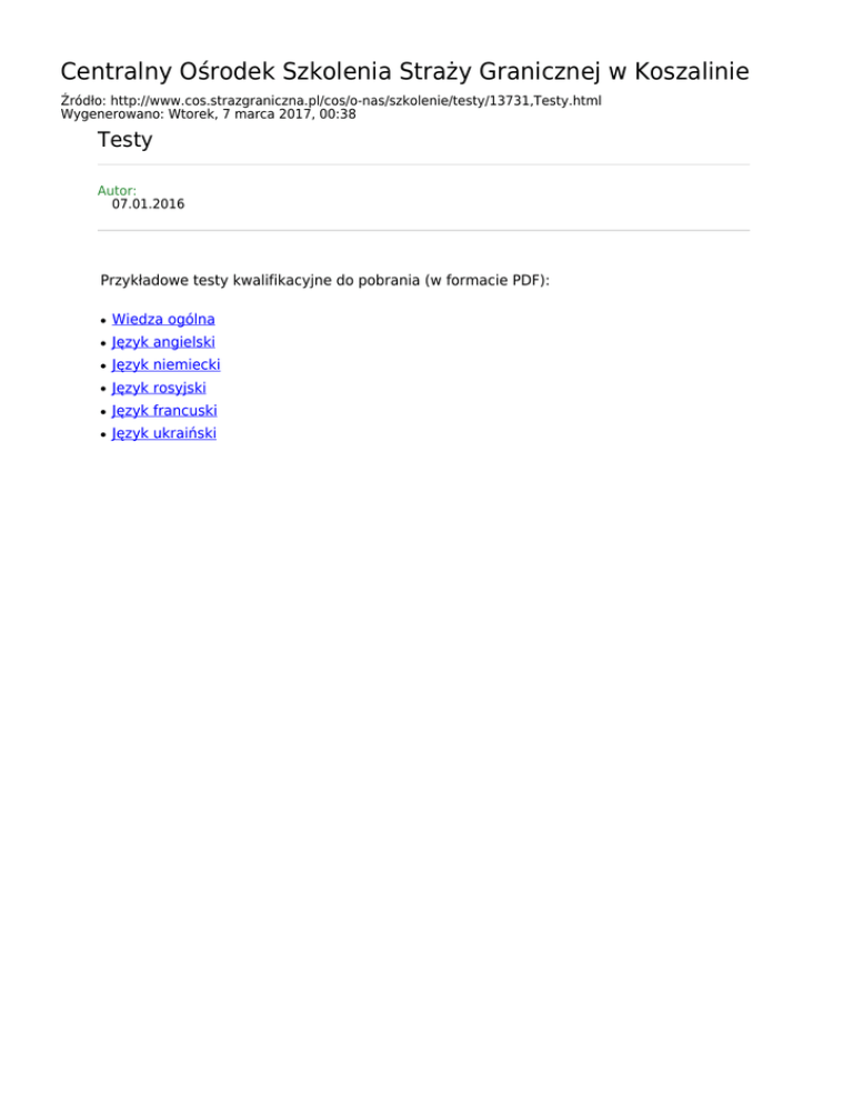 Centralny Ośrodek Szkolenia Straży Granicznej w Koszalinie Źródło: http://www.cos.strazgraniczna.pl/cos/o-nas/szkolenie/testy/13731,Testy.html Wygenerowano: Wtorek, 7 marca 2017, 00:38 Testy Autor: 07.01.2016 Przykładowe testy kwalifikacyjne do pobrania (w formacie PDF): ● Wiedza ogólna ● Język angielski ● Język niemiecki ● Język rosyjski ● Język francuski ● Język ukraiński