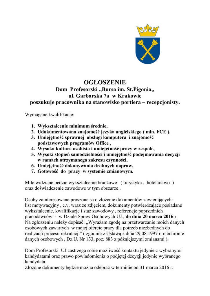 OGŁOSZENIE Dom Profesorski „Bursa im. St.Pigonia„ ul. Garbarska 7a w Krakowie poszukuje pracownika na stanowisko portiera – recepcjonisty. Wymagane kwalifikacje: 1. Wykształcenie minimum średnie, 2. Udokumentowana znajomość języka angielskiego ( min. FCE ), 3. Umiejętność sprawnej obsługi komputera i znajomość podstawowych programów Office , 4. Wysoka kultura osobista i umiejętność pracy w zespole, 5. Wysoki stopień samodzielności i umiejętność podejmowania decyzji w ramach otrzymanego zakresu czynności, 6. Umiejętność dokonywania drobnych napraw, 7. Gotowość do pracy w systemie zmianowym. Mile widziane będzie wykształcenie branżowe ( turystyka , hotelarstwo ) oraz doświadczenie zawodowe w tym obszarze . Osoby zainteresowane proszone są o złożenie dokumentów zawierających: list motywacyjny , c.v. wraz ze zdjęciem, dokumenty potwierdzające posiadane wykształcenie, kwalifikacje i staż zawodowy , referencje poprzednich pracodawców - w Dziale Spraw Osobowych UJ , do dnia 20 marca 2016 r. Na zgłoszeniu należy dopisać: „Wyrażam zgodę na przetwarzanie moich danych osobowych zawartych w mojej ofercie pracy dla potrzeb niezbędnych do realizacji procesu rekrutacji” ( zgodnie z Ustawą z dnia 29.08.1997 r. o ochronie danych osobowych , Dz.U. Nr 133, poz. 883 z późniejszymi zmianami ). Dom Profesorski UJ zastrzega sobie możliwość kontaktu jedynie z wybranymi kandydatami oraz prawo powiadomienia o podjętej decyzji jedynie wybranego kandydata. Złożone dokumenty będzie można odebrać w terminie od 31 marca 2016 r.