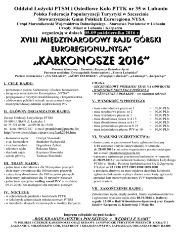 Oddział Łużycki PTSM i Osiedlowe Koło PTTK nr 35 w Lubaniu Polska Federacja Popularyzacji Turystyki w Szczecinie Stowarzyszenie Gmin Polskich Euroregionu NYSA Urząd Marszałkowski Województwa Dolnośląskiego – Starostwo Powiatowe w Lubaniu Urzędy Miast w Lubaniu i Karpaczu organizują w dniach 05-09 października 2016 r. XVIII MIĘDZYNARODOWY RAJD GÓRSKI EUROREGIONU„NYSA” „KARKONOSZE 2016” Patronat Honorowy : Burmistrz Karpacza Radosław Jęcek Patronat medialny: Dwutygodnik Samorządowy „Ziemia Lubańska” Portale internetowe : „NA SZLAKU”, „GÓRY IZERSKIE”, „Przegląd Lubański”, „eLuban.pl”, „karpacz.pl” I. CELE RAJDU: - poznawanie piękna Karkonoszy i Rudaw Janowickich - integracja mieszkańców Euroregionu „NYSA” - propagowanie turystyki kwalifikowanej i krajoznawstwa - zdobywanie polskich odznak turystycznych oraz międzynarodowej odznaki wędrowniczej IVV II. GŁÓWNY ORGANIZATOR RAJDU: Zarząd Oddziału Łużyckiego PTSM 59-800 LUBAŃ ul. Łużycka 1 tel 75 721 6580 od 09:00 do 15:00 tel. kom. 604927247 e-mail: [email protected] http://www.ptsmluban.vipserv.org/kark2016.htm - Komandor rajdu - z-ca komandora - z-ca komandora - sekretarz rajdu - skarbnik rajdu - sędzia główny Henryk Sławiński Stanisław Rutkowski Bogusława Żybort Roksana Sipko Krystyna Sławińska Tadeusz Sławiński III. TRASY RAJDU: - jedna trasa czterodniowa dla 50 turystów pieszych - dwie trasy trzydniowe dla 100 turystów pieszych - cztery trasy dwudniowe dla 180 turystów pieszych - dwie trasy jednodniowe dla 70 turystów pieszych - jedna trasa specjalna według zasad IVV w niedzielę 09.10.2016 (bez noclegów) dla turystów pieszych UWAGA: - SZCZEGÓŁOWY PRZEBIEG TRAS NA ODWROCIE - WSZYSTKIE NOCLEGI Z POŚCIELĄ - WYŻYWIENIE I DOJAZDY – we własnym zakresie V. WYSOKOŚĆ WPISOWEGO: - trasa czterodniowa piesza nr 1 - trasa trzydniowa piesza nr 2 - trasy trzydniowa piesze nr 3 - trasa dwudniowa piesza nr 4 i 5 - trasa dwudniowa piesza nr 6 i 7 - trasa jednodniowa piesza nr 8 i 9 - trasa jednodniowa piesza IVV nr 10 = = = = = = = 130,00 PLN 90,00 PLN 80,00 PLN 50,00 PLN 40,00 PLN 20,00 PLN 10,00 PLN VI. WARUNKI UCZESTNICTWA: - dostarczenie organizatorowi karty zgłoszeń (drużyny 3-10 osobowe i turyści indywidualni) w terminie do 28.09.2016 r. na adres organizatora pocztą tradycyjną lub e-mail: [email protected] - wpłacanie wpisowego przelewem bankowym w terminie do 28.09.2016 r. na rachunek bankowy Oddziału Łużyckiego PTSM w Banku Polskiej Spółdzielczości SA O/Zgorzelec F/Lubań nr 93 1930 1275 2005 0500 1078 0001 - o przyjęciu drużyny na trasy rajdowe decyduje kolejność zgłoszeń (dokonanie wpłaty i dostarczenie karty zgłoszeń) - sprzedaż kart startowych na trasy IVV bezpośrednio przed startem. VII. ZAKOŃCZENIE RAJDU : IV. NOCLEGI: - w schroniskach górskich i bacówkach PTTK - w szkolnych schroniskach młodzieżowych PTSM - w motelach i domach wczasowych w okolicy Karpacza Zakończenie rajdu, ciepły posiłek, finały współzawodnictwa i ogłoszenie wyników rajdu dnia 08.10.2016 r. (sobota) o godz. 15:00 w Hali Widowiskowo-Sportowej przy Zespole Szkół w Karpaczu ul. Konstytucji 3 Maja 48a Impreza odbędzie się pod hasłem „ROK KRAJOZNAWSTWA POLSKIEGO > WĘDRUJ Z NAMI” W POLSKIE I CZESKIE KARKONOSZE ORAZ RUDAWY JANOWICKIE TURYSTÓW PIESZYCH Z KRAJU I ZAGRANICY, MIŁOŚNIKÓW GÓR, PRZYRODY I KRAJOZNAWSTWA ZAPRASZAJĄ ORGANIZATORZY RAJDU R E G U L A M I N R A J D U I. PRZEBIEG TRAS RAJDOWYCH: 1. 4-dniowa: trasa trudna, zalecana dla szkół ponadgimnazjalnych oraz turystów indywidualnych, ilość miejsc: 50, pkt. GOT: 67. Kierownictwo trasy: Alina Pasińska, Paweł Idzik, Zofia Trubisz. Start: 05.10.16 (środa) Karpacz PKS Biały Jar godz. 10:00. Przebieg trasy: Biały Jar – Świątynia Wang - Polana – Pielgrzymy – Schr. PTTK „Odrodzenie” – Petrova Bouda – Hutniczy Grzbiet – Rozdroże pod Śmielcem – Czarna Przełęcz – Martinova Bouda – Fucikovy Bouda – Petrova Bouda – Spindlerova Bouda – Schr. PTTK „Odrodzenie” – Spindlerova Bouda – Bouda u Bileho Labe – Lucni Bouda – Równia pod Śnieżką – Schr. PTTK „Strzecha Akademicka” – Spalona Strażnica – Schr. „Dom Śląski” – Schr. PTTK „Nad Łomniczką” – Karpacz/Biały Jar – Hala Widowiskowo-Sportowa przy ZS w Karpaczu – Karpacz PKP. 2. 3-dniowa: łatwa, zalecana dla szkół podstawowych i gimnazjalnych, ilość miejsc: 50, pkt GOT: 42. Kierownictwo trasy: Danuta Furtak, Henryk Sławiński, Krystyna Sławińska, Start: 06.10.16 (czwartek) Karpacz PKS Biały Jar godz. 10:00. Przebieg trasy: Biały Jar – Świątynia Wang – Polana – Pielgrzymy – Słoneczniki – Spalona Strażnica – Schr. PTTK „Strzecha Akademicka” – Kocioł Białego Jaru – Schr. „Dom Śląski” – Śnieżka – Schr. „Dom Śląski” – Schr. „Nad Łomniczką” – Karpacz/Biały Jar – Dom Wczasowy Mieszko Karpacz/Centrum – Wodospad Łomnicy – Przełączka – Kaplica Św. Anny – Przełęcz pod Czołem – Światynia Wang – Karpacz/Biały Jar – Hala Widowiskowo-Sportowa przy ZS w Karpaczu – Karpacz PKP. 3. 3-dniowa: trasa trudna, zalecana dla szkół gimnazjalnych i ponadgimnazjalnych, ilość miejsc: 50, pkt. GOT: 56. Kierownictwo trasy: Krzysztof Podkowiński, Stanisław Rutkowski, Jacek Sławiński. Start: 06.10.16 (czwartek) Sobieszów PKP godz. 10:00. Przebieg trasy: Sobieszów – Dziurawy Kamień – Zamek Chojnik – Żelazny Mostek – Podzamcze – Podgórzyn Dolny – Podgórzyn Górny – Zbiornik Sosnówka – Marczyce – Grodna – Staniszów – Schr. PTSM Staniszów – Witosza – Mysłakowice/Pałac Cesarski – Mrowiec – Bukowiec/Świątynia Ateny – Schr. PTSM „Skalnik” Bukowiec – przejazd autokarem z Bukowca do Miłkowa – Pałac Miłków – Rozdroże pod Grabowcem – Kaplica Świętej Anny – Przełączka – Karpacz/Biały Jar – Hala Widowiskowo-Sportowa przy ZS w K