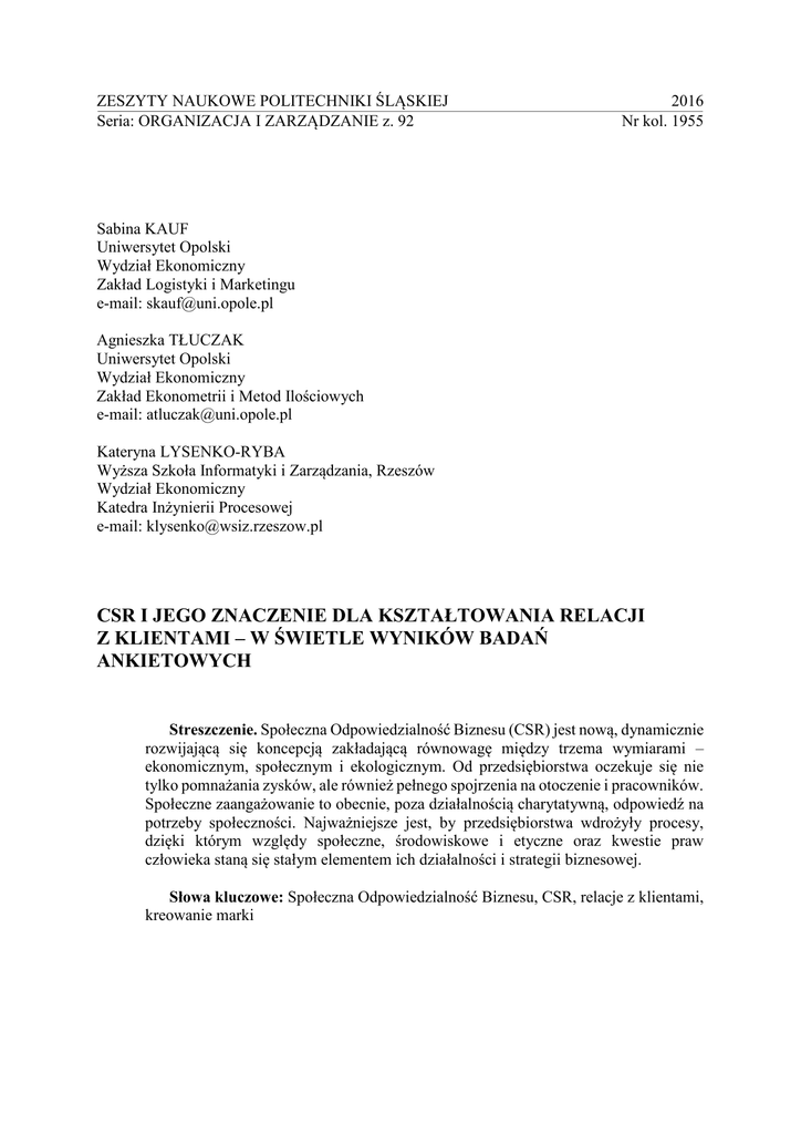 ZESZYTY NAUKOWE POLITECHNIKI ŚLĄSKIEJ Seria: ORGANIZACJA I ZARZĄDZANIE z. 92 2016 Nr kol. 1955 Sabina KAUF Uniwersytet Opolski Wydział Ekonomiczny Zakład Logistyki i Marketingu e-mail: [email protected] Agnieszka TŁUCZAK Uniwersytet Opolski Wydział Ekonomiczny Zakład Ekonometrii i Metod Ilościowych e-mail: [email protected] Kateryna LYSENKO-RYBA Wyższa Szkoła Informatyki i Zarządzania, Rzeszów Wydział Ekonomiczny Katedra Inżynierii Procesowej e-mail: [email protected] CSR I JEGO ZNACZENIE DLA KSZTAŁTOWANIA RELACJI Z KLIENTAMI – W ŚWIETLE WYNIKÓW BADAŃ ANKIETOWYCH Streszczenie. Społeczna Odpowiedzialność Biznesu (CSR) jest nową, dynamicznie rozwijającą się koncepcją zakładającą równowagę między trzema wymiarami – ekonomicznym, społecznym i ekologicznym. Od przedsiębiorstwa oczekuje się nie tylko pomnażania zysków, ale również pełnego spojrzenia na otoczenie i pracowników. Społeczne zaangażowanie to obecnie, poza działalnością charytatywną, odpowiedź na potrzeby społeczności. Najważniejsze jest, by przedsiębiorstwa wdrożyły procesy, dzięki którym względy społeczne, środowiskowe i etyczne oraz kwestie praw człowieka staną się stałym elementem ich działalności i strategii biznesowej. Słowa kluczowe: Społeczna Odpowiedzialność Biznesu, CSR, relacje z klientami, kreowanie marki S. Kauf, A. Tłuczak, K. Lysenko-Ryba 156 CSR AND ITS ROLE IN FORMING RELATIONSHIPS WITH CUSTOMERS – IN THE LIGHT OF SURVEY RESULTS Summary. CSR is becoming the dominant philosophy of doing business, based on social dialogue and listening to the needs of the environment. It reflects the quest for balance between economic, social and ethical sphere of activities of each enterprise. CSR is a concept, that allows to manage business in a social interests way of the enterprise environment. Companies are expected not only to increase profit margins but also think about the environment and workers. Social involvement is currently, out of charity, answer to the needs of the community. The most important is fact, that companies have implemented processes by which social, environmental, ethical considerations and human rights issues would become a regular part of their business and business strategy. Keywords: Corporate Social Responsibility, CSR, customer relationships, branding 1. Wprowadzenie Współczesna rzeczywistość pozwala zauważyć, że prospołeczne i proekologiczne działania przedsiębiorstw wpływają na poprawę wizerunku oraz wzrost społecznej akceptacji, a to przekłada się na wzrost zadowolenia i lojalności klientów. Propagowanie takich działań jak troska o środowisko, dbanie o pracowników i interesariuszy zewnętrznych czy pomoc charytatywna, stymuluje pozytywne emocje klientów, redukują straty reputacyjne, a nawet uniezależniają przedsiębiorstwo od negatywnych skutków zmian gospodarczych i ewentualnego kryzysu. Społeczna Odpowiedzialność Biznesu (CSR) jest nową, dynamicznie rozwijającą się koncepcją bazującą na równowadze między trzema wymiarami – ekonomicznym, społecznym i ekologicznym. Według Komisji Europejskiej CSR to styl zarządzania przedsiębiorstwem polegający na integrowaniu kwestii społecznych, środowiskowych, etycznych i dotyczących praw człowieka z działaniami biznesowym i strategią, we współpracy z interesariuszami. Nadrzędną zasadą CSR jest dobrowolność, polegająca na podejmowaniu działań, których nie regulują zasady etyczne i normy prawne. Przedsiębiorstwa stawiające na koncepcję społecznej odpowiedzialności biznesu budują dobre relację z interesariuszami, podnoszą wartość swojej firmy, wzmacniają przewagę konkurencyjną, polepszają kondycję finansową, zmniejszają ryzyko upadłości. Ponieważ CSR przyczynia się do wzrostu zaufania klientów, przedsiębiorstwo ma stabilniejszą pozycję na rynku, pozytywny wizerunek, a co najważniejsze – posiada zadowolonych pracowników, a to ułatwia pozyskanie i utrzymanie tych najlepszych. CSR i jego znaczenie… 157 CSR pozwala także na poprawę kultury organizacyjnej poprzez podnoszenie standardów postępowania wobec interesariuszy. Dzięki temu zapobiega powstawaniu tzw. złego partnerstwa oraz wzmacnia zaufanie, poczucie odpowiedzialności i przejrzystości dla wszystkich zainteresowanych. Niestety polskie przedsiębiorstwa ciągle jeszcze nie do końca mają świadomość, że CSR to nie tylko zabieg marketingowy, a długofalowa strategia rozwoju, pozwalająca pogodzić interes własny z interesem społecznym. Czym jest zatem CSR? Jakie ma znaczenie dla konsumentów i ich decyzji zakupowych? Jak wpływa na ich lojalność? Poszukiwanie odpowiedzi na tak sformułowane pytania stanowi cel niniejszego artykułu. Do jego realizacji wykorzystane zostały wyniki badań ankietowych dotyczących różnych aspektów Społecznej Odpowiedzialności Biznesu, przeprowadzone na próbie 2842 osób w maju 2015 roku w dwóch regionach Polski o bardzo różnych charakterystykach. Jeden – opolski – charakteryzuje się bliskością do granicy zachodniej oraz wieloletnimi, historycznymi powiązaniami z niemieckim sąsiadem. Region podkarpacki z kolei położony jest na wschodniej granicy Polski, sąsiaduje z Ukrainą i utrzymuje długoletnie kontakty z krajami Wschodu. Badaną próbę stanowiły w 63% kobiety i 37% mężczyźni, 1589 ankietowanych zamieszkiwało województwo opolskie, pozostałe 1253 osoby – województwo podkarpackie. 2. Czym jest społeczna odpowiedzialność i co wiemy o Biznesie Społecznie Odpowiedzialnym (CSR)? Wzrost zainteresowania ideą działań społecznie odpowiedzialnych wymusiła współczesna sytuacja gospodarcza. Obecnie przedsiębiorstwa coraz aktywniej uczestniczą w życiu społecznym i wywierają wpływ na kształt społeczeństwa. Zjawisko to potęguje dynamika procesów komunikacyjnych związanych z rozwojem Internetu i portali społecznościowych. Tam klienci wymieniają się inform