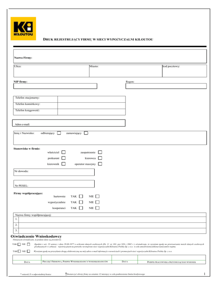 DRUK REJESTRUJĄCY FIRMĘ W SIECI WYPOŻYCZALNI KILOUTOU Nazwa Firmy: Ulica: Miasto: NIP firmy: kod pocztowy: Regon: Telefon stacjonarny: Telefon komórkowy: Telefon księgowość: Adres e-mail: Imię i Nazwisko: odbierający zamawiający : Stanowisko w firmie: właściciel zaopatrzenie prokurent kierowca kierownik operator maszyny Nr dowodu: Nr PESEL: Firmy współpracujące: hurtownie TAK NIE wypożyczalnie TAK NIE kooperanci TAK NIE Nazwa firmy współpracującej: 1. 2. 3. Oświadczenie Wnioskodawcy Niniejszym oświadczam, że podane dane są prawdziwe. TAK NIE Zgodnie z art. 23 ustawy z dnia 29.08.1977 o ochronie danych osobowych (Dz. U. nr 101, poz 926 z 2002 r ) oświadczam, że wyrażam zgodę na przetwarzanie moich danych osobowych przekazanych w arkuszu rejestracyjnym na potrzeby wewnętrzne sieci wypożyczalni Kiloutou Polska Sp. z o.o. w celu umożliwienia dokonywania umów najmu. TAK NIE Wyrażam zgodę na przesyłanie drogą elektroniczną na mój adres e-mail informacji o nowościach i promocjach sieci wypożyczalni Kiloutou Polska Sp. z o.o. DATA PIECZĘĆ FIRMOWA, PODPIS WNIOSKODAWCY/WNIOSKODAWCÓW * wstawić X w odpowiedniej kratce DATA *Dostarczyć obroty firmy za ostatnie 12 miesięcy w celu podniesienia limitu kredytowego PODPIS PRACOWNIKA PRZYJMUJĄCEGO WNIOSEK 1