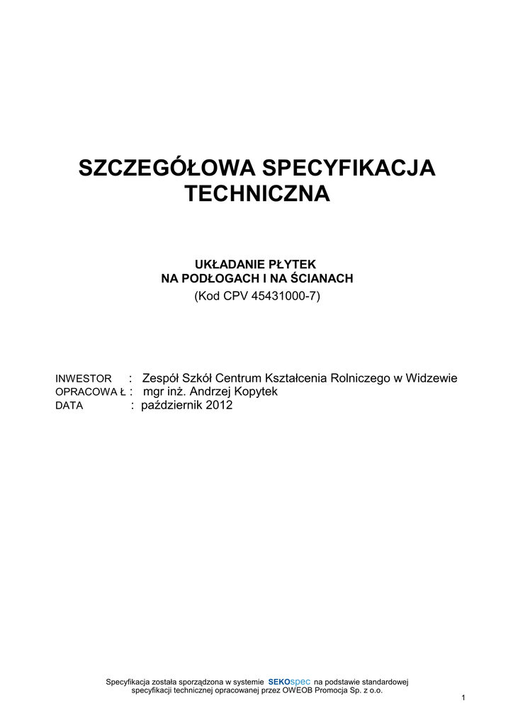 SZCZEGÓŁOWA SPECYFIKACJA TECHNICZNA UKŁADANIE PŁYTEK NA PODŁOGACH I NA ŚCIANACH (Kod CPV 45431000-7) INWESTOR : Zespół Szkół Centrum Kształcenia Rolniczego w Widzewie OPRACOWA Ł : mgr inŜ. Andrzej Kopytek DATA : październik 2012 Specyfikacja została sporządzona w systemie SEKOspec SEKOspec na podstawie standardowej specyfikacji technicznej OWEOB opracowanej Promocjaprzez Sp. zOWEOB o.o. 2005Promocja Sp. z o.o. 1 SPIS TREŚCI WSKAZÓWKI METODYCZNE 1. CZĘŚĆ OGÓLNA 2. WYMAGANIA DOTYCZĄCE WŁAŚCIWOŚCI MATERIAŁÓW 3. WYMAGANIA DOTYCZĄCE SPRZĘTU, MASZYN I NARZĘDZI 4. WYMAGANIA DOTYCZĄCE TRANSPORTU 5. WYMAGANIA DOTYCZĄCE WYKONANIA ROBÓT 6. KONTROLA JAKOŚCI ROBÓT 7. WYMAGANIA DOTYCZĄCE PRZEDMIARU I OBMIARU ROBÓT 8. SPOSÓB ODBIORU ROBÓT 9. PODSTAWA ROZLICZENIA ROBÓT PODSTAWOWYCH, TYMCZASOWYCH I PRAC TOWARZYSZĄCYCH 10. DOKUMENTY ODNIESIENIA NajwaŜniejsze oznaczenia i skróty: ST – Specyfikacja Techniczna SST – Szczegółowa Specyfikacja Techniczna ITB – Instytut Techniki Budowlanej PZJ – Program Zabezpieczenia Jakości Specyfikacja została sporządzona w systemie SEKOspec SEKOspec na podstawie standardowej specyfikacji technicznej OWEOB opracowanej Promocjaprzez Sp. zOWEOB o.o. 2005Promocja Sp. z o.o. 2 1. CZĘŚĆ OGÓLNA 1.1. Nazwa nadana zamówieniu przez zamawiającego PRZEBUDOWA WEWNĘTRZNYCH CIĄGÓW KOMUNIKACYJNYCH II ETAP W BUDYNKU SZKOŁY ZSCKR W WIDZEWIE ..................................................................................... 1.2. Przedmiot SST Przedmiotem niniejszej szczegółowej specyfikacji technicznej (SST) są wymagania dotyczące wykonania i odbioru robót posadzkowych i okładzinowych z płytek przy uŜyciu kompozycji klejowych z mieszanek przygotowanych fabrycznie w pomieszczeniach piwnicy. W tym okładziny schodów ( klatka 1 i 2 ), korytarza, szatni i łazienek w obrębie przebydowywanych wejść. 1.3. Zakres stosowania SST Szczegółowa specyfikacja techniczna (SST) stanowi dokument przetargowy i kontraktowy przy zlecaniu i realizacji robót wymienionych w pkt. 1.2. Odstępstwa od wymagań podanych w niniejszej specyfikacji mogą mieć miejsce tylko w przypadkach prostych robót o niewielkim znaczeniu, dla których istnieje pewność, Ŝe podstawowe wymagania będą spełnione przy zastosowaniu metod wykonania wynikających z doświadczenia oraz uznanych reguł i zasad sztuki budowlanej oraz przy uwzględnieniu przepisów bhp. 1.4. Przedmiot i zakres robót objętych SST Roboty, których dotyczy specyfikacja, obejmują wszystkie czynności mające na celu wykonanie: – pokrycie podłóg płytkami (posadzki), które stanowią wierzchni element warstw podłogowych, – pokrycie ścian płytkami (okładziny), które stanowią warstwę ochronną i kształtującą formę architektoniczną okładanych elementów. Specyfikacja obejmuje wykonanie posadzek i okładzin przy uŜyciu kompozycji klejowych z mieszanek przygotowanych fabrycznie. Zakres opracowania obejmuje określenie wymagań odnośnie własności materiałów, wymagań i sposobów oceny podłoŜy, wykonanie posadzek i okładzin wewnętrznych i zewnętrznych z płytek, oraz ich odbiory. Specyfikacja nie obejmuje wykładzin i okładzin chemoodpornych oraz wykonywanych według metod opatentowanych lub innych zaprojektowanych indywidualnie dla konkretnego obiektu. 1.5. Określenia podstawowe, definicje Określenia podane w niniejszej Specyfikacji są zgodne z odpowiednimi normami oraz określeniami podanymi w ST „Wymagania ogólne” Kod CPV 45000000-7, pkt 1.4, a takŜe podanymi poniŜej: PodłoŜe – element budynku, na powierzchni którego wykonane będą roboty posadzkowe i okładzinowe z płytek. Warstwa wyrównawcza – warstwa wykonana w celu wyeliminowania nierówności lub róŜnic poziomów powierzchni podłoŜa. Warstwa wygładzająca – cienka warstwa wykonana dla uzyskania gładkiej powierzchni podłoŜa. Warstwa gruntująca – powłoka wzmacniająca i uszczelniająca podłoŜe oraz zwiększająca przyczepność powłoki ochronnej. Faseta – wyoblenie wykonane na połączeniu powierzchni poziomych i pionowych. 1.6. Ogólne wymagania dotyczące robót posadzkowych i okładzinowych Wykonawca robót jest odpowiedzialny za jakość ich wykonania oraz za zgodność z dokumentacją projektową, specyfikacjami technicznymi i poleceniami Inspektora nadzoru. Ogólne powszechnie stosowane wymagania dotyczące robót podano w ST „Wymagania ogólne” Specyfikacja została sporządzona w systemie SEKOspec SEKOspec na podstawie standardowej specyfikacji technicznej OWEOB opracowanej Promocjaprzez Sp. zOWEOB o.o. 2005Promocja Sp. z o.o. 3 Kod CPV 45000000-7, pkt. 1.5. 1.7. Dokumentacja robót posadzkowych i okładzinowych Roboty posadzkowe i okładzinowe naleŜy wykonać na podstawie przedmiaru robót i wytycznych ST „Wymagania ogólne” Kod CPV 45000000-7, pkt. 1.6. Przy wykonywaniu tych robót naleŜy wykorzystać takŜe: 1. Załączniki rysunkowe do dokumentacji 2. Polecenia inspektora nadzoru 2. WYMAGANIA DOTYCZĄCE WŁAŚCIWOŚCI MATERIAŁÓW 2.1. Ogólne wymagania dotyczące właściwości materiałów, ich pozyskiwania i składowania podano w ST „Wymagania ogólne” Kod CPV 45000000-7, pkt 2 Wykonawca obowiązany jest posiadać na budowie pełną dokumentację dotyczącą składanych na budowie materiałów przeznaczonych do wykonania robót posadzkowych i okładzinowych. 2.2. Rodzaje materiałów Wszystkie materiały do wykonania robót posadzkowych i okładzinowych z płytek powinny odpowiadać wymaganiom zawartym w dokumentach odniesienia (normach, aprobatach technicznych). 2.2.1.Płyty i płytki Płytki powinny odpowiadać następującej normie: – PN-EN 14411:2005 – Płytki i płyty ceramiczne – Definicja, klasyfikacja, charakterystyki i znakowanie. Na posadzkach stosować płytki gresowe, antypoślizgowe o stopniu min R9, trudnościeralne o klasie min IV i nasiąkliwosci A I. 2.2.2.Kompozycje klejące i zaprawy Kompozycje klejące do 