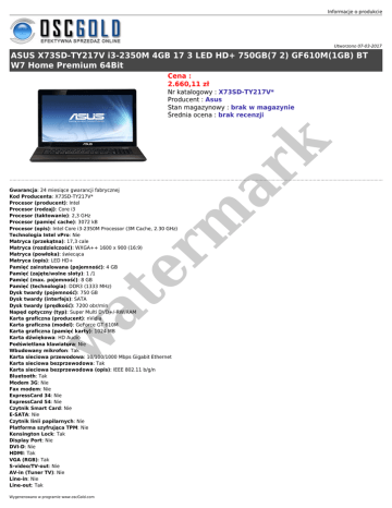 Informacje o produkcie Utworzono 07-03-2017 ASUS X73SD-TY217V i3-2350M 4GB 17 3 LED HD+ 750GB(7 2) GF610M(1GB) BT W7 Home Premium 64Bit Cena : 2.660,11 zł er m ar k Nr katalogowy : X73SD-TY217V* Producent : Asus Stan magazynowy : brak w magazynie Średnia ocena : brak recenzji w at Gwarancja: 24 miesiące gwarancji fabrycznej Kod Producenta: X73SD-TY217V* Procesor (producent): Intel Procesor (rodzaj): Core i3 Procesor (taktowanie): 2,3 GHz Procesor (pamięć cache): 3072 kB Procesor (opis): Intel Core i3-2350M Processor (3M Cache, 2.30 GHz) Technologia Intel vPro: Nie Matryca (przekątna): 17,3 cale Matryca (rozdzielczość): WXGA++ 1600 x 900 (16:9) Matryca (powłoka): świecąca Matryca (opis): LED HD+ Pamięć zainstalowana (pojemność): 4 GB Pamięć (zajęte/wolne sloty): 1 /1 Pamięć (max. pojemność): 8 GB Pamięć (technologia): DDR3 (1333 MHz) Dysk twardy (pojemność): 750 GB Dysk twardy (interfejs): SATA Dysk twardy (prędkość): 7200 obr/min Napęd optyczny (typ): Super Multi DVD+/-RW/RAM Karta graficzna (producent): nVidia Karta graficzna (model): GeForce GT 610M Karta graficzna (pamięć karty): 1024 MB Karta dźwiękowa: HD Audio Podświetlana klawiatura: Nie Wbudowany mikrofon: Tak Karta sieciowa przewodowa: 10/100/1000 Mbps Gigabit Ethernet Karta sieciowa bezprzewodowa: Tak Karta sieciowa bezprzewodowa (opis): IEEE 802.11 b/g/n Bluetooth: Tak Modem 3G: Nie Fax modem: Nie ExpressCard 34: Nie ExpressCard 54: Nie Czytnik Smart Card: Nie E-SATA: Nie Czytnik linii papilarnych: Nie Platforma szyfrująca TPM: Nie Kensington Lock: Tak Display Port: Nie DVI-D: Nie HDMI: Tak VGA (RGB): Tak S-video/TV-out: Nie AV-in (Tuner TV): Nie Line-in: Nie Line-out: Tak Wygenerowano w programie www.oscGold.com w at er m ar k Wejście mikrofonu: Tak S/PDIF: Nie RS232 (szeregowy): Nie Czytnik kart pamięci: Tak Panel klawiszy multimedialnych: Nie Złącze replikatora portów: Nie Fire-Wire (IEEE1394): Nie USB 2.0: 4 szt. System operacyjny: Windows 7 Home Premium 64 bit System operacyjny (wer. Językowa): multilanguage Wbudowana kamera: Tak Wymiary (wysokość): 38 mm Wymiary (szerokość): 420 mm Wymiary (głębokość): 280 mm Waga: 3,2 kg Gwarancja: 24 mies Gwarancja międzynarodowa: Nie Gwarancja baterii: 12 mies Wyposażenie: Zasilacz sieciowy, karta gwarancyjna Opis: * brak raportowania i dodatkowych upustów ze strony ASUS Adres www producenta: Link na stronę opisu technicznego Serwis producenta: Wsparcie Techniczne Asus +48 22 571 80 40 Urządzenie wskazujące: TouchPad