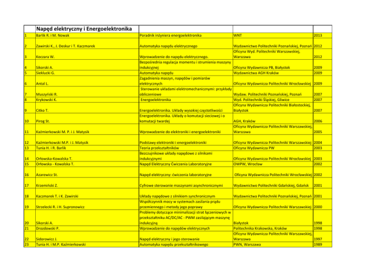 Napęd elektryczny i Energoelektronika 1 Barlik R. i M. Nowak Poradnik inżyniera energoelektronika WNT 2 Zawirski K., J. Deskur i T. Kaczmarek Automatyka napędu elektrycznego 3 Koczara W. 4 5 Sikorski A. Sieklucki G. 6 Antal L. 7 8 Muszyński R. Krykowski K. Wprowadzenie do napędu elektrycznego. Bezpośrednia regulacja momentu i strumienia maszyny indukcyjnej Automatyka napędu Zagadnienia maszyn, napędów i pomiarów elektrycznych Sterowanie układami elektromechanicznymi: przykłady obliczeniowe Energoelektronika Wydawnictwo Politechniki Poznańskiej, Poznań 2012 Oficyna Wyd. Politechniki Warszawskiej, Warszawa 2012 9 Citko T. 10 Pirog St. Energoelektronika. Układy wysokiej częstotliwości Energoelektronika. Układy o komutacji sieciowej i o komutacji twardej 11 Kaźmierkowski M. P. i J. Matysik Wprowadzenie do elektroniki i energoelektroniki 12 13 Kaźmierkowski M.P. i J. Matysik Tunia H. i R. Barlik Oficyna Wydawnicza Politechniki Warszawskiej 2004 Oficyna Wydawnicza PW 2003 14 15 Orłowska-Kowalska T. Orłowska - Kowalska T. Podstawy elektroniki i energoelektroniki Teoria przekształtników Bezczujnikowe układy napędowe z silnikami indukcyjnymi Napęd Elektryczny Ćwiczenia Laboratoryjne 16 Azarewicz St. Napęd elektryczny: ćwiczenia laboratoryjne Oficyna Wydawnicza Politechniki Wrocławskiej 2002 17 Krzemiński Z. Cyfrowe sterowanie maszynami asynchronicznymi Wydawnictwo Politechniki Gdańskiej, Gdańsk 18 Kaczmarek T. i K. Zawirski Wydawnictwa Politechniki Poznańskiej, Poznań 2001 19 Strzelecki R. i H. Supronowicz 20 21 Sikorski A. Drozdowski P. Układy napędowe z silnikiem synchronicznym Współczynnik mocy w systemach zasilania prądu przemiennego i metody jego poprawy Problemy dotyczące minimalizacji strat łączeniowych w przekształtniku AC/DC/AC - PWM zasilającym maszynę indukcyjną Wprowadzenie do napędów elektrycznych 22 23 Sidorowicz J. Tunia H. i M.P. Kaźmierkowski Napęd elektryczny i jego sterowanie Automatyka napędu przekształtnikowego Oficyna Wydawnicza PB, Białystok Wydawnictwa AGH Kraków 2013 2009 2009 Oficyna Wydawnicza Politechniki Wrocławskiej 2009 Wydaw. Politechniki Poznańskiej, Poznań 2007 Wyd. Politechniki Śląskiej, Gliwice 2007 Oficyna Wydawnicza Politechniki Białostockiej, Białystok 2007 AGH, Kraków 2006 Oficyna Wydawnicza Politechniki Warszawskiej, Warszawa 2005 Oficyna Wydawnicza Politechniki Wrocławskiej 2003 OWPW, Wrocław 2002 2001 Oficyna Wydawnicza Politechniki Warszawskiej 2000 Białystok Politechnika Krakowska, Kraków Oficyna Wydawnicza Politechniki Warszawskiej, Warszawa PWN, Warszawa 1998 1998 1997 1989 24 25 26 27 28 29 30 31 32 33 34 35 Bisztyga K. Grunwald Z. Koczara W. Tunia H. i B. Winiarski 36 37 38 39 40 41 Szklarski L. Szklarski L. Kosonocki E. i inni 42 Praca zbiorowa Krasucki F. Manitius J. Piątkiewicz A. Manitius J. Gogolewski Z. i Z. Kuczewski Gogolewski Z. i Z. Kuczewski Manitius J. Kosonocki E., J. Manitius, L. Szklarski i Wł. Sztwiertnia Sterowanie i regulacja silników elektrycznych Napęd elektryczny Kaskadowe układy napędowe Podstawy energoelektroniki Projektowanie przekształtników tyrystorowych Urządzenia elektryczne w górnictwie. Cz. 1 i 2 Hutnicze napędy elektryczne. Cz.1 Dźwigi elektryczne Hutnicze napędy elektryczne. Cz.1 Napęd elektryczny. Wyd.5 Napęd elektryczny Hutnicze napędy elektryczne. Cz.1 Napędy elektryczne maszyn wyciągowych. Wyd.2 popr. Cz.1-2 Napędy elektryczne maszyn wyciągowych. Cz. 1 Napędy elektryczne maszyn wyciągowych. Cz.1-2 Napędy elektryczne maszyn wyciągowych. Cz.2 Napędy elektryczne maszyn wyciągowych. Cz.1 Napędy elektryczne maszyn wyciągowych. Cz.1 Hutnicze napędy elektryczne. Wydanie jedno- i dwutomowe WNT, Warszawa PWN, Warszawa Warszawa Warszawa Warszawa Wyd. Pol. Śl. Gliwice Kraków Warszawa Katowice Warszawa WNT, Warszawa Katowice 1989 1987 1978 1975 1974 1974 1973 1972 1972 1972 1972 1969 Warszawa PWN, Kraków Kraków Kraków Kraków PWN, Kraków 1966 1966 1957 1957 1957 1957