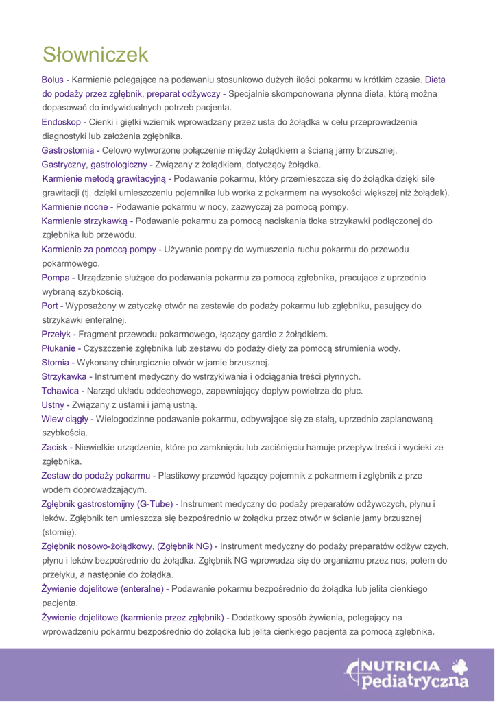 Słowniczek Bolus - Karmienie polegające na podawaniu stosunkowo dużych ilości pokarmu w krótkim czasie. Dieta do podaży przez zgłębnik, preparat odżywczy - Specjalnie skomponowana płynna dieta, którą można dopasować do indywidualnych potrzeb pacjenta. Endoskop - Cienki i giętki wziernik wprowadzany przez usta do żołądka w celu przeprowadzenia diagnostyki lub założenia zgłębnika. Gastrostomia - Celowo wytworzone połączenie między żołądkiem a ścianą jamy brzusznej. Gastryczny, gastrologiczny - Związany z żołądkiem, dotyczący żołądka. Karmienie metodą grawitacyjną - Podawanie pokarmu, który przemieszcza się do żołądka dzięki sile grawitacji (tj. dzięki umieszczeniu pojemnika lub worka z pokarmem na wysokości większej niż żołądek). Karmienie nocne - Podawanie pokarmu w nocy, zazwyczaj za pomocą pompy. Karmienie strzykawką - Podawanie pokarmu za pomocą naciskania tłoka strzykawki podłączonej do zgłębnika lub przewodu. Karmienie za pomocą pompy - Używanie pompy do wymuszenia ruchu pokarmu do przewodu pokarmowego. Pompa - Urządzenie służące do podawania pokarmu za pomocą zgłębnika, pracujące z uprzednio wybraną szybkością. Port - Wyposażony w zatyczkę otwór na zestawie do podaży pokarmu lub zgłębniku, pasujący do strzykawki enteralnej. Przełyk - Fragment przewodu pokarmowego, łączący gardło z żołądkiem. Płukanie - Czyszczenie zgłębnika lub zestawu do podaży diety za pomocą strumienia wody. Stomia - Wykonany chirurgicznie otwór w jamie brzusznej. Strzykawka - Instrument medyczny do wstrzykiwania i odciągania treści płynnych. Tchawica - Narząd układu oddechowego, zapewniający dopływ powietrza do płuc. Ustny - Związany z ustami i jamą ustną. Wlew ciągły - Wielogodzinne podawanie pokarmu, odbywające się ze stałą, uprzednio zaplanowaną szybkością. Zacisk - Niewielkie urządzenie, które po zamknięciu lub zaciśnięciu hamuje przepływ treści i wycieki ze zgłębnika. Zestaw do podaży pokarmu - Plastikowy przewód łączący pojemnik z pokarmem i zgłębnik z prze wodem doprowadzającym. Zgłębnik gastrostomijny (G-Tube) - Instrument medyczny do podaży preparatów odżywczych, płynu i leków. Zgłębnik ten umieszcza się bezpośrednio w żołądku przez otwór w ścianie jamy brzusznej (stomię). Zgłębnik nosowo-żołądkowy, (Zgłębnik NG) - Instrument medyczny do podaży preparatów odżyw czych, płynu i leków bezpośrednio do żołądka. Zgłębnik NG wprowadza się do organizmu przez nos, potem do przełyku, a następnie do żołądka. Żywienie dojelitowe (enteralne) - Podawanie pokarmu bezpośrednio do żołądka lub jelita cienkiego pacjenta. Żywienie dojelitowe (karmienie przez zgłębnik) - Dodatkowy sposób żywienia, polegający na wprowadzeniu pokarmu bezpośrednio do żołądka lub jelita cienkiego pacjenta za pomocą zgłębnika.