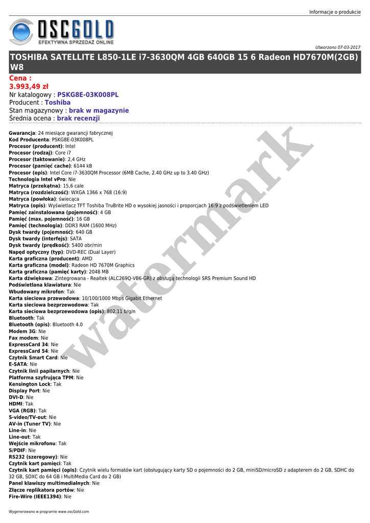 Informacje o produkcie Utworzono 07-03-2017 TOSHIBA SATELLITE L850-1LE i7-3630QM 4GB 640GB 15 6 Radeon HD7670M(2GB) W8 Cena : 3.993,49 zł Nr katalogowy : PSKG8E-03K008PL Producent : Toshiba Stan magazynowy : brak w magazynie Średnia ocena : brak recenzji w at er m ar k Gwarancja: 24 miesiące gwarancji fabrycznej Kod Producenta: PSKG8E-03K008PL Procesor (producent): Intel Procesor (rodzaj): Core i7 Procesor (taktowanie): 2,4 GHz Procesor (pamięć cache): 6144 kB Procesor (opis): Intel Core i7-3630QM Processor (6MB Cache, 2.40 GHz up to 3.40 GHz) Technologia Intel vPro: Nie Matryca (przekątna): 15,6 cale Matryca (rozdzielczość): WXGA 1366 x 768 (16:9) Matryca (powłoka): świecąca Matryca (opis): Wyświetlacz TFT Toshiba TruBrite HD o wysokiej jasności i proporcjach 16:9 z podświetleniem LED Pamięć zainstalowana (pojemność): 4 GB Pamięć (max. pojemność): 16 GB Pamięć (technologia): DDR3 RAM (1600 MHz) Dysk twardy (pojemność): 640 GB Dysk twardy (interfejs): SATA Dysk twardy (prędkość): 5400 obr/min Napęd optyczny (typ): DVD-REC (Dual Layer) Karta graficzna (producent): AMD Karta graficzna (model): Radeon HD 7670M Graphics Karta graficzna (pamięć karty): 2048 MB Karta dźwiękowa: Zintegrowana - Realtek (ALC269Q-VB6-GR) z obsługą technologii SRS Premium Sound HD Podświetlana klawiatura: Nie Wbudowany mikrofon: Tak Karta sieciowa przewodowa: 10/100/1000 Mbps Gigabit Ethernet Karta sieciowa bezprzewodowa: Tak Karta sieciowa bezprzewodowa (opis): 802.11 b/g/n Bluetooth: Tak Bluetooth (opis): Bluetooth 4.0 Modem 3G: Nie Fax modem: Nie ExpressCard 34: Nie ExpressCard 54: Nie Czytnik Smart Card: Nie E-SATA: Nie Czytnik linii papilarnych: Nie Platforma szyfrująca TPM: Nie Kensington Lock: Tak Display Port: Nie DVI-D: Nie HDMI: Tak VGA (RGB): Tak S-video/TV-out: Nie AV-in (Tuner TV): Nie Line-in: Nie Line-out: Tak Wejście mikrofonu: Tak S/PDIF: Nie RS232 (szeregowy): Nie Czytnik kart pamięci: Tak Czytnik kart pamięci (opis): Czytnik wielu formatów kart (obsługujący karty SD o pojemności do 2 GB, miniSD/microSD z adapterem do 2 GB, SDHC do 32 GB, SDXC do 64 GB i MultiMedia Card do 2 GB) Panel klawiszy multimedialnych: Nie Złącze replikatora portów: Nie Fire-Wire (IEEE1394): Nie Wygenerowano w programie www.oscGold.com w at er m ar k USB 2.0: 1 szt. USB 3.0: 2 szt. System operacyjny: Windows 8 64 bit System operacyjny (wer. Językowa): polski Dodatkowe oprogramowanie: Microsoft FreshPaint, Microsoft Solitair Collection, Nero 12 Essentials, Microsoft Office trial, McAfee Security Advisor for Toshiba, McAfee Internet Security (includes complimentary 30 day subscription) , oprogramowania Toshiba Wbudowana kamera: Tak Wbudowana kamera (opis): Zintegrowana kamera internetowa HD o rozdzielczości 1 megapiksela (1280 x 800) z wbudowanym mikrofonem Wbudowana kamera obrotowa: Nie Urządzenie wskazujące: Płytka dotykowa Touch-Pad z funkcją Multi-Touch z różnymi funkcjami przewijania, powiększania i uruchamiania. Akumulator (technologia): Litowo-jonowy Akumulator (czas pracy): 4,5 h Wymiary (wysokość): 33,52 mm Wymiary (szerokość): 380 mm Wymiary (głębokość): 242 mm Waga: 2,3 kg Gwarancja: 24 mies Gwarancja międzynarodowa: Tak Gwarancja baterii: 6 mies Wyposażenie: Zasilacz prądu przemiennego Opis: Kolor : Matowe i błyszczące wykończenie w kolorze perłowej bieli ze wzorem krzyżujących się linii, biała klawiatura Adres www producenta: Link na stronę opisu technicznego