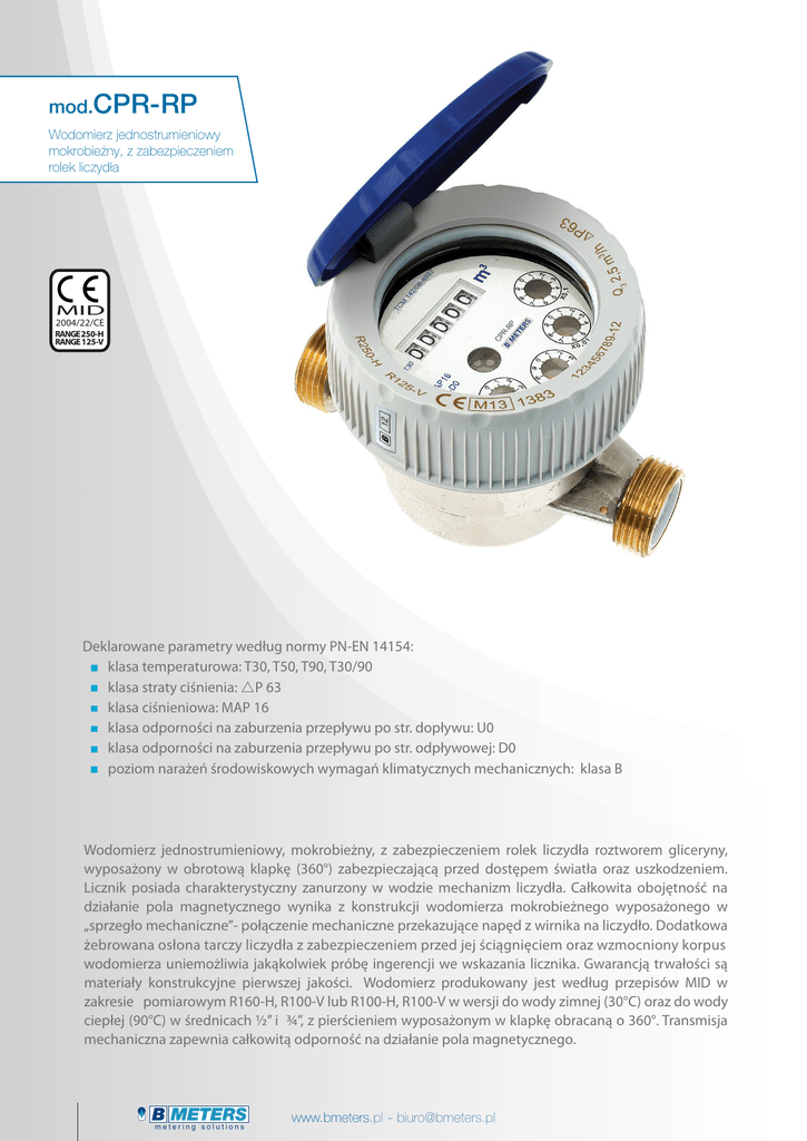 mod.CPR-RP Wodomierz jednostrumieniowy mokrobieżny, z zabezpieczeniem rolek liczydła MID 2004/22/CE RANGE 250-H RANGE 125-V Deklarowane parametry według normy PN-EN 14154: klasa temperaturowa: T30, T50, T90, T30/90 klasa straty ciśnienia: P 63 klasa ciśnieniowa: MAP 16 klasa odporności na zaburzenia przepływu po str. dopływu: U0 klasa odporności na zaburzenia przepływu po str. odpływowej: D0 poziom narażeń środowiskowych wymagań klimatycznych mechanicznych: klasa B Wodomierz jednostrumieniowy, mokrobieżny, z zabezpieczeniem rolek liczydła roztworem gliceryny, wyposażony w obrotową klapkę (360°) zabezpieczającą przed dostępem światła oraz uszkodzeniem. Licznik posiada charakterystyczny zanurzony w wodzie mechanizm liczydła. Całkowita obojętność na działanie pola magnetycznego wynika z konstrukcji wodomierza mokrobieżnego wyposażonego w „sprzegło mechaniczne”- połączenie mechaniczne przekazujące napęd z wirnika na liczydło. Dodatkowa żebrowana osłona tarczy liczydła z zabezpieczeniem przed jej ściągnięciem oraz wzmocniony korpus wodomierza uniemożliwia jakąkolwiek próbę ingerencji we wskazania licznika. Gwarancją trwałości są materiały konstrukcyjne pierwszej jakości. Wodomierz produkowany jest według przepisów MID w zakresie pomiarowym R160-H, R100-V lub R100-H, R100-V w wersji do wody zimnej (30°C) oraz do wody ciepłej (90°C) w średnicach ½’’ i ¾’’, z pierścieniem wyposażonym w klapkę obracaną o 360°. Transmisja mechaniczna zapewnia całkowitą odporność na działanie pola magnetycznego. metering solutions www.bmeters. -- [email protected] www.bmeters.pl Dane techniczne wodomierza CPR-RP R = 160 R = 100 Średnica DN mm in 15 (1/2") 15 (1/2") 20 (3/4") Przepływ maksymalny Q4 m3/h 2.0 3.125 5 Ciągły strumień objętości Q3 m3/h 1.6 2.5 4 Pośredni strumień objętości Q2 l/h 25 40 64 Minimalny strumień objętości Q1 l/h 16 25 40 Pośredni strumień objętości Q2 l/h 25 40 Minimalny strumień objętości Q1 l/h 16 25 Odczyt minimalny l 0,05 Odczyt maksymalny m3 99.999 Maksymalne dopuszczalne ciśnienie bar 16 MID ≤R160-H, ≤R100-V Zimna woda 0°C ÷30°C, Ciepła woda 30° C÷9 0°C , Transmisja mechaniczna, Odczyt bezpośredni z liczydła zabezpieczonego roztworem gliceryny, Mokrobieżny Wymiary i waga Plastikowa pokrywka Plastic Lid Pierścień zabezpieczający 360° Antifrodable ring rotable 360° +5 Mosiężny pierścień zamykający Brass sealing +2 ring Szkło Glass 20 (3/4”) L mm 110 130 I mm 190 228 H mm 86 86 h mm 23 23 B mm 82 82 Rozmiar d ze śrubunkami Waga bez śrubunków in 3/4" 1" kg 0,83 1,01 kg 0,69 0,80 Typowa krzywa błędów wirnika wodomierza -5 Mosiężny korpus Brass body 0 -5 Qmin Qt Qmax Qn Strata ciśnień wodomierza dla średnicy DN 15 lub 20 DN15 DN20 0,06 PERDITA DI CARICO STRATA CIŚNIENIA -2 Q3 Uszczelka Gasket Regulator przepływu Flux regulator Filtr Strainer -2 0 Q2 Q4 Sworzeń Pivot bar 1 Q1 Q3 +2 0,5 0 bar 1 0,05 0,04 0,03 0,02 0,01 0 Q4 www.bmeters.pl - [email protected] O BŁĄD % Q2 +5 +2 +5 Q1 Wirnik Turbine +5 -5 Liczydło Totalising mechanism PRESSURE LOSS 15 (1/2") 1 2 3 PRZEPŁYW m3/h 4 5 DN15 0,06 metering solutions O mm in 0 -2