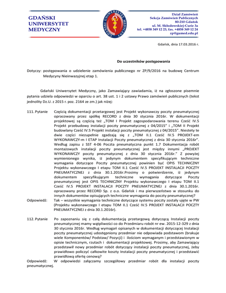 GDAŃSKI UNIWERSYTET MEDYCZNY Dział Zamówień Sekcja Zamówień Publicznych 80-210 Gdańsk ul. M. Skłodowskiej-Curie 3a tel. +4858 349 12 23, fax. +4858 349 12 24 [email protected] Gdańsk, dnia 17.03.2016 r. Do uczestników postępowania Dotyczy: postępowania o udzielenie zamówienia publicznego nr ZP/9/2016 na budowę Centrum Medycyny Nieinwazyjnej etap 1. Gdański Uniwersytet Medyczny, jako Zamawiający zawiadamia, iż na zgłoszone pisemnie pytania udziela odpowiedzi w oparciu o art. 38 ust. 1 i 2 ustawy Prawo zamówień publicznych (tekst jednolity Dz.U. z 2015 r. poz. 2164 ze zm.) jak niżej: 111. Pytanie Odpowiedź: 112. Pytanie Częścią dokumentacji przetargowej jest Projekt wykonawczy poczty pneumatycznej opracowany przez spółkę RECORD z dnia 30 stycznia 2016r. W dokumentacji projektowej są częścią też „TOM I Projekt zagospodarowania terenu Cześć IV.5 Projekt przebudowy instalacji poczty pneumatycznej z 04/2015” i „TOM II Projekt budowlany Cześć IV.5 Projekt instalacji poczty pneumatycznej z 04/2015”. Niestety te dwie części niezupełnie zgadzają się z „TOM II.1 Cześć IV.5 PROJEKT-em WYKONAWCZY-m I ETAP Instalacji Poczty pneumatycznej z dnia 30 stycznia 2016r”. Według zapisu z SST 4-06 Poczta pneumatyczna punkt 1.7 Dokumentacja robót montażowych instalacji poczty pneumatycznej jest między innymi „PROJEKT WYKONAWCZY poczty pneumatycznej z dnia 30 stycznia 2016r.” Z powyżej wymienionego wynika, iż jedynym dokumentem specyfikującym techniczne wymagania dotyczące Poczty pneumatycznej powinien być OPIS TECHNICZNY Projektu wykonawczego I etapu TOM II.1 Cześć IV.5 PROJEKT INSTALACJI POCZTY PNEUMATYCZNEJ z dnia 30.1.2016r.Prosimy o potwierdzenie, iż jedynym dokumentem specyfikującym techniczne wymagania dotyczące Poczty pneumatycznej jest OPIS TECHNICZNY Projektu wykonawczego I etapu TOM II.1 Cześć IV.5 PROJEKT INSTALACJI POCZTY PNEUMATYCZNEJ z dnia 30.1.2016r. opracowany przez RECORD Sp. z o.o. Gdańsk i ma pierwszeństwo w stosunku do innych dokumentów opisujących techniczne wymagania do poczty pneumatycznej? Tak – wszystkie wymagania techniczne dotyczące systemu poczty zostały ujęte w PW (Projektu wykonawczego I etapu TOM II.1 Cześć IV.5 PROJEKT INSTALACJI POCZTY PNEUMATYCZNEJ z dnia 30.1.2016r). Po zapoznaniu się z całą dokumentacją przetargową dotyczącą Instalacji poczty pneumatycznej mamy wątpliwości co do Przedmiaru robót nr ew. 2015-12-329 z dnia 30 stycznia 2016r. Według wymagań opisanych w dokumentacji dotyczącej Instalacji poczty pneumatycznej udostępniony przedmiar nie odpowiada podstawom (brakuje wiele Komponentów/ Podstaw/ Pozycji) i ilościom wymaganym i przedstawionym w opisie technicznym, rzutach i dokumentacji projektowej. Prosimy, aby Zamawiający przedstawił nowy przedmiar robót dotyczący instalacji poczty pneumatycznej, żeby prawidłowo policzyć całkowite koszty Instalacji poczty pneumatycznej i przedstawić prawidłową ofertę cenową? Odpowiedź: W odpowiedzi załączamy szczegółowy przedmiar robót dla instalacji poczty pneumatycznej. 113. Pytanie Odpowiedź: 114. Pytanie Odpowiedź: 115. Pytanie Odpowiedź: 116. Pytanie Odpowiedź: 117. Pytanie Odpowiedź: 118. Pytanie Odpowiedź: Z dokumentacji przetargowej wynika, iż wszystkie oferowane systemy poczty pneumatycznej (dla transportu próbek/leków/tkanek/w laboratorium) powinny być połączone z istniejącymi systemami poczty pneumatycznej w budynkach UCK Gdańsk i Centrum Medycyny Nieinwazyjnej. Rozumiemy prawidłowo, iż wszystkie nowo budowane systemy poczty pneumatycznej (dla transportu próbek/leków/tkanek/w laboratorium) będą połączone z istniejącymi systemami poczty pneumatycznej z powodu przesyłania pojemników pomiędzy wszystkimi stacjami i oddziałami i sterowane jedną jednostką sterującą tak jak jest opisane w OPISIE TECHNICZNYM Projektu wykonawczego I etapu TOM II.1 Cześć IV.5 PROJEKT INSTALACJI POCZTY PNEUMATYCZNEJ z dnia 30.1.2016r.? Tak – potwierdzamy. Zwracamy się z prośbą o wyjaśnienie, czy technologia kuchni wchodzi w zakres zamówienia. Jeżeli tak to prosimy o przesłanie opisu i specyfikacji sprzętu do technologii kuchni. Technologia kuchni nie wchodzi w zakres zamówienia. Dotyczy pokrycia dachu D-1 i D-1 dla drogi transportowej. W przedmiarze architektury (poz. 687, 694) widnieje włóknina syntetyczna- włóknina szklana, natomiast na przekrojach oraz w opisie warstw dachu D-1 brak takiego elementu. Prosimy o wyjaśnienie. W warstwach dachu D1 pod warstwą membrany wykonać geowłókninę dopuszczoną przez systemodawcę izolacji przeciwwodnej, geowłóknina o gęstości min. 300g/m3 np: Sika Sarnafelt lub równoważna. Dotyczy pokrycia dachu D-1 droga transportowa. W przedmiarze architektury ( poz. 697) widnieje pozycja "pokrycie dachów papą termozgrzewalną jednowarstwowe (...)", natomiast na przekrojach oraz w opisie warstw pokrycia D-1 brak takiego elementu. Prosimy o wyjaśnienie. Warstwę pokrycia dachowego D-1 wykonać wg. opisu architektury oraz przekrojów z uwzględnieniem geowłókniny systemowej np: Sika Sarnafelt lub równoważnej. Dotyczy pokrycia dachu D-1.1 oraz D-1.2. W przedmiarze architektury dla poz. 702 i 712 opisano izolację z płyt styropianowych grubości 16cm, natomiast w projekcie i przekroju opisano jako izolację z płyt styropianowych grubości 18cm. Prosimy o wyjaśnienie. Izolacje termiczne dachu D-1.1 i D-1.2 wykonać zgodnie z projektem z polistyrenu ekstrudowanego XPS - W warstwie D1 gr.16 cm, w warstwie D2 gr 18cm. Dotyczy pokrycia dachu D-2. a) Na przekroju P-P (rys. PW1_A13) w opisie warstw widnieją takie warstwy jak warstwa podkładowa wyrównawcza z poliestru np. SIKA S-FELT T300 lub równoważna i folia budowlana PE. Brak tych warstw w opisie architektury str.60 oraz w przedmiarze. b) Dla warstwy spadkowej betonowej dylatowanej dla przekroju P-P opisano grubość jako 8-20cm, natomiast w opisie technicznym str. 60 warstwa ta została o
