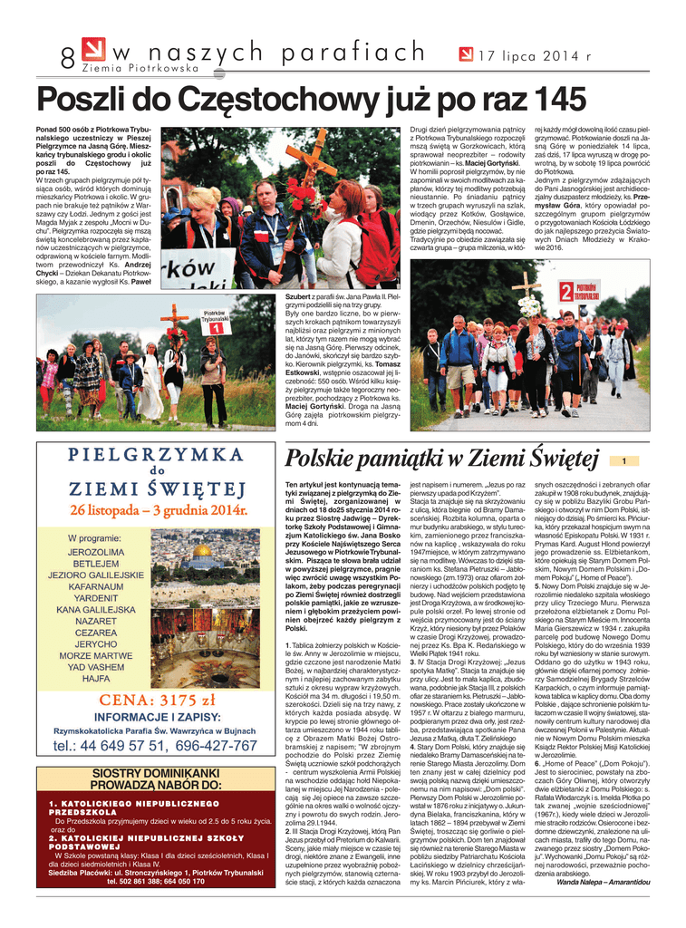 8 w naszych parafiach Poszli do Częstochowy już po raz 145 17 lipca 2014 r Ziemia Piotrkowska Drugi dzień pielgrzymowania pątnicy z Piotrkowa Trybunalskiego rozpoczęli mszą świętą w Gorzkowicach, którą sprawował neoprezbiter – rodowity piotrkowianin – ks.Maciej Gortyński. W homilii poprosił pielgrzymów, by nie zapominali w swoich modlitwach za kapłanów, którzy tej modlitwy potrzebują nieustannie. Po śniadaniu pątnicy w trzech grupach wyruszyli na szlak, wiodący przez Kotków, Gosłąwice, Dmenin, Orzechów, Niesulów i Gidle, gdzie pielgrzymi będą nocować. Tradycyjnie po obiedzie zawiązała się czwarta grupa – grupa milczenia, w któ- Ponad 500 osób z Piotrkowa Trybunalskiego uczestniczy w Pieszej Pielgrzymce na Jasną Górę. Mieszkańcy trybunalskiego grodu i okolic poszli do Częstochowy już po raz 145. W trzech grupach pielgrzymuje pół tysiąca osób, wśród których dominują mieszkańcy Piotrkowa i okolic. W grupach nie brakuje też pątników z Warszawy czy Łodzi. Jednym z gości jest Magda Myjak z zespołu „Mocni w Duchu”. Pielgrzymka rozpoczęła się mszą świętą koncelebrowaną przez kapłanów uczestniczących w pielgrzymce, odprawioną w kościele farnym. Modlitwom przewodniczył Ks. Andrzej Chycki – Dziekan Dekanatu Piotrkowskiego, a kazanie wygłosił Ks. Paweł rej każdy mógł dowolną ilość czasu pielgrzymować. Piotrkowianie doszli na Jasną Górę w poniedziałek 14 lipca, zaś dziś, 17 lipca wyruszą w drogę powrotną, by w sobotę 19 lipca powrócić do Piotrkowa. Jednym z pielgrzymów zdążających do Pani Jasnogórskiej jest archidiecezjalny duszpasterz młodzieży, ks. Przemysław Góra, który opowiadał poszczególnym grupom pielgrzymów o przygotowaniach Kościoła Łódzkiego do jak najlepszego przeżycia Światowych Dniach Młodzieży w Krakowie 2016. Szubert z parafii św. Jana Pawła II. Pielgrzymi podzielili się na trzy grupy. Były one bardzo liczne, bo w pierwszych krokach pątnikom towarzyszyli najbliżsi oraz pielgrzymi z minionych lat, którzy tym razem nie mogą wybrać się na Jasną Górę. Pierwszy odcinek, do Janówki, skończył się bardzo szybko. Kierownik pielgrzymki, ks. Tomasz Estkowski, wstępnie oszacował jej liczebność: 550 osób. Wśród kilku księży pielgrzymuje także tegoroczny neoprezbiter, pochodzący z Piotrkowa ks. Maciej Gortyński. Droga na Jasną Górę zajęła piotrkowskim pielgrzymom 4 dni. Polskie pamiątki w Ziemi Świętej Ten artykuł jest kontynuacją tematyki związanej z pielgrzymką do Ziemi Świętej, zorganizowanej w dniach od 18 do25 stycznia 2014 roku przez Siostrę Jadwigę – Dyrektorkę Szkoły Podstawowej i Gimnazjum Katolickiego św. Jana Bosko przy Kościele Najświętszego Serca Jezusowego w Piotrkowie Trybunalskim. Pisząca te słowa brała udział w powyższej pielgrzymce, pragnie więc zwrócić uwagę wszystkim Polakom, żeby podczas peregrynacji po Ziemi Świętej również dostrzegli polskie pamiątki, jakie ze wzruszeniem i głębokim przeżyciem powinien obejrzeć każdy pielgrzym z Polski. SIOSTRY DOMINIKANKI PROWADZĄ NABÓR DO: 1. KATOLICKIEGO NIEPUBLICZNEGO PRZEDSZKOLA Do Przedszkola przyjmujemy dzieci w wieku od 2.5 do 5 roku życia. oraz do 2. KATOLICKIEJ NIEPUBLICZNEJ SZKOŁY PODSTAWOWEJ W Szkole powstaną klasy: Klasa I dla dzieci sześcioletnich, Klasa I dla dzieci siedmioletnich i Klasa IV. Siedziba Placówki: ul. Stronczyńskiego 1, Piotrków Trybunalski tel. 502 861 388; 664 050 170 1. Tablica żołnierzy polskich w Kościele św. Anny w Jerozolimie w miejscu, gdzie czczone jest narodzenie Matki Bożej, w najbardziej charakterystycznym i najlepiej zachowanym zabytku sztuki z okresu wypraw krzyżowych. Kościół ma 34 m. długości i 19,50 m. szerokości. Dzieli się na trzy nawy, z których każda posiada absydę. W krypcie po lewej stronie głównego ołtarza umieszczono w 1944 roku tablicę z Obrazem Matki Bożej Ostrobramskiej z napisem; ”W zbrojnym pochodzie do Polski przez Ziemię Świętą uczniowie szkół podchorążych - centrum wyszkolenia Armii Polskiej na wschodzie oddając hołd Niepokalanej w miejscu Jej Narodzenia - polecają się Jej opiece na zawsze szczególnie na okres walki o wolność ojczyzny i powrotu do swych rodzin. Jerozolima 29.I.1944. 2. III Stacja Drogi Krzyżowej, którą Pan Jezus przebył od Pretorium do Kalwarii. Sceny, jakie miały miejsce w czasie tej drogi, niektóre znane z Ewangelii, inne uzupełnione przez wyobraźnię pobożnych pielgrzymów, stanowią czternaście stacji, z których każda oznaczona jest napisem i numerem. „Jezus po raz pierwszy upada pod Krzyżem”. Stacja ta znajduje się na skrzyżowaniu z ulicą, która biegnie od Bramy Damasceńskiej. Rozbita kolumna, oparta o mur budynku arabskiego, w stylu tureckim, zamienionego przez franciszkanów na kaplicę , wskazywała do roku 1947miejsce, w którym zatrzymywano się na modlitwę.Wówczas to dzięki staraniom ks. Stefana Pietruszki – Jabłonowskiego (zm.1973) oraz ofiarom żołnierzy i uchodźców polskich podjęto tę budowę. Nad wejściem przedstawiona jest Droga Krzyżowa, a w środkowej kopule polski orzeł. Po lewej stronie od wejścia przymocowany jest do ściany Krzyż, który niesiony był przez Polaków w czasie Drogi Krzyżowej, prowadzonej przez Ks. Bpa K. Redańskiego w Wielki Piątek 1941 roku. 3. IV Stacja Drogi Krzyżowej: „Jezus spotyka Matkę”. Stacja ta znajduje się przy ulicy. Jest to mała kaplica, zbudowana, podobnie jak Stacja III, z polskich ofiar ze staraniem ks.Pietruszki – Jabłonowskiego. Prace zostały ukończone w 1957 r. W ołtarzu z białego marmuru, podpieranym przez dwa orły, jest rzeźba, przedstawiająca spotkanie Pana Jezusa z Matką, dłuta T. Zielińskiego 4. Stary Dom Polski, który znajduje się niedaleko Bramy Damasceńskiej na terenie Starego Miasta Jerozolimy. Dom ten znany jest w całej dzielnicy pod swoją polską nazwą dzięki umieszczonemu na nim napisowi: 