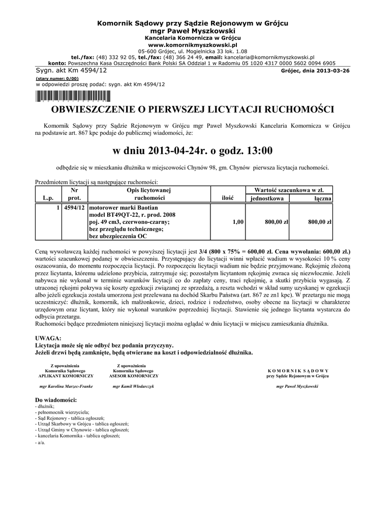 Komornik Sądowy przy Sądzie Rejonowym w Grójcu mgr Paweł Myszkowski Kancelaria Komornicza w Grójcu www.komornikmyszkowski.pl 05-600 Grójec, ul. Mogielnicka 33 lok. 1.08 tel./fax: (48) 332 92 05, tel./fax: (48) 366 24 49, email: [email protected] konto: Powszechna Kasa Oszczędności Bank Polski SA Oddział 1 w Radomiu 05 1020 4317 0000 5602 0094 6905 Sygn. akt Km 4594/12 Grójec, dnia 2013-03-26 (stary numer: 0/00) w odpowiedzi proszę podać: sygn. akt Km 4594/12 *2013021500559* OBWIESZCZENIE O PIERWSZEJ LICYTACJI RUCHOMOŚCI Komornik Sądowy przy Sądzie Rejonowym w Grójcu mgr Paweł Myszkowski Kancelaria Komornicza w Grójcu na podstawie art. 867 kpc podaje do publicznej wiadomości, że: w dniu 2013-04-24r. o godz. 13:00 odbędzie się w mieszkaniu dłużnika w miejscowości Chynów 98, gm. Chynów pierwsza licytacja ruchomości. Przedmiotem licytacji są następujące ruchomości: Nr Opis licytowanej L.p. prot. ruchomości 1 4594/12 motorower marki Baotian model BT49QT-22, r. prod. 2008 poj. 49 cm3, czerwono-czarny; bez przeglądu technicznego; bez ubezpieczenia OC ilość Wartość szacunkowa w zł. jednostkowa łączna 1,00 800,00 zł 800,00 zł Ceną wywoławczą każdej ruchomości w powyższej licytacji jest 3/4 (800 x 75% = 600,00 zł. Cena wywołania: 600,00 zł.) wartości szacunkowej podanej w obwieszczeniu. Przystępujący do licytacji winni wpłacić wadium w wysokości 10 % ceny oszacowania, do momentu rozpoczęcia licytacji. Po rozpoczęciu licytacji wadium nie będzie przyjmowane. Rękojmię złożoną przez licytanta, któremu udzielono przybicia, zatrzymuje się; pozostałym licytantom rękojmię zwraca się niezwłocznie. Jeżeli nabywca nie wykonał w terminie warunków licytacji co do zapłaty ceny, traci rękojmię, a skutki przybicia wygasają. Z utraconej rękojmi pokrywa się koszty egzekucji związanej ze sprzedażą, a reszta wchodzi w skład sumy uzyskanej w egzekucji albo jeżeli egzekucja została umorzona jest przelewana na dochód Skarbu Państwa (art. 867 ze zn1 kpc). W przetargu nie mogą uczestniczyć: dłużnik, komornik, ich małżonkowie, dzieci, rodzice i rodzeństwo, osoby obecne na licytacji w charakterze urzędowym oraz licytant, który nie wykonał warunków poprzedniej licytacji. Stawienie się jednego licytanta wystarcza do odbycia przetargu. Ruchomości będące przedmiotem niniejszej licytacji można oglądać w dniu licytacji w miejscu zamieszkania dłużnika. UWAGA: Licytacja może się nie odbyć bez podania przyczyny. Jeżeli drzwi będą zamknięte, będą otwierane na koszt i odpowiedzialność dłużnika. Z upoważnienia Komornika Sądowego APLIKANT KOMORNICZY Z upoważnienia Komornika Sądowego ASESOR KOMORNICZY KOMORNIK SĄDOWY przy Sądzie Rejonowym w Grójcu mgr Karolina Marzec-Franke mgr Kamil Włodarczyk mgr Paweł Myszkowski Do wiadomości: - dłużnik; - pełnomocnik wierzyciela; - Sąd Rejonowy - tablica ogłoszeń; - Urząd Skarbowy w Grójcu - tablica ogłoszeń; - Urząd Gminy w Chynowie - tablica ogłoszeń; - kancelaria Komornika - tablica ogłoszeń; - a/a.