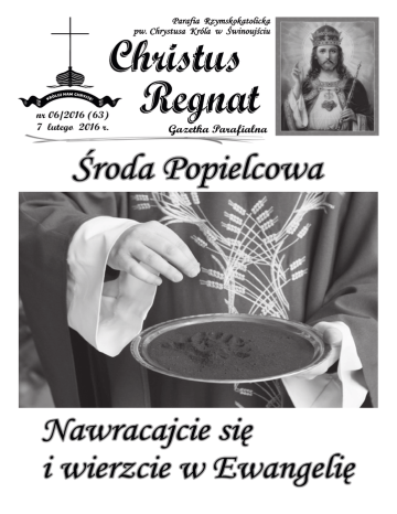 nr 06/2016 (63) 7 lutego 2016 r. LUTY 7 niedziela LUTY 8 poniedziałek V Niedziela Zwykła wspomnienia: św. Kolety; Teodora (m); Jana (m); Piusa IX (bł) Jezus rzekł do Szymona: „Nie bój się, odtąd ludzi będziesz łowił” (Łk 5,10b) Iż 6, 1-2a.3-8; 1 Kor 15,1-11; Łk 5,1-11 wspomnienia: św. Hieronima Emilianiego (pr); św. Józefiny (dz); Jana (zał); Piotra (bp); Sebastiana (m) „A wszyscy, którzy się Go dotknęli, odzyskiwali zdrowie” 1 Krl 8, 1-7. 9-13; Mk 6, 53-56 LUTY 9 wtorek LUTY 10 środa LUTY 11 czwartek wspomnienia: Apolonii (m); Mariana (m) „„Ten lud czci Mnie wargami, lecz sercem swym daleko jest ode Mnie. Ale czci Mnie na próżno...” 1 Krl 8, 22-23. 27-30; Mk 7, 1-13 Środa Popielcowa wspomnienia: św. Scholastyki, dziewicy; Wilhelma (pust); Jacka (m) „Nawróćcie się do waszego Boga, On bowiem jest łaskawy i miłosierny”. Jl 2, 12-18; 2 Kor 5, 20 – 6, 3; Mt 6, 1-6. 16-18 wspomnienia: NMP z Lourdes; Grzegorza (p); Teodory (ces); Dezyderego (m) „Kto chce zachować swoje życie, straci je, a kto straci swe życie z mego powodu, ten je zachowa”. Pwt 30, 15-20; Łk 9, 22-25 LUTY 12 piątek LUTY 13 sobota 2 wspomnienia: Melencjusza (bp); Eulaii (m); Modesta (m); Benedykta (o) „Lecz przyjdzie czas, kiedy zabiorą im oblubieńca, a wtedy będą pościć”. Iz 58, 1-9; Mt 9, 14-15 wspomnienia: Eligiusza (bp); Jordana (bł); Juliana (M.); Gilberta (bp) „Nie potrzebują lekarza zdrowi, ale ci, którzy się źle mają. Nie przyszedłem wezwać do nawrócenia sprawiedliwych, lecz grzeszników” Iz 58, 9b-14; Łk 5, 27-32 Christus Regnat - 6/2016 1. W tę niedzielę słyszymy w Ewangelii słowa o cudownym połowie ryb i powołaniu Szymona. Są one wezwaniem dla nas, gdyż Pan Jezus i nas powołuje, byśmy stawali się rybakami ludzi – tymi, którzy innych przyprowadzą do Chrystusa i Kościoła. Rozpoczynający się dzisiaj 49. Tydzień Modlitw o Trzeźwość Narodu, a w środę czas Wielkiego Postu, niech zaowocują dobrymi postanowieniami i ich wierną realizacją. Dziś po Mszy Świętej o godz. 17.00 w salce nr 2 spotkanie dla Członków Żywego Różańca i zmiana tajemnic różańcowych. 2. Jutro do naszego miasta i parafii przybywają znaki Dni Młodych. W związku z tym jutro o godz. 21.00 będzie powitanie tychże znaków na placu Kościelnym (przy Polomarkecie) skąd udamy się do kościoła gdzie będzie czuwanie. O godz. 22.00 będzie sprawowana Uroczysta Eucharystia pod przewodnictwem ks. abp. Andrzeja Dzięgi i ponownie po Mszy Świętej czuwanie przy znakach do 24.00. Gromadzimy się przed 21.00 na placu a przedstawiciele poszczególnych grup są proszeni o złożenie wiązanek kwiatów przy tychże znakach gdy zostaną wniesione do kościoła. We Wtorek zaś o godz 8.00 po Mszy Świętej będzie pożegnanie i przewiezienie do Parafii św. Stanisława i Bonifacego gdzie o godz. 9.00. będzie odprawiona Droga Krzyżowa i czuwanie. O godz 12.00 w kościele NMP Gwiazdy Morza będzie Godzina Maryjna a o godz. 18.00 w kościele pw. św. Michała Kozala zostanie odprawiona Eucharystia pod przewodnictwem ks. bp. Mariana Kruszyłowicza. Tak zakończy się peregrynacja znaków Dni Młodych w naszym mieście i pożegnanie tychże znaków. Gorąco zachęcamy do udziału w tych wydarzeniach. Przy okazji jeszcze raz bardzo gorąco zachęcamy do przyjęcia młodych do swoich domów, gdy będą te Dni Młodych w naszej Archidiecezji. Jest to czas wakacji ale takie wydarzenie jest niespotykane. Jeżeli ktoś się zdecyduje to prosimy o szybki kontakt z ks. Markiem. Christus Regnat - 6/2016 3 Przypominamy że jest to też spełnienie uczynku Miłosierdzia co do ciała: podróżnych w dom przyjąć, a więc i okazja do zyskania odpustu zupełnego za spełnienie uczynku Miłosierdzia. 3. W najbliższą środę przypada Środa Popielcowa rozpoczynająca czterdziestodniowy okres przygotowania paschalnego – okres Wielkiego Postu. Msze Święte z posypaniem naszych głów popiołem na znak pokuty odprawimy o godz.: 7.00, 7.30, 9.00, 16.00 i 17.00. Zachęcamy do licznego uczestnictwa oraz do podjęcia praktyk pokutnych w tym świętym czasie. Przypominamy że Środa Popielcowa to dzień postu ścisłego obowiązującego wiernych między 18. a rozpoczęciem 60. roku życia (post polega na wstrzemięźliwości od pokarmów mięsnych oraz na spożyciu jednego posiłku do syta oraz dwóch skromnych posiłków w ciągu dnia). Osoby starsze i nieco młodsze (które ukończyły 14 lat) są zobowiązane tego dnia do wstrzemięźliwości od pokarmów mięsnych. Ponadto do postu ścisłego jesteśmy zobowiązani również w Wielki Piątek. Przypominamy także, że we wszystkie piątki roku obowiązuje nas wstrzemięźliwość od pokarmów mięsnych. Zachęcamy również do podejmowania różnych wielkopostnych wyrzeczeń, umartwień. Przed obrazem Jezusa Miłosiernego będzie wyłożona księga Trzeźwości oraz księga dla Osób które podejmą się dodatkowego postu ścisłego w jednym dniu Wielkiego Postu w intencji Parafii i nas kapłanów. Gorąco o to prosimy. Pamiętajmy, że rozpoczynający się okres wielkopostny to tzw. czas zakazany, okres pokutny w Kościele. Powstrzymajmy się więc od hucznych zabaw, tańców i dyskotek. 4 Christus Regnat - 6/2016 4. Czwartek, 11 lutego to liturgiczne wspomnienie Matki Bożej z Lourdes i Światowy Dzień Chorego. Podczas Eucharystii o godz. 17.00 pomodlimy się za chorych i tych, którzy nimi się opiekują. Podczas tej Mszy Świętej zostanie udzielony Sakrament Chorych. Jest to Sakrament który można przyjąć w doświadczeniu jakiejkolwiek choroby, niezależnie od tego czy jesteśmy młodzi czy w podeszłym wieku. Jest to sakrament dla uzdrowienia człowieka i nie ma sakramentu „ostatniego namaszczenia”, dlatego nigdy nie bójmy się wezwać kapłana, gdy ktoś jest ciężko chory w domu. Niech zniknie też taka postawa – nie będziemy wzywać kapłana, żeby chory się nie przestraszył i nie myślał,