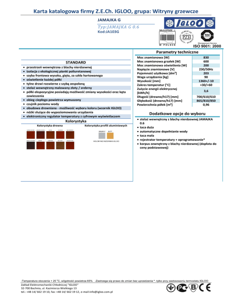 Karta katalogowa firmy Z.E.Ch. IGLOO, grupa: Witryny grzewcze JAMAJKA G Typ:JAMAJKA G 0.6 Kod:JA103G Parametry techniczne STANDARD przestrzeo wewnętrzna z blachy nierdzewnej izolacja z ekologicznej pianki poliuretanowej szyba frontowa wysoka, gięta, za szkła hartowanego oświetlenie każdej półki tylne drzwi rozwierne z szybą zespoloną stelaż wewnętrzny malowany złoty / srebrny półki ekspozycyjne posiadają możliwośd zmiany wysokości oraz kąta zawieszenia obieg ciepłego powietrza wymuszony czujnik poziomu wody obudowa drewniana - możliwośd wyboru koloru (wzornik IGLOO) nóżki służące do wypoziomowania urządzenia elektroniczny regulator temperatury z cyfrowym wyświetlaczem Kolorystyka Kolorystyka drewna Kolorystyka profili aluminiowych o Moc znamionowa [W] Moc znamionowa grzałek *W+ Moc znamionowa oświetlenia *W+ Napięcie znamionowe *V+ Pojemnośd użytkowa *dm³+ Waga urządzenia *kg+ Wysokośd *mm+ Zakres temperatur *°C+ Zużycie energii elektrycznej [kWh/h] Długośd (drewno/h17) *mm+ Głębokośd (drewno/h17) *mm+ Powierzchnia półek *m²+ 830 600 200 230/50Hz 203 90 1360+/-10 +30/+60 3,6 700/610/610 865/810/850 0,96 Dodatkowe opcje do wyboru stelaż wewnętrzny z blachy nierdzewnej JAMAJKA 0.6 taca duża automatyczne dopełnianie wody taca mała rejestrator temperatury + oprogramowanie* korpus zewnętrzny z blachy nierdzewnej (dopłata do ceny podstawowej) -Temperatura otoczenia + 25 C, wilgotność powietrza 65% -Zastrzega się prawo do zmian bez uprzedzenia * -tylko przy zastosowaniu termostatu IGLOO Zakład Elektromechaniki Chłodniczej "IGLOO" 32-700 Bochnia, ul. Kazimierza Wielkiego 13 tel.: +48 14/ 662 19 10, fax: +48 14/ 662 19 12, e-mail:[email protected]