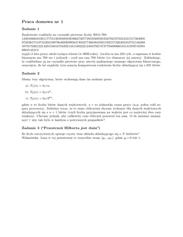 Praca domowa nr 1 Zadanie 1 Znalezienie rozkładu na czynniki pierwsze liczby RSA-768: 12301866845301177551304949583849627207728535695953347921973224521517264005 07263657518745202199786469389956474942774063845925192557326303453731548268 50791702612214291346167042921431160222124047927473779408066535141959745985 6902143413 zajęło 2 lata pracy około tysiąca rdzeni (w 2009 roku). Liczba ta ma 232 cyfr, a zapisana w kodzie binarnym ma 768 zer i jedynek - czyli ma ona 768 bitów (co tłumaczy jej nazwę). Zakładając, że rozkładano ją na czynniki pierwsze przy użyciu najlepszego znanego algorytmu klasycznego, oszacujcie, ile lat zajęłoby tym samym komputerom rozłożenie liczby składającej się z 835 bitów. Zadanie 2 Mamy trzy algorytmy, które wykonują dane im zadania przez a) T1 (n) = b1 τ n, b) T2 (n) = b2 τ nk , c) T3 (n) = b3 τ 2kn , gdzie n to liczba bitów danych wejściowych, a τ to jednostka czasu pracy (n.p. jeden cykl zegara procesora). Załóżmy teraz, że te same obliczenia chcemy wykonać dla danych wejściowych składających się z n + 1 bitów (czyli liczba przyjmowana na wejściu jest co najwyżej dwa razy większa). Chcemy jednak, aby całkowity czas obliczeń pozostał ten sam. O ile musimy zmniejszyć τ aby tak było w każdym z powyższych przpadków? Zadanie 3 (“Przestrzeń Hilberta jest duża”) Ile liczb rzeczywistych opisuje czysty stan układu składającego się z N kubitów? Wskazówka: baza w tej przestrzeni to wszystkie stany |q1 ...qN i, gdzie qi = 0 lub 1.