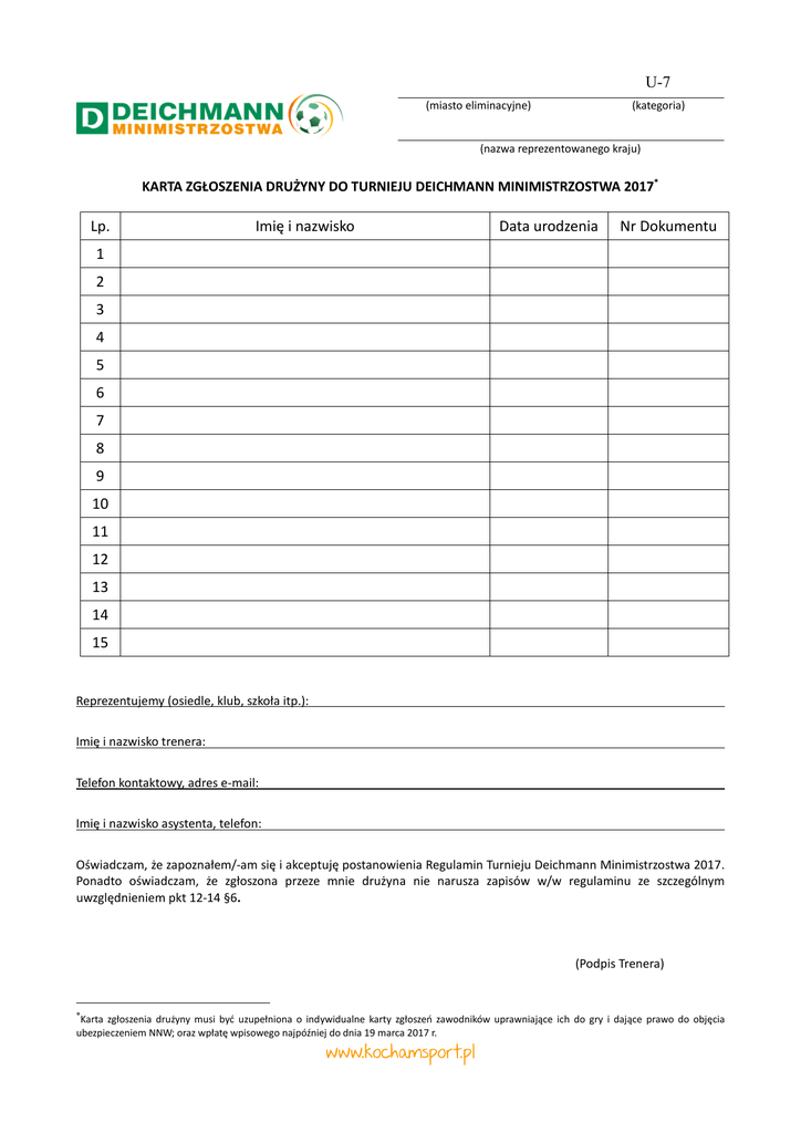 U-7 (miasto eliminacyjne) (kategoria) (nazwa reprezentowanego kraju) KARTA ZGŁOSZENIA DRUŻYNY DO TURNIEJU DEICHMANN MINIMISTRZOSTWA 2017* Lp. Imię i nazwisko Data urodzenia Nr Dokumentu 1 2 3 4 5 6 7 8 9 10 11 12 13 14 15 Reprezentujemy (osiedle, klub, szkoła itp.): Imię i nazwisko trenera: Telefon kontaktowy, adres e-mail: Imię i nazwisko asystenta, telefon: Oświadczam, że zapoznałem/-am się i akceptuję postanowienia Regulamin Turnieju Deichmann Minimistrzostwa 2017. Ponadto oświadczam, że zgłoszona przeze mnie drużyna nie narusza zapisów w/w regulaminu ze szczególnym uwzględnieniem pkt 12-14 §6. (Podpis Trenera) * Karta zgłoszenia drużyny musi być uzupełniona o indywidualne karty zgłoszeń zawodników uprawniające ich do gry i dające prawo do objęcia ubezpieczeniem NNW; oraz wpłatę wpisowego najpóźniej do dnia 19 marca 2017 r. www.kochamsport.pl