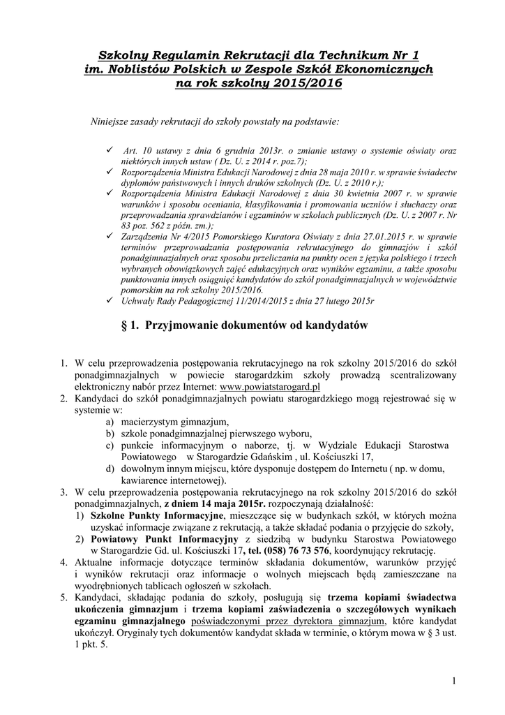 Szkolny Regulamin Rekrutacji dla Technikum Nr 1 im. Noblistów Polskich w Zespole Szkół Ekonomicznych na rok szkolny 2015/2016 Niniejsze zasady rekrutacji do szkoły powstały na podstawie: Art. 10 ustawy z dnia 6 grudnia 2013r. o zmianie ustawy o systemie oświaty oraz niektórych innych ustaw ( Dz. U. z 2014 r. poz.7); Rozporządzenia Ministra Edukacji Narodowej z dnia 28 maja 2010 r. w sprawie świadectw dyplomów państwowych i innych druków szkolnych (Dz. U. z 2010 r.); Rozporządzenia Ministra Edukacji Narodowej z dnia 30 kwietnia 2007 r. w sprawie warunków i sposobu oceniania, klasyfikowania i promowania uczniów i słuchaczy oraz przeprowadzania sprawdzianów i egzaminów w szkołach publicznych (Dz. U. z 2007 r. Nr 83 poz. 562 z późn. zm.); Zarządzenia Nr 4/2015 Pomorskiego Kuratora Oświaty z dnia 27.01.2015 r. w sprawie terminów przeprowadzania postępowania rekrutacyjnego do gimnazjów i szkół ponadgimnazjalnych oraz sposobu przeliczania na punkty ocen z języka polskiego i trzech wybranych obowiązkowych zajęć edukacyjnych oraz wyników egzaminu, a także sposobu punktowania innych osiągnięć kandydatów do szkół ponadgimnazjalnych w województwie pomorskim na rok szkolny 2015/2016. Uchwały Rady Pedagogicznej 11/2014/2015 z dnia 27 lutego 2015r § 1. Przyjmowanie dokumentów od kandydatów 1. W celu przeprowadzenia postępowania rekrutacyjnego na rok szkolny 2015/2016 do szkół ponadgimnazjalnych w powiecie starogardzkim szkoły prowadzą scentralizowany elektroniczny nabór przez Internet: www.powiatstarogard.pl 2. Kandydaci do szkół ponadgimnazjalnych powiatu starogardzkiego mogą rejestrować się w systemie w: a) macierzystym gimnazjum, b) szkole ponadgimnazjalnej pierwszego wyboru, c) punkcie informacyjnym o naborze, tj. w Wydziale Edukacji Starostwa Powiatowego w Starogardzie Gdańskim , ul. Kościuszki 17, d) dowolnym innym miejscu, które dysponuje dostępem do Internetu ( np. w domu, kawiarence internetowej). 3. W celu przeprowadzenia postępowania rekrutacyjnego na rok szkolny 2015/2016 do szkół ponadgimnazjalnych, z dniem 14 maja 2015r. rozpoczynają działalność: 1) Szkolne Punkty Informacyjne, mieszczące się w budynkach szkół, w których można uzyskać informacje związane z rekrutacją, a także składać podania o przyjęcie do szkoły, 2) Powiatowy Punkt Informacyjny z siedzibą w budynku Starostwa Powiatowego w Starogardzie Gd. ul. Kościuszki 17, tel. (058) 76 73 576, koordynujący rekrutację. 4. Aktualne informacje dotyczące terminów składania dokumentów, warunków przyjęć i wyników rekrutacji oraz informacje o wolnych miejscach będą zamieszczane na wyodrębnionych tablicach ogłoszeń w szkołach. 5. Kandydaci, składając podania do szkoły, posługują się trzema kopiami świadectwa ukończenia gimnazjum i trzema kopiami zaświadczenia o szczegółowych wynikach egzaminu gimnazjalnego poświadczonymi przez dyrektora gimnazjum, które kandydat ukończył. Oryginały tych dokumentów kandydat składa w terminie, o którym mowa w § 3 ust. 1 pkt. 5. 1 6. W okresie rekrutacji tj. od 14 maja do 22 czerwca 2015 r. kandydaci do szkół ponadgimnazjalnych prowadzonych przez Powiat Starogardzki wybierają na stronie internetowej Systemu Elektronicznego Naboru szkoły i klasy, do których chcą być przyjęci: a) Kandydat może wybrać maksymalnie trzy szkoły, b) Kandydat może wybrać dowolną liczbę klas w każdej z wybranych trzech szkół, c) Kandydat ustala kolejność wybranych klas, klasa wybrana jako pierwsza jest ta, na której kandydatowi najbardziej zależy. Ostatnia z zaznaczonych to ta, na której kandydatowi najmniej zależy. Są to tzw. preferencje kandydata. Szkoła, prowadząca klasę wybraną jako pierwszą jest traktowana jako szkoła pierwszego wyboru. 7. W systemie rekrutacji elektronicznej kandydat posługuje się kopią świadectwa ukończenia gimnazjum i kopią zaświadczenia o szczegółowych wynikach egzaminu gimnazjalnego opatrzonymi numerem "1". Na życzenie ucznia lub jego rodzica (prawnego opiekuna) dyrektor gimnazjum zobowiązany jest wydać pozostałe kopie obu ww. dokumentów opatrzone odpowiednio numerami "2" i "3", które mogą być wykorzystane w rekrutacji poza systemem elektronicznym. 8. Po wyborze szkół Kandydaci ubiegający się o przyjęcie do szkół ponadgimnazjalnych, biorących udział w elektronicznym naborze, składają w terminie rekrutacji w pierwszej z wybranych szkół: 1) wniosek o przyjęcie do szkoły wydrukowane z Systemu Elektronicznego Naboru podpisane przez rodziców, 2) poświadczoną kopię świadectwa ukończenia gimnazjum opatrzoną nr "1", 3) poświadczoną kopię zaświadczenia o wynikach egzaminu gimnazjalnego opatrzoną nr "1", 4) zaświadczenie o uzyskaniu tytułu laureata lub finalisty olimpiad lub konkursów, o których mowa w § 2 ust 4, pkt 3, litera "b", 5) opinię wydaną przez publiczna poradnię psychologiczno- pedagogiczną, w tym publiczną poradnię specjalistyczną , w sprawie pierwszeństwa w przyjęciu ucznia z problemami zdrowotnymi , 6) dokumenty potwierdzające spełnienie kryteriów, o których mowa w § 2 ust 8, pkt 1-7 ( jeśli komisja rekrutacyjna ma wziąć pod uwagę spełnianie danego kryterium). 9. Oryginał świadectwa ukończenia gimnazjum wraz z oryginałem zaświadczenia o szczegółowych wynikach egzaminu gimnazjalnego należy złożyć w wybranej szkole, w której uczeń potwierdza wolę podjęcia nauki. 10. Do oryginałów dokumentów należy dołączyć: 1) dwie fotografie, 2) zaświadczenie lekarskie zawierające orzeczenie o braku przeciwwskazań zdrowotnych do podjęcia praktycznej nauki zawodu – dotyczy technikum i szkół ponadgimnazjalnych zawodowych w tym zasadniczej szkoły zawodowej specjalnej, 3) umowę o pracę lub zaświadczenie od pracodawcy o zamiarze zawarcia umowy o pracę w celu przygotowania zawodowego w celu nauki zawodu z dniem 1 września 2012 r. (dotyczy uczniów - pracowników młodocianych) zgodn