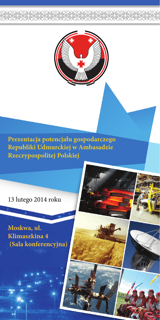 Prezentacja potencjału gospodarczego Republiki Udmurckiej w Ambasadzie Rzeczypospolitej Polskiej 13 lutego 2014 roku Moskwa, ul. Klimaszkina 4 (Sala konferencyjna) Drodzy uczestnicy Prezentacji potencjału gospodarczego Republiki Udmurckiej w Ambasadzie Rzeczypospolitej Polskiej! Udmurcja jest jednym z dynamicznie rozwijających się regionów Federacji Rosyjskiej, atrakcyjnym pod kątem inwestycji, posiadającym duży potencjał innowacyjny i znaczące zalety konkurencyjne. Przedsiębiorstwa Republiki Udmurckiej, oprócz techniki wojskowej, produkują sprzęt dla elektrowni jądrowych, systemy telekomunikacyjne dla branży kosmicznej, broń myśliwską i sportową, urządzenia łączności, elektronikę, technikę medyczną, sprzęt do wydobycia i dostaw ropy naftowej i gazu, produkty spożywcze i wiele innych. Nasza produkcja wyróżnia się wysoką jakością, niezawodnością, innowacyjnością, jest ekologiczna i cieszy się popytem na rynku krajowym, jak również na rynkach zagranicznych. Nasza republika zawsze otwarta jest na nowe pomysły i technologie. Aktywnie rozwija handel zagraniczny, poprzez wspieranie działających eksporterów i pomoc początkującym firmom w promocji produktów na rynkach światowych. Podczas dzisiejszej prezentacji zostaną przedstawione jedne z najskuteczniejszych małych i średnich przedsiębiorstw republiki, które dysponują potencjałem eksportowym i szybko reagują na potrzeby rynku. Obecnie w Udmurcji stworzone zostały niezbędne warunki do skutecznej działalności dla krajowych i zagranicznych inwestorów. Ministerstwo Gospodarki Republiki Udmurckiej tworzy rejestr projektów inwestycyjnych, potrzebujących wsparcia ze strony państwa. Mam nadzieję, że dzisiejsze rozmowy będą służyć rozwojowi długotrwałych i wzajemnie korzystnych relacji między przedsiębiorstwami Republiki Udmurckiej i Rzeczypospolitej Polskiej, jak również rozwojowi międzyregionalnej i międzynarodowej integracji. Jednocześnie zapraszam Państwa do wzięcia udziału w Międzynarodowym Forum Biznesowym „Biznes-Most w Udmurcji”, które odbędzie się w październiku bieżącego roku w Iżewsku – stolicy Republiki Udmurckiej. Z całego serca życzę Wam, drodzy przyjaciele, owocnej pracy, twórczej energii oraz skutecznej realizacji najbardziej ambitnych planów. Jesteśmy otwarci na współpracę. Zapraszam Państwa do Udmurcji! Minister Gospodarki Republiki Udmurckiej Mikhail P. Zaytsev Republika Udmurcka – Państwa solidny partner! Ogólne informacje o Republice Udmurckiej: Stolica – Iżewsk. Liczba ludności – 1,5 mln. Gęstość zaludnienia – 36,08 osoby na 1 km22. Strefa czasowa – czas moskiewski (GMT +3) Ratingi kredytowe (wg agencji Fitch Ratings) – Aа(rus), ВB+ w skali krajowej i globalnej odpowiednio; prognoza – stabilna. Powierzchnia – 42,1 tys. km22. Położenie geograficzne – we wschodniej części Niziny Wschodnioeuropejskiej na przedgórzu Uralu; graniczy: na północy i północnym zachodzie – z obwodem kirowskim, na wschodzie – z Krajem Permskim, na południowym wschodzie – z Republiką Baszkortostan, na południu – z Republiką Tatarstan. Odległość między stolicą republiki Iżewskiem a Moskwą – 1325 km, Petersburgiem – 1904 km, Jekaterynburgiem – 800 km, Kazaniem – 395 km, Kazachstanem (Kustanaj) – 1200 km. Krajobraz naturalny – pagórkowata równina, strefa lasów mieszanych zajmuje więcej niż 40% terytorium. Zasoby naturalne – ropa naftowa, torf, węgiel kamienny i brunatny, wapień, glina, piasek, żwir, drewno. „Alternatywna energia” Sp. z o.o. rok utworzenia – 2009 Rodzaje działalności Produkcja innowacyjnego sprzętu cieplnego do ogrzewania i zaopatrzenia w ciepłą wodę firm produkcyjnych, przedsiębiorstw gospodarki komunalnej, domów mieszkalnych, jak również współpraca z hurtowniami działającymi w branży „Ciepłownictwo i ogrzewanie”. Wysoka trwałość (żywotność ponad 30 lat), wysoki poziom oszczędzania energii elektrycznej (od 30% do 50%). W Polsce w Warszawie uruchomiono produkcję WIN zgodnie ze standardem Euro – www.iheating.eu, vih.com.pl • Doświadczenie w pracy z firmami z Grecji www.bhg.gr, Bułgarii www.radiator.bg • Eksport wirowych indukcyjnych nagrzewnic (WIN) do krajów Unii Europejskiej. • Poszukiwanie przedstawicieli handlowych, dystrybutorów, produkcja urządzeń wspólnie z partnerem z UE. Кочуров Иван Александрович Iwan Koczurow Dyrektor Вахрушев Михаил Владимирович Michaił Wachruszew liczba pracowników – 28; tel.: +7 (3412) 907-412; 907-41; faks: +7 (3412) 686-934; e-mail: [email protected]; www.vinteplo.ru www.akoil-teplo.ru; www.iheating.eu vih.com.pl Индивидуальный предприниматель Тарасов Виктор Сергеевич Przedsiębiorca Wiktor Tarasow rok założenia działalności – 1998 Rodzaje działalności Produkcja kompaktowych silników elektrycznych i pilarek elektrycznych dużej mocy (3kW) do cięcia drewna, w tym opałowego, czyszczenia torfowisk, cięcia papierowych rolek, produkcji modeli drewnianych. Duża moc i wydajność, trwałość pracy, ognioodporność, szeroki zakres zastosowań Komercyjne zainteresowanie w Polsce • Eksport pilarek elektrycznych Victar (EPCz-3) i kompaktowych silników elektrycznych dużej mocy. • Poszukiwanie firm usługowych w celu zawarcia umowy na serwis (serwis gwarancyjny) pilarek elektrycznych naszej produkcji. • Poszukiwanie przedstawicieli handlowych, dystrybutorów. • Otwarcie przedsiębiorstwa, uruchomienie montażu elektrycznych pilarek i silników w Polsce i w Rosji, w celu uzyskania certyfikatu CE. Obecnie zaczęliśmy współpracę z PRINZ Polska Sp. z o.o. – największym producentem stacjonarnych pił w Europie. Тарасов Алексей Викторович Aleksiej Tarasow Dyrektor Komercyjny Тарасова Алла Николаевна Ałła Tarasowa Zastępc