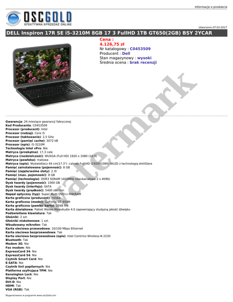 Informacje o produkcie Utworzono 07-03-2017 DELL Inspiron 17R SE i5-3210M 8GB 17 3 FullHD 1TB GT650(2GB) BSY 2YCAR Cena : 4.126,75 zł er m ar k Nr katalogowy : C0453509 Producent : Dell Stan magazynowy : wysoki Średnia ocena : brak recenzji w at Gwarancja: 24 miesiące gwarancji fabrycznej Kod Producenta: C0453509 Procesor (producent): Intel Procesor (rodzaj): Core i5 Procesor (taktowanie): 2,5 GHz Procesor (pamięć cache): 3072 kB Procesor (opis): i5-3210M Technologia Intel vPro: Nie Matryca (przekątna): 17,3 cale Matryca (rozdzielczość): WUXGA (Full HD) 1920 x 1080 (16:9) Matryca (powłoka): matowa Matryca (opis): Wyświetlacz 44 cm(17.3") -calowy Full HD (1920X1080) WLED z technologią AntiGlare Pamięć zainstalowana (pojemność): 8 GB Pamięć (zajęte/wolne sloty): 2 /0 Pamięć (max. pojemność): 8 GB Pamięć (technologia): DDR3 SDRAM 1600MHz (dwukanałowa 2 x 4096) Dysk twardy (pojemność): 1000 GB Dysk twardy (interfejs): SATA Dysk twardy (prędkość): 5400 obr/min Napęd optyczny (typ): Super Multi DVD+/-RW/RAM Karta graficzna (producent): nVidia Karta graficzna (model): GeForce GT 650M Karta graficzna (pamięć karty): 2048 MB Karta dźwiękowa: Pakiet Waves MaxxAudio 4.0 zapewniający studyjną jakość dźwięku Podświetlana klawiatura: Tak Głośniki: 2 szt. Głośniki niskotonowe: 1 szt. Wbudowany mikrofon: Tak Karta sieciowa przewodowa: 10/100 Mbps Ethernet Karta sieciowa bezprzewodowa: Tak Karta sieciowa bezprzewodowa (opis): Intel Centrino Wireless-N 2230 Bluetooth: Tak Modem 3G: Nie Fax modem: Nie ExpressCard 34: Nie ExpressCard 54: Nie Czytnik Smart Card: Nie E-SATA: Nie Czytnik linii papilarnych: Nie Platforma szyfrująca TPM: Nie Kensington Lock: Nie Display Port: Nie DVI-D: Nie HDMI: Tak VGA (RGB): Tak Wygenerowano w programie www.oscGold.com w at er m ar k S-video/TV-out: Nie AV-in (Tuner TV): Nie Line-in: Nie Line-out: Tak Wejście mikrofonu: Tak S/PDIF: Nie RS232 (szeregowy): Nie Moduł GPS: Nie Czytnik kart pamięci: Tak Czytnik kart pamięci (opis): Digital (SD) Memory Card, Secure Digital Extended Capacity (SDXC), Secure Digital High Capacity (SDHC), Multi Media Card (MMC), Memory Stick (MS), Memory Stick PRO (MS Pro) , xD Picture Card (xD) Panel klawiszy multimedialnych: Nie Złącze replikatora portów: Nie Fire-Wire (IEEE1394): Nie USB 3.0: 4 szt. System operacyjny: Brak systemu operacyjnego System operacyjny (wer. Językowa): Brak systemu operacyjnego Wbudowana kamera: Tak Wbudowana kamera (opis): Kamera internetowa z obsługą rozdzielczości HD 1,0 megapiksela i mikrofonem cyfrowym Wbudowana kamera obrotowa: Nie Urządzenie wskazujące: TouchPad, Pełnowymiarowa klawiatura typu chiclet. Akumulator (technologia): Litowo-Jonowy, 6 ogniowy 48 Wh Wymiary (wysokość): 31,9 mm, 37,4 mm Wymiary (szerokość): 417 mm Wymiary (głębokość): 276 mm Waga: 3,28 kg Gwarancja: 24 mies Gwarancja międzynarodowa: Tak Gwarancja baterii: 12 mies Wyposażenie: Zasilacz sieciowy, Karta gwarancyjna Opis: Tylna strona wyświetlacza i podpórka na nadgarstki w kolorze eleganckiej czerni i anodyzowanego aluminium z precyzyjnym wykończeniem o strukturze plastra miodu. Adres www producenta: Link na stronę opisu technicznego