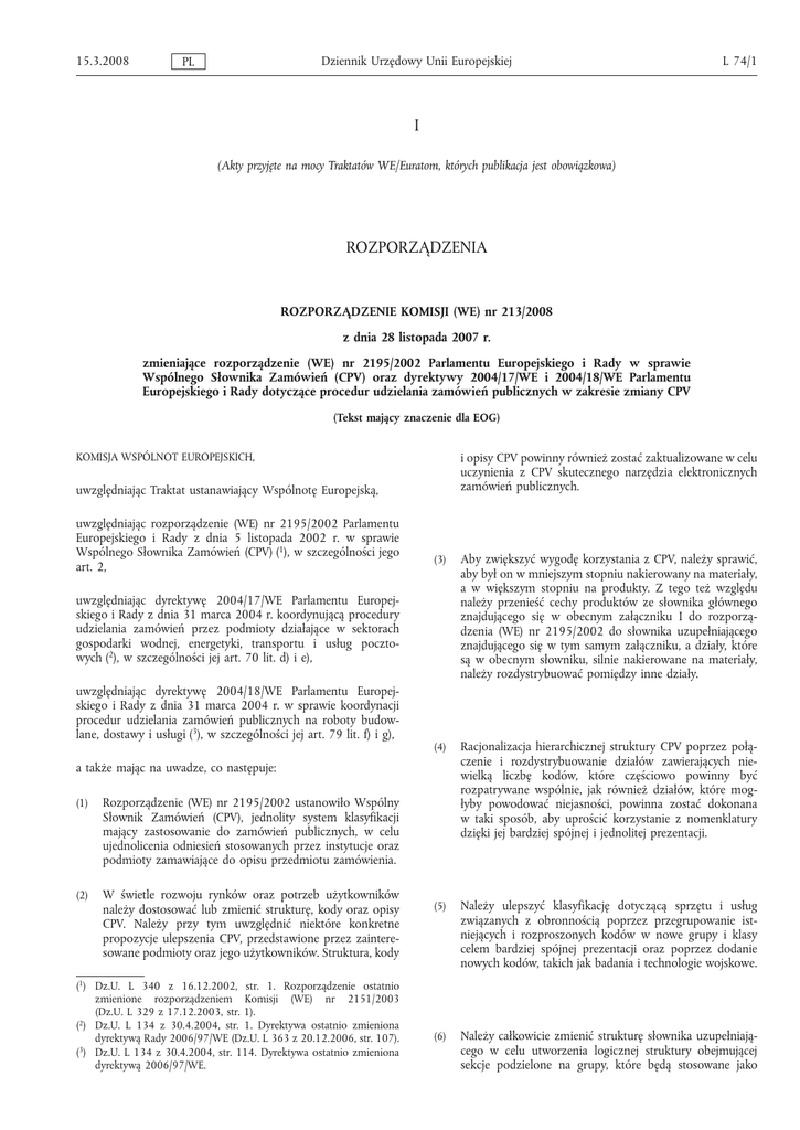 15.3.2008 Dziennik Urzędowy Unii Europejskiej PL L 74/1 I (Akty przyjęte na mocy Traktatów WE/Euratom, których publikacja jest obowiązkowa) ROZPORZĄDZENIA ROZPORZĄDZENIE KOMISJI (WE) nr 213/2008 z dnia 28 listopada 2007 r. zmieniające rozporządzenie (WE) nr 2195/2002 Parlamentu Europejskiego i Rady w sprawie Wspólnego Słownika Zamówień (CPV) oraz dyrektywy 2004/17/WE i 2004/18/WE Parlamentu Europejskiego i Rady dotyczące procedur udzielania zamówień publicznych w zakresie zmiany CPV (Tekst mający znaczenie dla EOG) KOMISJA WSPÓLNOT EUROPEJSKICH, i opisy CPV powinny również zostać zaktualizowane w celu uczynienia z CPV skutecznego narzędzia elektronicznych zamówień publicznych. uwzględniając Traktat ustanawiający Wspólnotę Europejską, uwzględniając rozporządzenie (WE) nr 2195/2002 Parlamentu Europejskiego i Rady z dnia 5 listopada 2002 r. w sprawie Wspólnego Słownika Zamówień (CPV) (1), w szczególności jego art. 2, (3) Aby zwiększyć wygodę korzystania z CPV, należy sprawić, aby był on w mniejszym stopniu nakierowany na materiały, a w większym stopniu na produkty. Z tego też względu należy przenieść cechy produktów ze słownika głównego znajdującego się w obecnym załączniku I do rozporządzenia (WE) nr 2195/2002 do słownika uzupełniającego znajdującego się w tym samym załączniku, a działy, które są w obecnym słowniku, silnie nakierowane na materiały, należy rozdystrybuować pomiędzy inne działy. (4) Racjonalizacja hierarchicznej struktury CPV poprzez połączenie i rozdystrybuowanie działów zawierających niewielką liczbę kodów, które częściowo powinny być rozpatrywane wspólnie, jak również działów, które mogłyby powodować niejasności, powinna zostać dokonana w taki sposób, aby uprościć korzystanie z nomenklatury dzięki jej bardziej spójnej i jednolitej prezentacji. (5) Należy ulepszyć klasyfikację dotyczącą sprzętu i usług związanych z obronnością poprzez przegrupowanie istniejących i rozproszonych kodów w nowe grupy i klasy celem bardziej spójnej prezentacji oraz poprzez dodanie nowych kodów, takich jak badania i technologie wojskowe. (6) Należy całkowicie zmienić strukturę słownika uzupełniającego w celu utworzenia logicznej struktury obejmującej sekcje podzielone na grupy, które będą stosowane jako uwzględniając dyrektywę 2004/17/WE Parlamentu Europejskiego i Rady z dnia 31 marca 2004 r. koordynującą procedury udzielania zamówień przez podmioty działające w sektorach gospodarki wodnej, energetyki, transportu i usług pocztowych (2), w szczególności jej art. 70 lit. d) i e), uwzględniając dyrektywę 2004/18/WE Parlamentu Europejskiego i Rady z dnia 31 marca 2004 r. w sprawie koordynacji procedur udzielania zamówień publicznych na roboty budowlane, dostawy i usługi (3), w szczególności jej art. 79 lit. f) i g), a także mając na uwadze, co następuje: (1) Rozporządzenie (WE) nr 2195/2002 ustanowiło Wspólny Słownik Zamówień (CPV), jednolity system klasyfikacji mający zastosowanie do zamówień publicznych, w celu ujednolicenia odniesień stosowanych przez instytucje oraz podmioty zamawiające do opisu przedmiotu zamówienia. (2) W świetle rozwoju rynków oraz potrzeb użytkowników należy dostosować lub zmienić strukturę, kody oraz opisy CPV. Należy przy tym uwzględnić niektóre konkretne propozycje ulepszenia CPV, przedstawione przez zainteresowane podmioty oraz jego użytkowników. Struktura, kody (1) Dz.U. L 340 z 16.12.2002, str. 1. Rozporządzenie ostatnio zmienione rozporządzeniem Komisji (WE) nr 2151/2003 (Dz.U. L 329 z 17.12.2003, str. 1). (2) Dz.U. L 134 z 30.4.2004, str. 1. Dyrektywa ostatnio zmieniona dyrektywą Rady 2006/97/WE (Dz.U. L 363 z 20.12.2006, str. 107). (3) Dz.U. L 134 z 30.4.2004, str. 114. Dyrektywa ostatnio zmieniona dyrektywą 2006/97/WE. L 74/2 Dziennik Urzędowy Unii Europejskiej PL uzupełnienie do słownika głównego. Należy wzbogacić słownik uzupełniający o cechy produktów i usług w celu umożliwienia pełnego opisu przedmiotu zamówienia oraz zmniejszenia liczby kodów w słowniku głównym, co również stanowić będzie uproszczenie. 15.3.2008 2) skreśla się załącznik II; 3) załącznik III zastępuje się tekstem załącznika II do niniejszego rozporządzenia; 4) załącznik IV zastępuje się tekstem załącznika III do niniejszego rozporządzenia; załącznik V zastępuje się tekstem załącznika IV do niniejszego rozporządzenia. (7) W celu zachowania przejrzystości należy zastąpić załącznik I do rozporządzenia (WE) nr 2195/2002. (8) Załącznik II do rozporządzenia (WE) nr 2195/2002, zawierający szczegółowe wykazy zmian dokonanych w 2003 r., przestał być użyteczny, a zatem powinien zostać skreślony. 5) W rezultacie zmiany CPV należy także zaktualizować tabele ilustracyjne przedstawione w załącznikach III, IV i V do rozporządzenia (WE) nr 2195/2002, pokazujące zbieżność pomiędzy CPV a centralną klasyfikacją produktów (CPC Prov.) Narodów Zjednoczonych, klasyfikacją działalności gospodarczej we Wspólnocie Europejskiej (NACE Rev. 1) oraz Nomenklaturą Scaloną (CN). W celu zachowania przejrzystości należy je zastąpić. W dyrektywie 2004/17/WE wprowadza się następujące zmiany: (9) (10) Przy okazji zmiany CPV należy zaktualizować wykazy działalności i usług zawierające odniesienia do kodów CPV, przedstawione w załącznikach do dyrektyw 2004/17/WE i 2004/18/WE, tak aby zapewnić zgodność ze zmienionym CPV, nie zmieniając zakresu przedmiotowego wspomnianych dyrektyw. (11) Aby zapewnić czas wystarczający na techniczne dostoso- wanie systemów elektronicznych do nowego CPV, niniejsze rozporządzenie powinno być stosowane po upływie sześciu miesięcy od jego opublikowania. Artykuł 2 1) tabelę przedstawioną w załączniku XII zastępuje się tekstem załącznika V do niniejszego rozporządzenia; 2) tabelę przedstawioną w załącznik