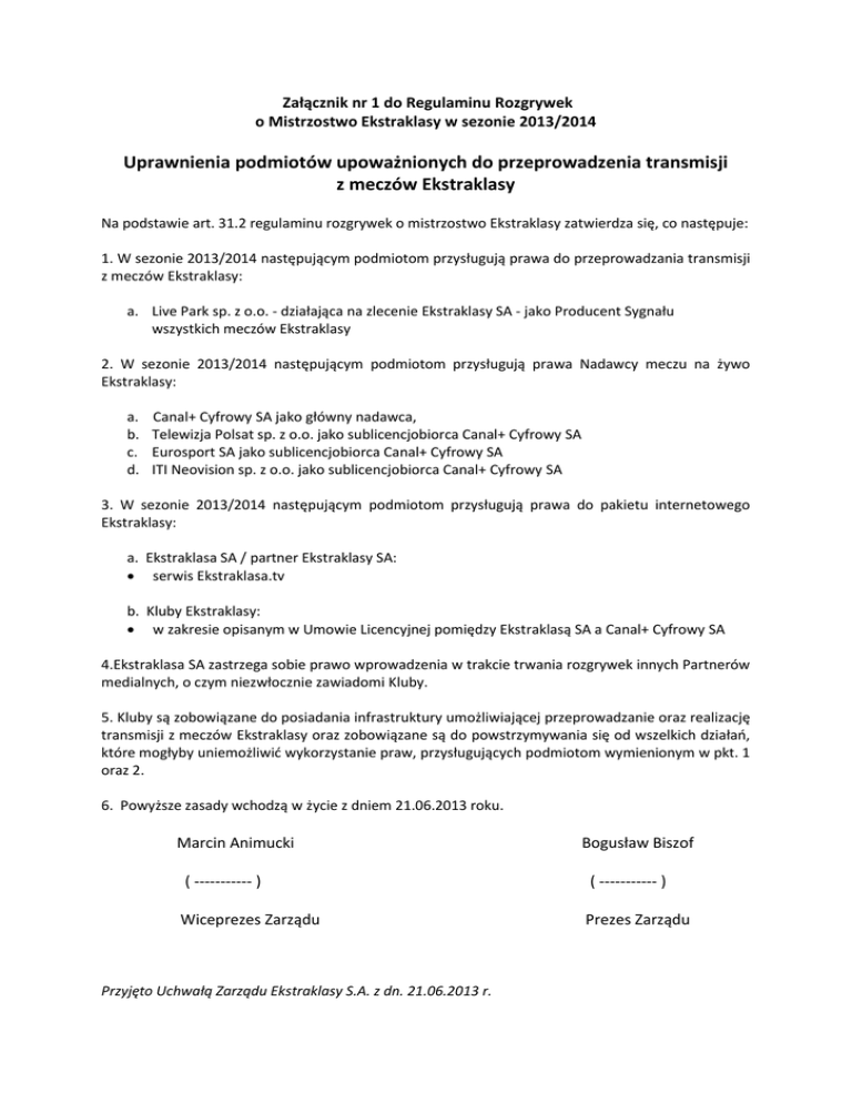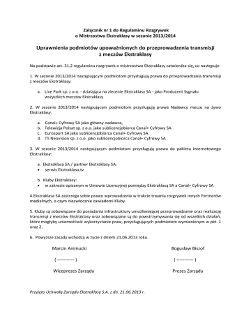 Załącznik nr 1 do Regulaminu Rozgrywek o Mistrzostwo Ekstraklasy w sezonie 2013/2014 Uprawnienia podmiotów upoważnionych do przeprowadzenia transmisji z meczów Ekstraklasy Na podstawie art. 31.2 regulaminu rozgrywek o mistrzostwo Ekstraklasy zatwierdza się, co następuje: 1. W sezonie 2013/2014 następującym podmiotom przysługują prawa do przeprowadzania transmisji z meczów Ekstraklasy: a. Live Park sp. z o.o. - działająca na zlecenie Ekstraklasy SA - jako Producent Sygnału wszystkich meczów Ekstraklasy 2. W sezonie 2013/2014 następującym podmiotom przysługują prawa Nadawcy meczu na żywo Ekstraklasy: a. b. c. d. Canal+ Cyfrowy SA jako główny nadawca, Telewizja Polsat sp. z o.o. jako sublicencjobiorca Canal+ Cyfrowy SA Eurosport SA jako sublicencjobiorca Canal+ Cyfrowy SA ITI Neovision sp. z o.o. jako sublicencjobiorca Canal+ Cyfrowy SA 3. W sezonie 2013/2014 następującym podmiotom przysługują prawa do pakietu internetowego Ekstraklasy: a. Ekstraklasa SA / partner Ekstraklasy SA: serwis Ekstraklasa.tv b. Kluby Ekstraklasy: w zakresie opisanym w Umowie Licencyjnej pomiędzy Ekstraklasą SA a Canal+ Cyfrowy SA 4.Ekstraklasa SA zastrzega sobie prawo wprowadzenia w trakcie trwania rozgrywek innych Partnerów medialnych, o czym niezwłocznie zawiadomi Kluby. 5. Kluby są zobowiązane do posiadania infrastruktury umożliwiającej przeprowadzanie oraz realizację transmisji z meczów Ekstraklasy oraz zobowiązane są do powstrzymywania się od wszelkich działań, które mogłyby uniemożliwić wykorzystanie praw, przysługujących podmiotom wymienionym w pkt. 1 oraz 2. 6. Powyższe zasady wchodzą w życie z dniem 21.06.2013 roku. Marcin Animucki Bogusław Biszof ( ----------- ) ( ----------- ) Wiceprezes Zarządu Prezes Zarządu Przyjęto Uchwałą Zarządu Ekstraklasy S.A. z dn. 21.06.2013 r.