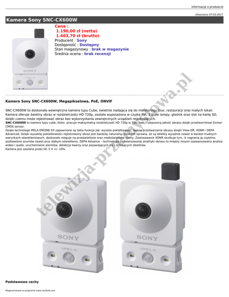 Informacje o produkcie Utworzono 07-03-2017 Kamera Sony SNC-CX600W Cena : 1.190,00 zł (netto) 1.463,70 zł (brutto) ze m ys lo w Kamera Sony SNC-CX600W, Megapikselowa, PoE, ONVIF a. pl Producent : Sony Dostępność : Dostępny Stan magazynowy : brak w magazynie Średnia ocena : brak recenzji SNC-CX600W to doskonała wewnętrzna kamera typu Cube, świetnie nadająca się do monitoringu biur, restauracji oraz małych lokali. Kamera oferuje świetny obraz w rozdzielczości HD 720p, została wyposażona w czujkę PIR, 2 białe lampy, głośnik oraz slot na kartę SD, dzięki czemu może rejestrować obraz bez wykorzystania zewnętrznych urządzeń rejestrujących. te le w iz ja -p r SNC-CX600W to kamera typu cube, która pracuje maksymalną rozdzielczość HD 720p w 30kl./sek. i ulepszoną jakość obrazu dzięki przetwornikowi Exmor CMOS sensor. Dzięki technologii IPELA ENGINE EX zapewnione są takie funkcje jak: wysoka poklatkowość, lepsze przetwarzanie obrazu dzięki View-DR, XDNR i DEPA Advanced. Dzięki wysokiej poklatkowości rejestrowany obraz jest bardziej naturalny. View-DR sprawia, że są obiekty wyraźnie nawet w bardzo trudnych warunkach oświetleniowych, doskonale reaguje na prześwietlone oraz niedoświetlone sceny. Zastosowanie XDNR skutkuje tym, iż nagrania ją czytelne, pozbawione szumów nawet przy słabym oświetleniu. DEPA Advance – technologia zaawansowanej analityki obrazu to między innymi zaawansowana analiza wideo i audio, uruchamianie alarmów, detekcja twarzy oraz pojawiających się i znikających obiektów. Kamera jest zasilana przez DC 5 V +/- 10%. Podstawowe cechy Wygenerowano w programie www.oscGold.com ● ● ● ● ● ● ● ● pl ● a. ● ze m ys lo w ● -p r ● w iz ja ● przetwornik CMOS Exmor 1/4" HD 720p @ 30fps kąt widzenia obiektywu 120° białe światło LED czujnik ruchu PIR e-Day/Night kompresja: H264, JPEG dwukierunkowe audio (wbudowany mikrofon i głośnik) Wi-Fi (IEEE802.11b/g/n) slot kart microSD detekcja ruchu DEPA Advanced zasilanie 5V DC ONFIV S 36 miesięcy gwarancji le ● te ● Informacje o produkcie Specyfikacja: Kamera ● ● ● ● ● ● ● ● ● ● ● ● ● ● ● pl ● Przetwornik: 1/4-type progressive scan CMOS Exmor Rozdzielczość: 1.3 Mpx Sygnał: NTSC / PAL Minimalne oświetlenie (50 IRE): Kolor: 1,0 lx (F2.0, VE OFF, AGC MAX, 1/30 s, 30 fps), (30 IRE) Kolor: 0,5 lx (F2.0, VE OFF, AGC MAX, 1/30 s, 30 fps) Zakres dynamiki: ponad 60dB Czas migawki: 1/1 s to 1/10000 s Kontrola czasu ekspozycji: Kompensacja ekspozycji, AGC, Czas naświetlania Balans bieli: ATW, ATW-PRO, Fluorescent lamp, Mercury lamp, Sodium vapour lamp, Metal halide lamp, White LED, One push WB, Manual Obiektyw: stałoogniskowy Kąt widzenia w poziomie: 120° Kąt widzenia w pionie: 64° Długość ogniskowej: f = 1,83 mm F2.0 Minimalny dystans: 500 mm Biała lampa LED - x2 PIR Wbudowany głośnik Strefy prywatności - 20 a. ● ze m ys lo w ● Cechy Kamery ● ● ● ● Dzień/Noc: Nie Wide-D: Tak (View-DR) Wzmocnienie obrazu: Visiblity Enhancer Redukcja szumów: Tak XDNR Obraz ● ● ● -p r ● Rozdzielczość: 1280 x 720, 1024 x 576, 720 x 576 720 x 480, 704 x 576, 640 x 480, 640 x 360, 352 x 288, 320 x 180 (H.264, JPEG)" (H.264, JPEG) Kompresja: H.264(High/Main/Baseline Profile), JPEG Strumieniowanie: Triple Streaming , CBR/VBR (selectable) Klatkowanie: H.264: 30 fps (1280 x 720), JPEG: 30 fps (1280 x 720) Liczba klientów - 5 w iz ja ● Analiza Wideo ● ● Inteligentna detekcja ruchu: Tak Detekcja twarzy: tak Alarm sabotażowy: tak Filtr zasad: DEPA Advenced Audio ● le ● te ● Kompresja Audio: G.711/G.726/AAC (16 kHz, 48 kHz) Sieć ● ● ● ● Protokoły: IPv4, TCP, UDP, ARP, ICMP, IGMP, HTTP, DHCP, DNS, NTP, RTP / RTCP, RTSP przez TCP, SMTP over HTTP, IPv6, HTTPS, SNMP (v1, v2c, v3), SSL * SSM ( Źródło Szczególne Multimedia) jest obsługiwany. Onvif: Tak Sieć bezprzewodowa WIFI: Tak (IEEE802.11b/g/n) Potwierdzenie autentyczności: IEEE 802.1X Interface ● ● ● Port sieciowy: 10BASE-T / 100BASE-TX (RJ-45) Wbudowany mikrofon Slot kart: x1 karta SD (SDHC) Pozostałe informacje ● ● Zasilanie: DC 5V Maksymalny pobór mocy: 5,0 W Wygenerowano w programie www.oscGold.com ● ● ● ● ● ● ● ● ● ● Temperatura działania: Kabel: 0 ℃ do +50 ℃ (WIFI: 0 ℃ do 40 ℃) Temperatura przechowywania: -20 °C to +60 °C Wilgotność w miejscu działania: 20% to 80% Wilgotność w miejscu przechowywania: 20% to 95% Wandaloodporność: Nie Wymiary: 61 mm x 95 mm x 41 mm (bez obiektywu) Waga: 110 g Przepisy dotyczące bezpieczeństwa: Jate, UL2044, IEC60950-1, VCCI Class B, FCC Class B, IC klasa B, EN55022 (klasa B) + EN50130-4, EN55022 (klasa B) + EN55024, EN60950-1, EN62311, EN300 328 EN301489-17 EN301489 -1, AS / NZS CISPR22 (klasa B), AS / NZS 4286, GB4943, (IEC60950) + GB9254 (CISPR22), SRRC, CNS14336 (IEC60950-1) + CNS13438 (CISPR22), RCM, Rosja EAC, KCC Klasa szczelności: Nie Gwarancja : 36 miesięcy Wymagania systemowe: ● ● pl ● System operacyjny: Windows XP (32 bit) Professional Edition, Windows Vista (32 bit) Ultimate, Business Edition, Windows 7 (32/64 bit) Ultimate, Professional Edition Procesor: Intel Corei7 2.8 GHz lub lepszy Pamięć: 2 GB lub więcej Przeglądarka internetowa: Microsoft Internet Explorer Ver. 7.0, Ver. 8.0, Ver. 9.0, Firefox Ver. 3.5 (Plug-in free viewer only), Safari Ver. 4.0 (Plug-in free viewer only), Google Chrome Ver. 4.0 (Plug-in free viewer only) a. ● ● ● ● ● ● ● -p r ● w iz ja ● Moduł WiFi (1) Zasilacz (1) kod zasilania (1) stojak na kameręt (1) Śruby (3) Instrukcja instalacji(1) Quick Start Guide (1) Karta gwarancyjna (1) Przepisy bezpieczeństwa dla kamery sieciowej (1) Przepisy bezpieczeństwa na moduł bezprzewodowej sieci LAN USB (1) le ● te ● ze m ys lo w W zestawie: