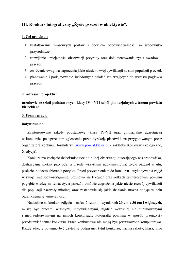 III. Konkurs fotograficzny „Życie pszczół w obiektywie”. 1. Cel projektu : 1. kształtowanie właściwych postaw i poczucia odpowiedzialności za środowisko przyrodnicze, 2. rozwijanie umiejętności obserwacji przyrody oraz dokumentowania życia owadów – pszczół, 3. zwrócenie uwagi na zagrożenia jakie niesie rozwój cywilizacji na stan populacji pszczół, 4. planowanie i podejmowanie świadomych działań zmierzających do wzrostu pogłowia pszczół. 2. Adresaci projektu : uczniowie ze szkół podstawowych klasy IV - VI i szkół gimnazjalnych z terenu powiatu kieleckiego 3. Formy pracy: indywidualna Zainteresowane szkoły podstawowe (klasy IV-VI) oraz gimnazjalne uczestniczą w konkursie, po uprzednim zgłoszeniu przez dyrekcję placówki, na przygotowanym przez organizatora konkursu formularzu (www.powiat.kielce.pl - zakładka Konkursy ekologiczne, X edycja). Konkurs ma zachęcić dzieci/młodzież do pilnej obserwacji otaczającego nas środowiska, dostrzegania piękna przyrody, a przede wszystkim udokumentować życie pszczół w ulu, pasiecie, podczas zbierania pożytku. Przed przystąpieniem do konkursu - wykonywania zdjęć w swojej miejscowości/gminie, uczniowie na lekcjach oraz kółkach zainteresowań, powinni pogłębić wiedzę na temat życia pszczół, omówić zagrożenia jakie niesie rozwój cywilizacji dla populacji pszczoły miodnej oraz zastanowić się jakie działania można podjąć w celu ograniczenia jej umieralności. Nadesłane na konkurs zdjęcia – maks. 2 sztuki o wymiarach 20 cm x 30 cm i większych, muszą być pracami własnymi, indywidualnymi, nigdzie wcześniej nie publikowanymi i nieprzedstawianymi na innych konkursach. Fotografia powinna w sposób przejrzysty przedstawiać temat konkursu. Prace konkursowe nie mogą być przetworzone komputerowo. Każde zdjęcie powinno być czytelnie podpisane: tytuł konkursu, nazwa szkoły, klasa, imię i nazwisko ucznia - autora zdjęcia, imię i nazwisko nauczyciela/opiekuna, telefon kontaktowy. 4. Komisja konkursowa Wyboru najciekawszych prac dokona komisja konkursowa powołana przez Starostę Kieleckiego. 5. Wybór nagrodzonych prac Przy wyborze laureatów – najciekawszych fotografii, komisja będzie kierowała się następującymi kryteriami: 1) trafność doboru tematyki z tematem konkursu, 2) jasność przekazu, 3) możliwość oddziaływania na wyobraźnię, 4) względy estetyczne. 6. Terminy i czas realizacji projektu: 1) ogłoszenie projektu - sierpień 2013 rok, 2) zgłoszenie uczestnictwa - do dnia 8 listopada 2013 roku do Starostwa Powiatowego w Kielcach, Al. IX Wieków 3, 25–516 Kielce, fax. (041) 344-28-25, e-mail: [email protected] [email protected] 3) termin składania fotografii - do dnia 18 kwietnia 2014 roku osobiście do siedziby Starostwa Powiatowego w Kielcach (pokoje numer 212b lub 231) lub na adres jw. 4) wyłonienie pięciu laureatów i wręczenie nagród - do dnia 31 maja 2014 roku. 7. Nagrody indywidualne - drobny sprzęt elektroniczny/radiowy/sportowy/książki o tematyce przyrodniczej I miejsce – nagroda o wartości ok. 300,00 zł II miejsce - nagroda o wartości ok. 250,00 zł III miejsce – nagroda o wartości ok. 200,00 zł 2 wyróżnienia – nagroda o wartości 2 x ok. 150,00 zł = ok. 300,00 zł Łączny koszt nagród: około 1 050,00 zł 8. Uwagi ogólne 1. Organizator zastrzega sobie prawo odwołania projektu, gdy liczba uczestników będzie mniejsza niż 10 uczestników. 2. Fotografie nadesłane na konkurs przechodzą na własność Organizatora. 3. Organizator zastrzega sobie prawo do dysponowania przekazanymi na konkurs fotografiami, w celu promowania własnego wizerunku, poprzez ich publiczne udostępnianie (wystawa w siedzibie Starostwa Powiatowego w Kielcach), publikowanie na portalu internetowym www.powiat.kielce.pl, w mediach informujących o konkursie, folderach, kalendarzu oraz innych materiałach reklamowych. W każdym ww. przypadku, określony zostanie autor fotografii. 4. Zgłoszenie do konkursu jest jednoznaczne z wyrażeniem zgody na przetwarzanie danych osobowych przez Organizatora. 5. Opiekunowie konkursu w okresie trwania Programu edukacji ekologicznej dla powiatu kieleckiego pn. „Dla Ziemi, dla siebie”, w roku szkolnym 2013/2014 dostaną pisemne podziękowania za opiekę merytoryczną nad uczestnikami konkursu. W przypadku, gdy nauczyciel, będzie sprawował opiekę nad uczniami w kilku konkursach, wchodzących w skład ww. Programu, otrzyma tylko jedno podziękowanie - za wszystkie konkursy. Nie dotyczy opiekunów laureatów w danym konkursie. 6. Szkoły zobowiązane są do wypełnienia „Potwierdzenia liczby uczestników Programu” na formularzu znajdującym się na stronie organizatora (www.powiat.kielce.pl - zakładka Konkursy ekologiczne, X edycja), po zrealizowaniu wszystkich konkursów przeznaczonych dla dzieci ze szkół podstawowych. Potwierdzenia należy przedkładać w dniu dostarczania fotografii lub do dnia wręczenia nagród laureatom tj. 31 maja 2014 r.