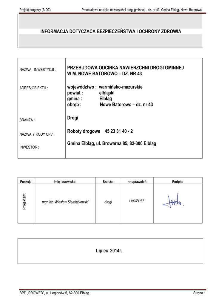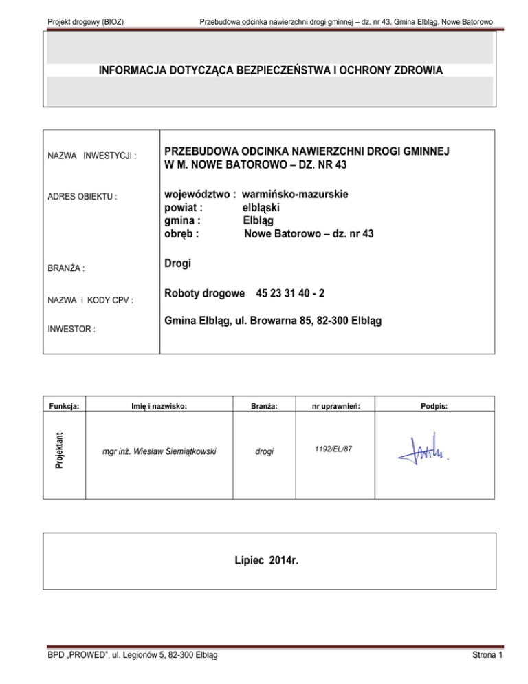 Projekt drogowy (BIOZ) Przebudowa odcinka nawierzchni drogi gminnej – dz. nr 43, Gmina Elbląg, Nowe Batorowo INFORMACJA DOTYCZĄCA BEZPIECZEŃSTWA I OCHRONY ZDROWIA NAZWA INWESTYCJI : województwo : powiat : gmina : obręb : ADRES OBIEKTU : NAZWA i KODY CPV : Projektant Funkcja: warmińsko-mazurskie elbląski Elbląg Nowe Batorowo – dz. nr 43 Drogi BRANśA : INWESTOR : PRZEBUDOWA ODCINKA NAWIERZCHNI DROGI GMINNEJ W M. NOWE BATOROWO – DZ. NR 43 Roboty drogowe 45 23 31 40 - 2 Gmina Elbląg, ul. Browarna 85, 82-300 Elbląg Imię i nazwisko: BranŜa: mgr inŜ. Wiesław Siemiątkowski drogi nr uprawnień: Podpis: 1192/EL/87 Lipiec 2014r. BPD „PROWED”, ul. Legionów 5, 82-300 Elbląg Strona 1 Projekt drogowy (BIOZ) Przebudowa odcinka nawierzchni drogi gminnej – dz. nr 43, Gmina Elbląg, Nowe Batorowo CZĘŚĆ OPISOWA INFORMACJI DOTYCZĄCEJ BEZPIECZEŃSTWA I OCHRONY ZDROWIA DLA ZADANIA PN.: „PRZEBUDOWA ODCINKA NAWIERZCHNI DROGI GMINNEJ W M. NOWE BATOROWO – DZ. NR 43” Na podstawie art. 21a ustawy z dnia 7 lipca 1994r. Prawo budowlane (t.j. Dz. U. z 2013r., poz. 1409 z późn. zm.) oraz Rozporządzenia Ministra Infrastruktury z dnia 23.06.2003r. w sprawie informacji dotyczącej bezpieczeństwa i ochrony zdrowia (Dz. U. z 2003r., Nr 120, poz. 1126), sporządzono poniŜszą informację dotyczącą bezpieczeństwa i ochrony zdrowia. 1. Zakres całego zamierzenia budowlanego oraz kolejność realizacji poszczególnych obiektów: oznakowanie robót wykonanie warstwy wyrównawczej z warstwy kruszywa łamanego o gr. 10 cm wykonanie warstwy z betonu asfaltowego SMA-16 KR-2 o gr. 6 cm (jezdnia) wykonanie warstwy wiąŜącej z betonu asfaltowego AC-16 W, KR-2 gr. 4 cm (zjazdy) wykonanie warstwy ścieralnej z betonu asfaltowego AC-11 S, KR-2 gr. 4 cm (zjazdy) 2. Wykaz istniejących obiektów budowlanych. Na przebudowywanym odcinku znajduje się jezdnia o nawierzchni z płyt drogowych Ŝelbetowych pełnych gr.16 cm i średniej szerokości 5,0 m o zdegradowanej strukturze, a na terenie opracowania nie występują obiekty budowlane. 3. Elementy zagospodarowania działki lub terenu, które mogą stwarzać zagroŜenie bezpieczeństwa i zdrowia ludzi. ZagroŜenie bezpieczeństwa i zdrowia ludzi, będzie stwarzał ruch kołowy samochodów osobowych i cięŜarowych oraz specjalistyczny sprzęt budowlany (koparko-ładowarki, walce, układarki mas bitumicznych), podczas wykonywania robót. 4. Przewidywane zagroŜenia występujące podczas realizacji robót budowlanych określające skalę i rodzaje zagroŜeń oraz miejsce i czas występowania. Podczas realizacji zadania mogą wystąpić następujące zagroŜenia: podczas wykonywania warstwy wyrównawczej za pomocą specjalistycznego sprzętu budowlanego, naleŜy zwrócić szczególną uwagę na osoby zatrudnione przy wykonywaniu tych prac; przy wykonywaniu robót wykończeniowych, naleŜy zwrócić szczególną uwagę na fakt, iŜ roboty te, będą wykonywane w bezpośrednim sąsiedztwie ruchu kołowego. 5. Sposób prowadzenia instruktaŜu pracowników przed przystąpieniem do robót szczególnie niebezpiecznych. BPD „PROWED”, ul. Legionów 5, 82-300 Elbląg Strona 2 Projekt drogowy (BIOZ) Przebudowa odcinka nawierzchni drogi gminnej – dz. nr 43, Gmina Elbląg, Nowe Batorowo Ze względu na charakter robót, instruktaŜ ogólny musi być prowadzony przed przystąpieniem do pracy oraz instruktaŜ stanowiskowy, osobny dla obsługi poszczególnych maszyn i urządzeń, które będą stosowane w trakcie budowy i musi obejmować następujące elementy: InstruktaŜ ogólny obejmujący: przekazanie pracownikom, jaki zakres i rodzaj robót będzie wykonywany, rozdział zadań i odpowiedzialność dla poszczególnych pracowników; zapoznanie pracowników z zagroŜeniami mogącymi występować podczas realizacji robót; wyznaczenie stref zagroŜeń; zapoznanie pracowników z organizacją robót oraz organizacją transportu materiałów i organizacją komunikacji; sprawdzenie i ewentualne uzupełnienie wyposaŜenia pracowników w sprzęt ochrony osobistej oraz odzieŜ ochronną; sprawdzenie sprawności i stanu technicznego sprzętu i narzędzi wykorzystywanych do wykonania robót; przeszkolenie pracowników w zakresie posługiwania się sprzętem i narzędziami; określenie zasad i sposobu zabezpieczenia terenu realizacji robót przed dostępem osób postronnych; instruktaŜ w zakresie przestrzegania zasad bhip, dotyczących realizacji robót i uŜywania sprzętu budowlanego. InstruktaŜ stanowiskowy obejmuje: sprawdzenie i uzupełnienie w miarę potrzeb wyposaŜenia pracowników w niezbędny dla poszczególnych stanowisk, sprzęt ochrony osobistej oraz odzieŜ ochronną; sprawdzenie sprawności i stanu technicznego sprzętu i narzędzi wykorzystywanych do wykonania robót, zapoznanie pracownika z instrukcją obsługi urządzenia, do którego został przydzielony; przeszkolenie pracowników w zakresie posługiwania się sprzętem i narzędziami ze szczególnym zwróceniem uwagi na prawidłowe ich uŜytkowanie; instruktaŜ w zakresie przestrzegania zasad bhip dotyczących powierzonego do uŜytkowania sprzętu budowlanego oraz sposobu sprawdzenia jego sprawności zabezpieczeń przed naraŜeniem zdrowia i Ŝycia podczas obsługi. 6. Środki techniczne i organizacyjne zapobiegające niebezpieczeństwom wynikającym z wykonywania robót budowlanych w strefach szczególnego zagroŜenia zdrowia lub w ich bezpośrednim sąsiedztwie, w tym zapewniających bezpieczną i sprawną komunikację umoŜliwiającą szybką ewakuację na wypadek poŜaru, awarii i innych zagroŜeń. BPD „PROWED”, ul. Legionów 5, 82-300 Elbląg Strona 3 Projekt drogowy (BIOZ) Przebudowa odcinka nawierzchni drogi gminnej – dz. nr 43, Gmina Elbląg, Nowe Batorowo Środki techniczne. Wszyscy pracownicy zatrudnieni podczas realizacji tego zadania, powinni mieć aktualne badania lekarskie dopuszczające ich do pracy na danym stanowisku oraz niezbędne uprawnienia i zaświadczenia. Wszyscy 