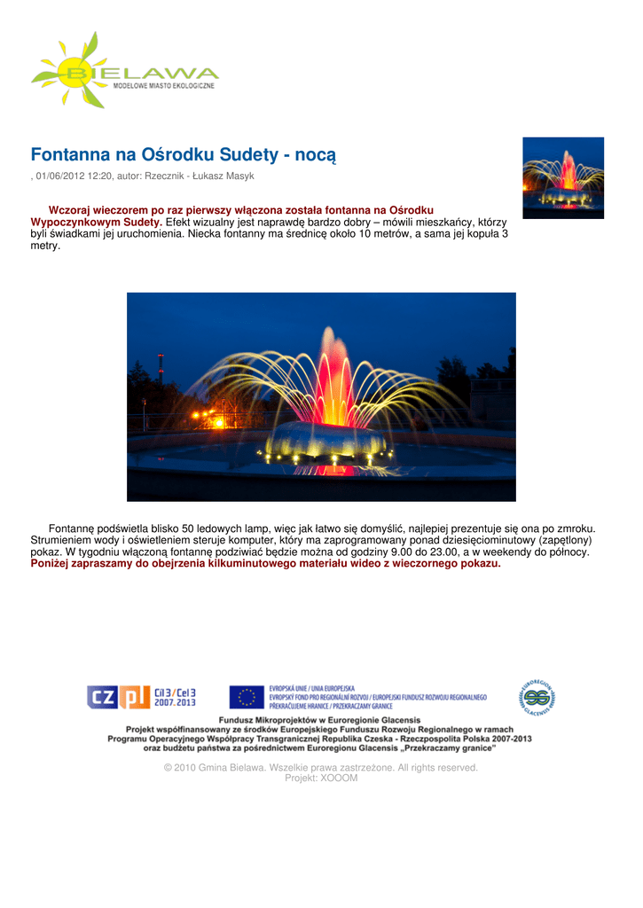 Fontanna na Ośrodku Sudety - nocą , 01/06/2012 12:20, autor: Rzecznik - Łukasz Masyk Wczoraj wieczorem po raz pierwszy włączona została fontanna na Ośrodku Wypoczynkowym Sudety. Efekt wizualny jest naprawdę bardzo dobry – mówili mieszkańcy, którzy byli świadkami jej uruchomienia. Niecka fontanny ma średnicę około 10 metrów, a sama jej kopuła 3 metry. Fontannę podświetla blisko 50 ledowych lamp, więc jak łatwo się domyślić, najlepiej prezentuje się ona po zmroku. Strumieniem wody i oświetleniem steruje komputer, który ma zaprogramowany ponad dziesięciominutowy (zapętlony) pokaz. W tygodniu włączoną fontannę podziwiać będzie można od godziny 9.00 do 23.00, a w weekendy do północy. Poniżej zapraszamy do obejrzenia kilkuminutowego materiału wideo z wieczornego pokazu. © 2010 Gmina Bielawa. Wszelkie prawa zastrzeżone. All rights reserved. Projekt: XOOOM