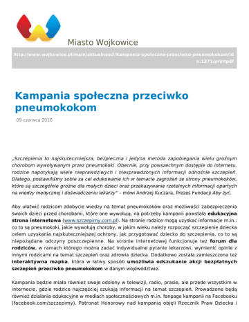 Miasto Wojkowice http://www.wojkowice.pl/main/aktualnosci/Kampania-spoleczna-przeciwko-pneumokokom/id n:1371/printpdf Kampania społeczna przeciwko pneumokokom 09 czerwca 2016 kategoria: Wojkowice „Szczepienia to najskuteczniejsza, bezpieczna i jedyna metoda zapobiegania wielu groźnym chorobom wywoływanym przez pneumokoki. Obecnie, przy powszechnym dostępie do internetu, rodzice napotykają wiele nieprawdziwych i niesprawdzonych informacji odnośnie szczepień. Dlatego, postawiliśmy sobie za cel edukowanie ich w temacie zagrożeń ze strony pneumokoków, które są szczególnie groźne dla małych dzieci oraz przekazywanie rzetelnych informacji opartych na wiedzy medycznej i doświadczeniu lekarzy” – mówi Andrzej Kuczara, Prezes Fundacji Aby żyć. Aby ułatwić rodzicom zdobycie wiedzy na temat pneumokoków oraz możliwości zabezpieczenia swoich dzieci przed chorobami, które one wywołują, na potrzeby kampanii powstała edukacyjna strona internetowa (www.szczepimy.com.pl). Na stronie rodzice mogą uzyskać informacje m.in.: co to są pneumokoki, jakie wywołują choroby, w jakim wieku należy rozpocząć szczepienie dziecka celem uzyskania najskuteczniejszej ochrony, jak przygotować dziecko do szczepienia, co to są niepożądane odczyny poszczepienne. Na stronie internetowej funkcjonuje też forum dla rodziców, w ramach którego można zadać indywidualne pytanie lekarzowi, wymienić opinie z innymi rodzicami na temat szczepień oraz zdrowia dziecka. Dodatkowo została zamieszczona też interaktywna mapka, która w łatwy sposób umożliwia odszukanie akcji bezpłatnych szczepień przeciwko pneumokokom w danym województwie. Kampania będzie miała również swoje odsłony w telewizji, radio, prasie, ale przede wszystkim w internecie, gdzie rodzice najczęściej szukają informacji na temat szczepień. Prowadzone będą również działania edukacyjne w mediach społecznościowych m.in. fanpage kampanii na Facebooku (facebook.com/szczepimy). Patronat Honorowy nad kampanią objęli Rzecznik Praw Dziecka i Główny Inspektor Sanitarny oraz towarzystwa naukowe. Pneumokoki to jedne z bakterii najgroźniejszych dla zdrowia i życia małych dzieci, zwłaszcza do 2. roku życia, kiedy ich układ odpornościowy nie jest jeszcze dostatecznie wykształcony. Szczepiąc swoje maluchy przeciwko pneumokokom, rodzice mogą uchronić je przed poważnymi konsekwencjami choroby pneumokokowej, jak głuchota, padaczka, niedowłady, opóźnienie rozwoju psychoruchowego, a nawet zgon. Szczepienia przeciwko pneumokokom wskazywane są przez ekspertów medycznych jako najważniejsze z listy szczepień zalecanych i powinny być wybierane przez rodziców w pierwszej kolejności. Zgodnie z zaleceniami Programu Szczepień Ochronnych szczepienia przeciwko pneumokokom należy rozpocząć od 2 miesiąca życia dziecka. A o szczepienie najlepiej zapytać swojego lekarza pediatrę. Pneumokoki (Streptococcus pneumoniae, czyli dwoinka zapalenia płuc) należą do bakterii najbardziej rozpowszechnionych w naszym środowisku. Są jedną z głównych przyczyn zakażeń dróg oddechowych u ludzi. Najczęściej bakterie te wywołują zakażenia nieinwazyjne, takie jak zapalenie ucha środkowego, zatok, a także oskrzeli i płuc. Najgroźniejsza jest jednak inwazyjna choroba pneumokokowa (IChP), która rozwija się wówczas, gdy bakterie docierają do miejsc fizjologicznie jałowych, takich jak krew, płyn mózgowo-rdzeniowy, jama opłucnej. IChP może przybrać postać zapalenia płuc z bakteriemią (zakażenie krwi bakteriami), zapalenia opon mózgowo-rdzeniowych i sepsy. Jej przebieg może być bardzo gwałtowny – z zaburzeniami świadomości, niewydolnością oddechową, a po przebytej chorobie mogą pojawić się powikłania: osłabienie słuchu lub głuchota, padaczka, niedowład, porażenie, opóźnienie rozwoju psychoruchowego. Eksperci są zgodni, że najlepszą metodą na to, by uchronić swoje dziecko przed IChP, jej groźnymi powikłaniami z jej powodu jest zaszczepienie go przeciwko pneumokokom. Światowa Organizacja Zdrowia (WHO) rekomenduje wprowadzenie szczepień przeciwko pneumokokom we wszystkich krajach. Zakażenia tymi bakteriami są bowiem jedną z głównych przyczyn zachorowalności i umieralności małych dzieci na świecie. Dodatkowy problem stanowi to, że pojawia się coraz więcej szczepów pneumokoków opornych na znane antybiotyki, takie jak penicylina. Więcej informacji: Fundacja Aby żyć ul. Mogilska 40, 31-546 Kraków tel. 661 397 839 [email protected]; www.abyzyc.pl D&D Communication Renata Obuchowska tel. 500 210 107, [email protected]