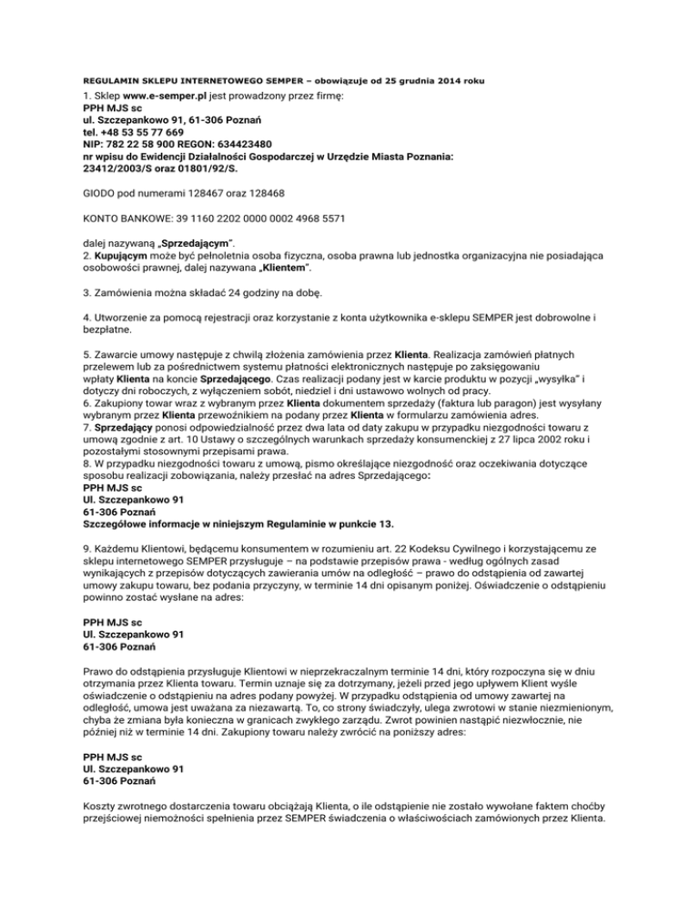REGULAMIN SKLEPU INTERNETOWEGO SEMPER – obowiązuje od 25 grudnia 2014 roku 1. Sklep www.e-semper.pl jest prowadzony przez firmę: PPH MJS sc ul. Szczepankowo 91, 61-306 Poznań tel. +48 53 55 77 669 NIP: 782 22 58 900 REGON: 634423480 nr wpisu do Ewidencji Działalności Gospodarczej w Urzędzie Miasta Poznania: 23412/2003/S oraz 01801/92/S. GIODO pod numerami 128467 oraz 128468 KONTO BANKOWE: 39 1160 2202 0000 0002 4968 5571 dalej nazywaną „Sprzedającym”. 2. Kupującym może być pełnoletnia osoba fizyczna, osoba prawna lub jednostka organizacyjna nie posiadająca osobowości prawnej, dalej nazywana „Klientem”. 3. Zamówienia można składać 24 godziny na dobę. 4. Utworzenie za pomocą rejestracji oraz korzystanie z konta użytkownika e-sklepu SEMPER jest dobrowolne i bezpłatne. 5. Zawarcie umowy następuje z chwilą złożenia zamówienia przez Klienta. Realizacja zamówień płatnych przelewem lub za pośrednictwem systemu płatności elektronicznych następuje po zaksięgowaniu wpłaty Klienta na koncie Sprzedającego. Czas realizacji podany jest w karcie produktu w pozycji „wysyłka” i dotyczy dni roboczych, z wyłączeniem sobót, niedziel i dni ustawowo wolnych od pracy. 6. Zakupiony towar wraz z wybranym przez Klienta dokumentem sprzedaży (faktura lub paragon) jest wysyłany wybranym przez Klienta przewoźnikiem na podany przez Klienta w formularzu zamówienia adres. 7. Sprzedający ponosi odpowiedzialność przez dwa lata od daty zakupu w przypadku niezgodności towaru z umową zgodnie z art. 10 Ustawy o szczególnych warunkach sprzedaży konsumenckiej z 27 lipca 2002 roku i pozostałymi stosownymi przepisami prawa. 8. W przypadku niezgodności towaru z umową, pismo określające niezgodność oraz oczekiwania dotyczące sposobu realizacji zobowiązania, należy przesłać na adres Sprzedającego: PPH MJS sc Ul. Szczepankowo 91 61-306 Poznań Szczegółowe informacje w niniejszym Regulaminie w punkcie 13. 9. Każdemu Klientowi, będącemu konsumentem w rozumieniu art. 22 Kodeksu Cywilnego i korzystającemu ze sklepu internetowego SEMPER przysługuje – na podstawie przepisów prawa - według ogólnych zasad wynikających z przepisów dotyczących zawierania umów na odległość – prawo do odstąpienia od zawartej umowy zakupu towaru, bez podania przyczyny, w terminie 14 dni opisanym poniżej. Oświadczenie o odstąpieniu powinno zostać wysłane na adres: PPH MJS sc Ul. Szczepankowo 91 61-306 Poznań Prawo do odstąpienia przysługuje Klientowi w nieprzekraczalnym terminie 14 dni, który rozpoczyna się w dniu otrzymania przez Klienta towaru. Termin uznaje się za dotrzymany, jeżeli przed jego upływem Klient wyśle oświadczenie o odstąpieniu na adres podany powyżej. W przypadku odstąpienia od umowy zawartej na odległość, umowa jest uważana za niezawartą. To, co strony świadczyły, ulega zwrotowi w stanie niezmienionym, chyba że zmiana była konieczna w granicach zwykłego zarządu. Zwrot powinien nastąpić niezwłocznie, nie później niż w terminie 14 dni. Zakupiony towaru należy zwrócić na poniższy adres: PPH MJS sc Ul. Szczepankowo 91 61-306 Poznań Koszty zwrotnego dostarczenia towaru obciążają Klienta, o ile odstąpienie nie zostało wywołane faktem choćby przejściowej niemożności spełnienia przez SEMPER świadczenia o właściwościach zamówionych przez Klienta. Prawo do odstąpienia od umowy przez Klienta jest wyłączone w przypadku towarów (usług) wykraczających poza standardową ofertę sklepu, przygotowanych na specjalne zamówienie klienta i dostosowanych do jego indywidualnych potrzeb. 10. Wszystkie ceny podawane przez Sprzedającego wyrażone są w polskiej walucie i są cenami brutto (zawierają podatek VAT). Ceny towarów nie zawierają kosztu dostawy, który określony jest w cenniku dostaw, chyba że Sprzedawca w ramach odrębnych warunków promocji zgodzi się ponieść takie koszty. Sklep internetowy SEMPER standardowo realizuje zamówienia wysyłane na teren RP, krajów europejskich oraz Rosji. W przypadku zamówienia dostawy do miejsca docelowego leżącego poza granicami Państw Członkowskich Unii Europejskiej, należna cena zakupionych towarów ulegnie odpowiedniemu zwiększeniu o wartość należnych opłat celnych. 11. Na łączny czas oczekiwania na otrzymanie przez Klienta danego Produktu (czas dostawy) składa się czas realizacji zamówienia przez Sprzedającego oraz czas dostarczenia Produktu przez przewoźnika. Czas realizacji zamówienia przez Sprzedającego liczony jest od momentu zawarcia Umowy Sprzedaży do momentu przekazania przez Sprzedającego przesyłki zawierającej towary przewoźnikowi. Do powyższego czasu należy doliczyć czas dostarczenia towaru przez przewoźnika, który prezentowany jest w zakładce: www.e-semper.pl/pl/i/KosztyDostawy/10 Dodatkowo termin spełnienia świadczenia zostanie podany w e-mailu potwierdzającym złożone zamówienie. 12. Sprzedający zobowiązuje się do ochrony danych osobowych zgodnie z ustawą o ochronie danych osobowych z 29.08.1997 r (Dz. U. Nr 133, poz. 883) oraz Ustawą o świadczeniu usług drogą elektroniczną (Dz. U. Nr 144, poz. 1204). Klient podając przy składaniu zamówienia swoje dane osobowe Sprzedającemu wyraża zgodę na ich przetwarzanie przez Sprzedającego w celu realizacji złożonego zamówienia. Klient ma w każdej chwili możliwość wglądu, poprawiania, aktualizacji oraz usuwania swoich danych osobowych. 13. Na Sprzedawcy ciąży prawny obowiązek dostarczenia towaru bez wad. Sprzedawca jest zobowiązany wobec Kupującego jeżeli sprzedany produkt ma wadę fizyczną lub prawną(rękojmia). Jeżeli otrzymany towar okazał się wadliwy należy niezwłocznie po zauważeniu wady wydrukować i wypełnić formularz rejestracyjny znajdujący się w zakładce: Reklamacja_formularz.pdf Wypełniony formularz, wadliwy produkt oraz w miarę możliwości paragon potwierdzający zakup produktu należy odesłać na adres: PPH MJS