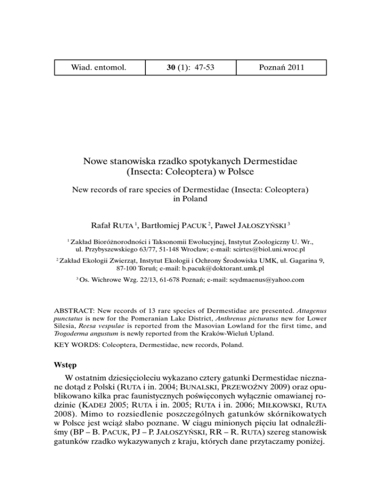 Wiad. entomol. 30 (1): 47-53 Poznań 2011 Nowe stanowiska rzadko spotykanych Dermestidae (Insecta: Coleoptera) w Polsce New records of rare species of Dermestidae (Insecta: Coleoptera) in Poland Rafał RUTA 1, Bartłomiej PACUK 2, Paweł JAŁOSZYŃSKI 3 1 2 Zakład Bioróżnorodności i Taksonomii Ewolucyjnej, Instytut Zoologiczny U. Wr., ul. Przybyszewskiego 63/77, 51-148 Wrocław; e-mail: [email protected] Zakład Ekologii Zwierząt, Instytut Ekologii i Ochrony Środowiska UMK, ul. Gagarina 9, 87-100 Toruń; e-mail: [email protected] 3 Os. Wichrowe Wzg. 22/13, 61-678 Poznań; e-mail: [email protected] ABSTRACT: New records of 13 rare species of Dermestidae are presented. Attagenus punctatus is new for the Pomeranian Lake District, Anthrenus picturatus new for Lower Silesia, Reesa vespulae is reported from the Masovian Lowland for the first time, and Trogoderma angustum is newly reported from the Kraków-Wieluń Upland. KEY WORDS: Coleoptera, Dermestidae, new records, Poland. Wstęp W ostatnim dziesięcioleciu wykazano cztery gatunki Dermestidae nieznane dotąd z Polski (RUTA i in. 2004; BUNALSKI, PRZEWOŹNY 2009) oraz opublikowano kilka prac faunistycznych poświęconych wyłącznie omawianej rodzinie (KADEJ 2005; RUTA i in. 2005; RUTA i in. 2006; MIŁKOWSKI, RUTA 2008). Mimo to rozsiedlenie poszczególnych gatunków skórnikowatych w Polsce jest wciąż słabo poznane. W ciągu minionych pięciu lat odnaleźliśmy (BP – B. PACUK, PJ – P. JAŁOSZYŃSKI, RR – R. RUTA) szereg stanowisk gatunków rzadko wykazywanych z kraju, których dane przytaczamy poniżej. 48 R. RUTA, B. PACUK, P. JAŁOSZYŃSKI Dziękujemy Dawidowi MARCZAKOWI (Kampinoski PN) za przekazanie danych dotyczących stanowiska Reesa vespulae (MILL.) w Izabelinie. Wykaz gatunków Dermestes bicolor FABRICIUS, 1781 – Nizina Wielkopolsko-Kujawska: Toruń - Bielany (CD37), IV 2009 – 1 ex., 28 IV 2009 – 1 ex., na ścianie budynku Wydziału Biologii i Nauk o Ziemi UMK, 17 VI 2010 – 1 ex., na półpiętrze nad Zakładem Ekologii Zwierząt UMK, w pajęczynie na oknie, leg. BP; Nowy Duninów (CD92), 12 VI 2009 – 1 ex. przy budynku mieszkalnym, pod kamieniem na trawniku, leg. BP. Gatunek związany z gniazdami ptaków (BURAKOWSKI i in. 1986; KADEJ 2005). Na stanowisku w Toruniu zasiedla prawdopodobnie noclegowisko gołębi miejskich (Columba livia GMEL. f. domestica), znajdujące się na dachu budynku Wydziału Biologii i Nauk o Ziemi UMK. Na stanowisku w Nowym Duninowie jego obecność związana jest być może ze znajdującym się w pobliżu kurnikiem. Gatunek w Polsce dość rzadko spotykany, podawany z ośmiu krain (BURAKOWSKI i in. 1986; RUTA i in. 2005). Z Niziny Wielkopolsko-Kujawskiej znany dotychczas z czterech stanowisk (RUTA i in. 2005). Trinodes hirtus (FABRICIUS, 1781) – Pojezierze Pomorskie: Górka Klasztorna (XV40) ad Łobżenica, 8 VI 2007 – 1 ex. na starym dębie w parku przyklasztornym, leg. RR. – Nizina Wielkopolsko-Kujawska: rez. „Borek” (XU68) ad Samostrzel, 20 VIII 2005 – 1 ex. (larwa) na starym dębie, obs. RR; Maniewo vic. (XU22) ad Poznań, poligon wojskowy, 25 VII 1999 – 1 larwa pod korą starego dębu, imago wyhodowane II 2000, leg. et cult. PJ. – Wzgórza Trzebnickie: Bagno (XS28) ad Oborniki Śląskie, VIII 2008 – 1 ex., leg. RR. – Dolny Śląsk: Wrocław - Świniary (XS37), 19 VI 2010 – 1 ex. w pajęczynie na starym dębie, leg. RR. Gatunek od ponad 100 lat nie był wykazywany ze Wzgórz Trzebnickich (BURAKOWSKI i in. 1986). Attagenus punctatus (SCOPOLI, 1772) – Pojezierze Pomorskie: Bielinek nad Odrą (VU46), 28 VI 2010 – 1 larwa pod korą buka, imago wyhodowane 30 VII 2010, leg. et cult. RR. Rzadko łowiony gatunek, znany z nielicznych stanowisk w kraju. Gatunek nowy dla Pojezierza Pomorskiego. NOWE STANOWISKA RZADKO SPOTYKANYCH DERMESTIDAE W POLSCE 49 Attagenus smirnovi ZHANTIEV, 1973 – Nizina Wielkopolsko-Kujawska: Toruń - Os. Zieleniec (CD37), 12 IX 2008 – 1 ex. 28 IX 2008 – 1 ex., 11 X 2008 – 1 ex. w mieszkaniu, leg. BP; Toruń Os. Dekerta (CD37), I Urząd Skarbowy, 10 VI 2010 – 1 ex. na parapecie klatki schodowej, leg. BP; Toruń - Os. Chrobrego (CD47), 5 VII 2010 – 4 exx., na parapecie klatki schodowej, 1 ex., na parapecie w mieszkaniu, 6 VII 2010 – 2 exx., 7 VII 2010 – 1 ex., 9 VII 2010 – 1 ex., 26 VII 2010 – 2 exx., 28 VII 2010 – 1 ex., 8 VIII 2010 – 1 ex., na parapecie klatki schodowej, leg. BP; Kępa Dzikowska ad Ciechocinek (CD56), 14 II 2010 – 1 ex. na skarpie nad Wisłą, w pajęczynie pod korą topoli Populus sp., leg. BP. Gatunek niedawno wykazany z Polski (RUTA i in. 2004), spotykany w warunkach synantropijnych, głównie w dużych miastach. Z Niziny Wielkopolsko-Kujawskiej znany dotąd tylko z Poznania. Z terenu Polski nie wykazywany dotychczas w środowisku naturalnym. Anthrenus olgae KALIK, 1946 – Nizina Wielkopolsko-Kujawska: Toruń - Bielany (CD37), pomieszczenia Zakładu Ekologii Zwierząt Wydziału Biologii i Nauk o Ziemi UMK, na parapetach: 11 III 2009 – 1 ex., 6 IV 2009 – 1 ex., 8 IV 2009 – 1 ex., 23 IV 2009 – 11 exx., 10 V 2009 – 7 exx., 14 V 2009 – 30 exx., 23 IV 2010 – 1 ex., 10 V 2010 – 22 exx., 11 V 2010 – 2 exx., 18 V 2010 – 11 exx., 20 V 2010 – 4 exx., 21 V 2010 – 7 exx., 24 V 2010 – 8 exx., 1 VI 2010 – 2 exx., 10 VI 2010 – 1 ex., 15 VI 2010 – 15 exx., 17 VI 2010 – 9 exx., 18 VI 2010 – 4 exx., 19 VI 2010 – 1 ex., leg. BP; Toruń - Os. Chrobrego (CD47), 4 VII 2010 – 1 ex., na parapecie w mieszkaniu, leg. BP. – Wyżyna Krakowsko-Wieluńska: Ojców (DA16), „Hotel pod Kazimierzem”, 19 V 2006 – 8 exx., w budynku, leg. RR. Gatunek spotykany w nieużytkowanych częściach budynków, zajmowanych przez gołębie, skąd imagines rozprzestrzeniają się na sąsiednie pomieszczenia (RUTA i in. 2006). Wyjaśnia to jego liczne występowanie na stanowisku Toruń - Bielany, gdyż na dachu budynku, bezpośrednio nad pomieszczeniami Zakładu Ekologii Zwierząt, znajduje się
